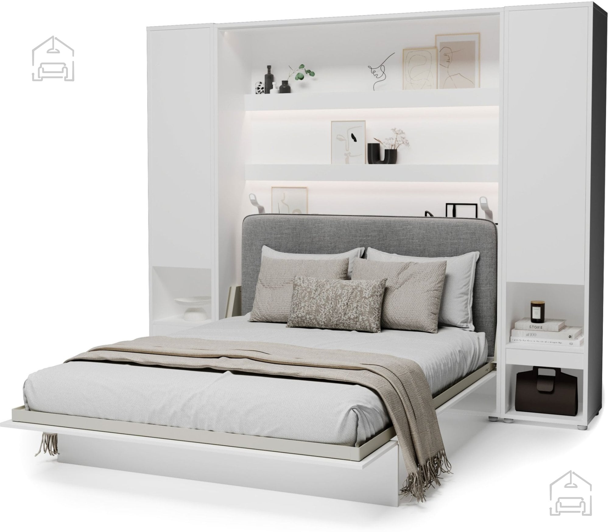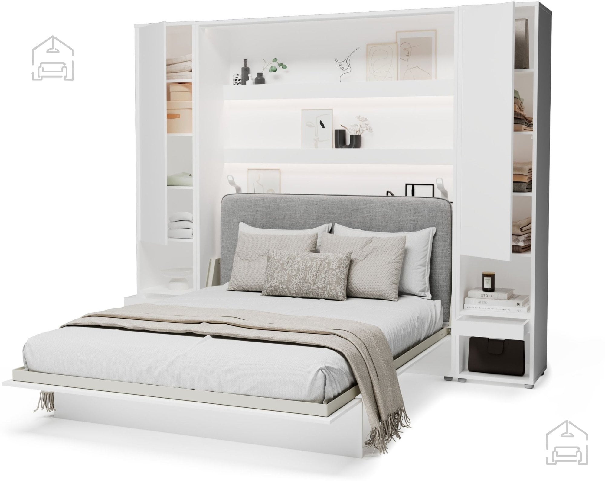 Komplet: Postelja v omari BC-12 - 160x200 cm - bela, vzglavje BC-17 sivo, LED luč, 2x omara BC-07 - bela, 2x LED luč z USB, Vzmetnica Pocket Roll mini cocos - 160x200 cm