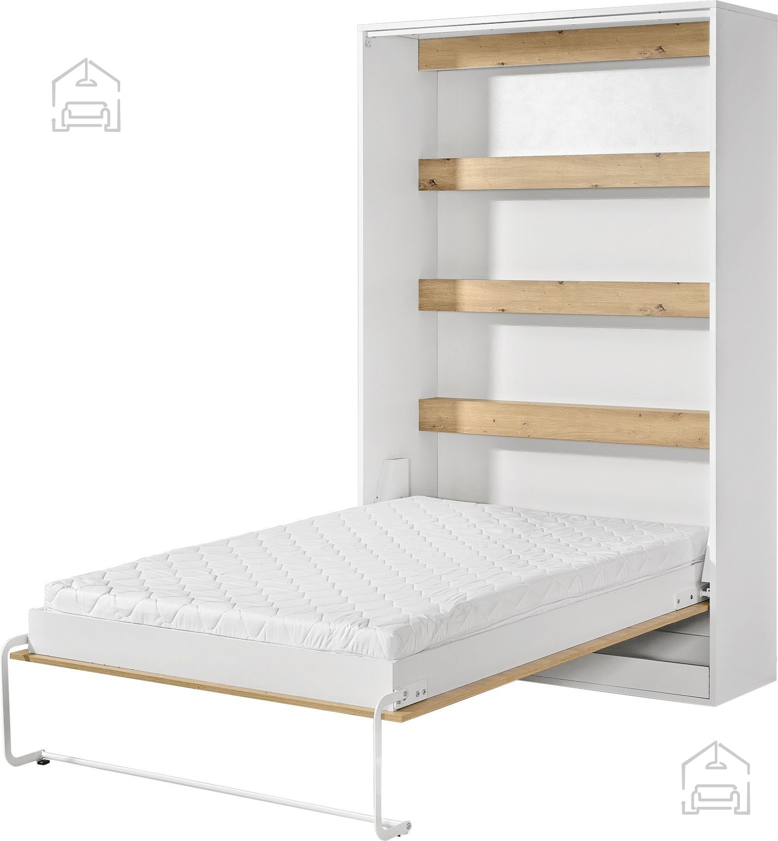 Celoten element meri 139x239,2x225,2 cm, kar omogoča udobno ležišče ob optimalni porabi prostora. Pokončna postelja v omari je še posebej primerna za garsonjere, mladinske sobe, delovne prostore ali počitniške apartmaje, kjer je vsak kvadratni meter dragocen. Ko je postelja zložena, se prostor spremeni v urejeno sobo z minimalističnim videzom in brez navlake.