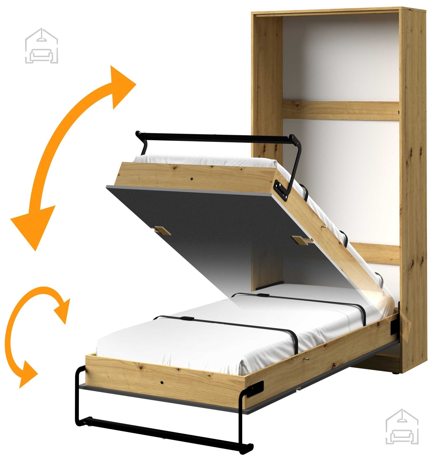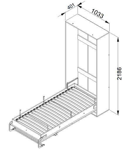 Celoten kos meri 103,3x40,1x218,6 cm, zato se postelja elegantno zlije s prostorom in deluje kot popolnoma običajna omara. Ko je zaprta, zasede le 40,1 cm globine, kar omogoča neoviran prehod in občutek prostornosti v sobi. Po odprtju se razkrije udobno ležišče standardne velikosti 90 x 200 cm, primerno za eno osebo. Takšna zasnova omogoča optimalno rabo prostora, zlasti v manjših stanovanjih ali sobah za goste.
