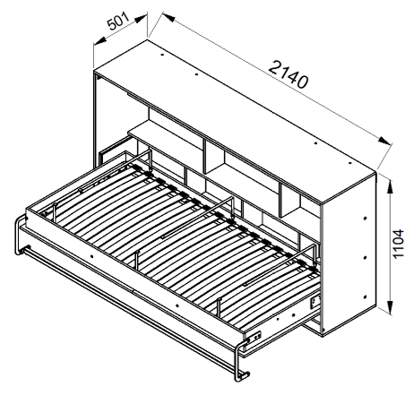 Postelja v omari ima zunanje mere 214×50,1×110,4 cm, kar omogoča, da se enostavno prilega manjšim spalnicam, garsonjeram ali sobam za goste. Kljub kompaktnim meram je ležišče standardne velikosti 90×200 cm, zato nudi dovolj prostora za udoben počitek. Postelja je zasnovana tako, da se zloži vodoravno, kar pomeni, da po zlaganju zavzame minimalno globino in pusti več prostega prostora v prostoru.