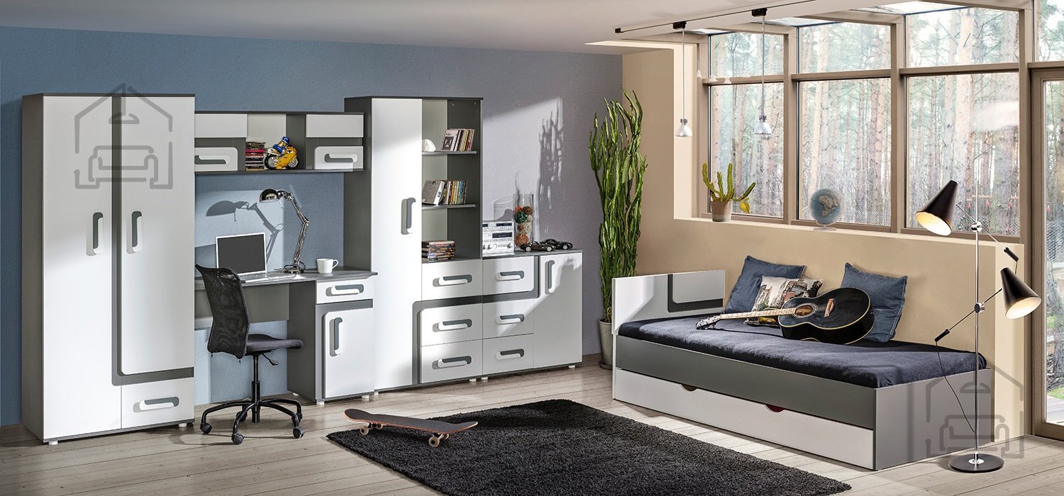 Korpus predala je v antracitni barvi, fronta pa v beli, kar ustvarja elegantno barvno ravnovesje. Ročaji so izdelani iz kakovostne umetne mase v kombinaciji bela/antracit, kar daje izdelku sodoben videz in hkrati zagotavlja enostavno odpiranje. Takšna barvna kombinacija omogoča brezhibno ujemanje z različnimi posteljnimi okvirji in notranjimi stili – od klasičnih do modernih.