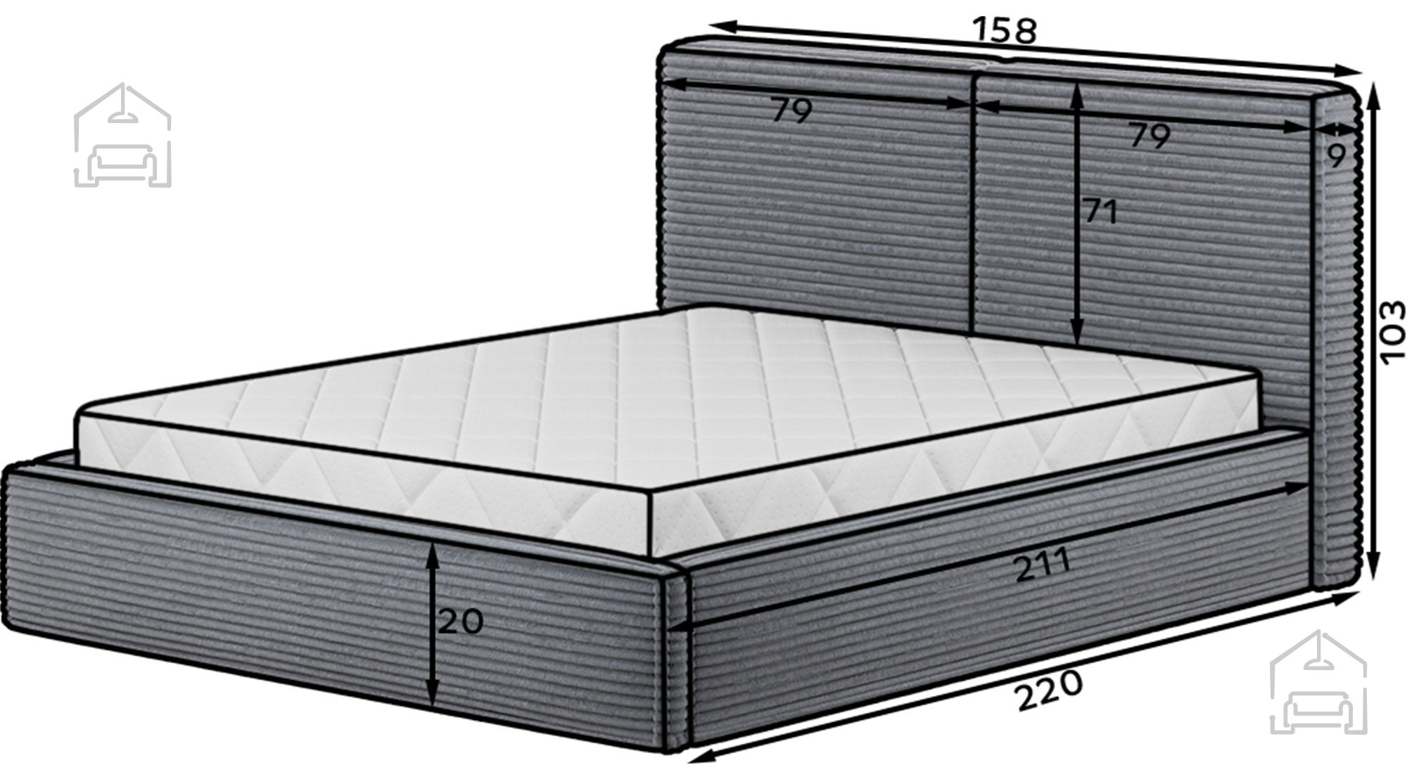 Celotna dolžina postelje znaša 220 cm, višina vzglavja pa 103 cm. Glede na izbrano različico je ležalna površina na voljo v treh dimenzijah: 140x200 cm, 160x200 cm in 180x200 cm. Širina postelje se tako spreminja glede na model in omogoča optimalno prilagoditev prostoru. Kljub sodobni obliki postelja ohranja kompaktnost, zato se lepo prilega tako večjim kot tudi manjšim spalnicam.