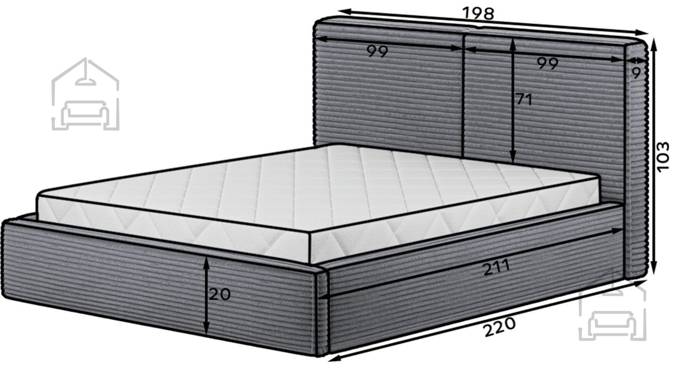 Celotna dolžina postelje znaša 220 cm, višina vzglavja pa 103 cm. Glede na izbrano različico je ležalna površina na voljo v treh dimenzijah: 140x200 cm, 160x200 cm in 180x200 cm. Širina postelje se tako spreminja glede na model in omogoča optimalno prilagoditev prostoru. Kljub sodobni obliki postelja ohranja kompaktnost, zato se lepo prilega tako večjim kot tudi manjšim spalnicam.