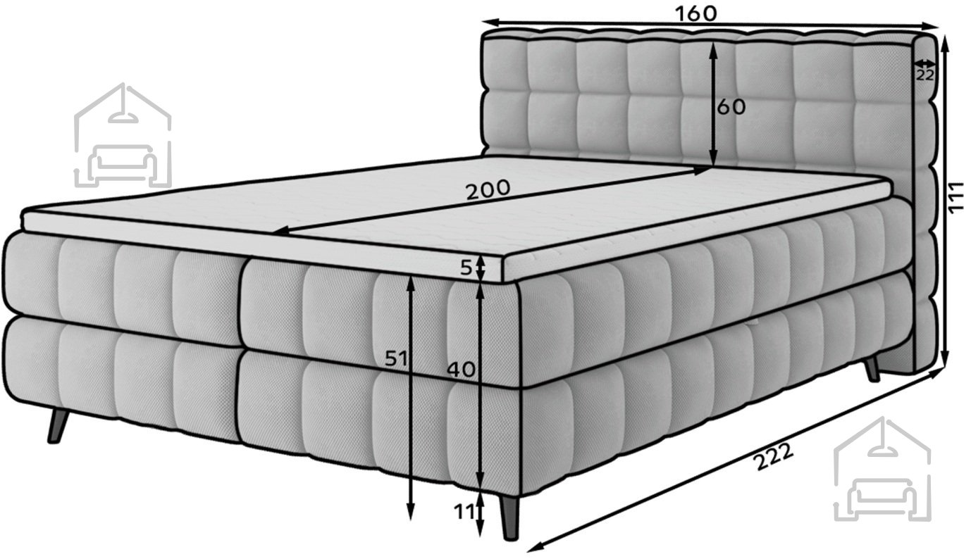 Boxspring postelja Sabeno znamke Eltap je sodoben in funkcionalen kos pohištva, ki združuje udobje, kakovost in estetsko dovršenost. Izdelana je v Poljski, v tovarni Eltap, in je zasnovana za uporabnike, ki cenijo brezčasen dizajn ter praktične rešitve. S celotnimi zunanjimi dimenzijami 160x222x111 cm in ležalno površino, ki je na voljo v širini 160 cm ter dolžini 200 cm, se model Sabeno prilagaja različnim prostorskim možnostim in potrebam po udobju.