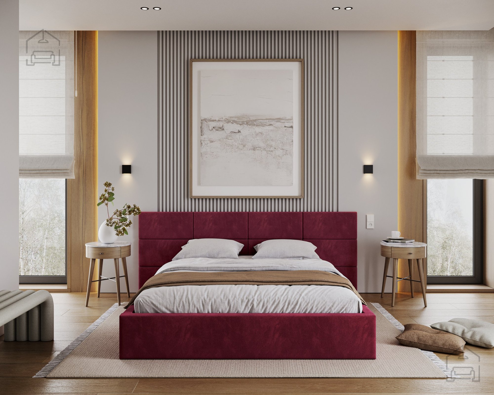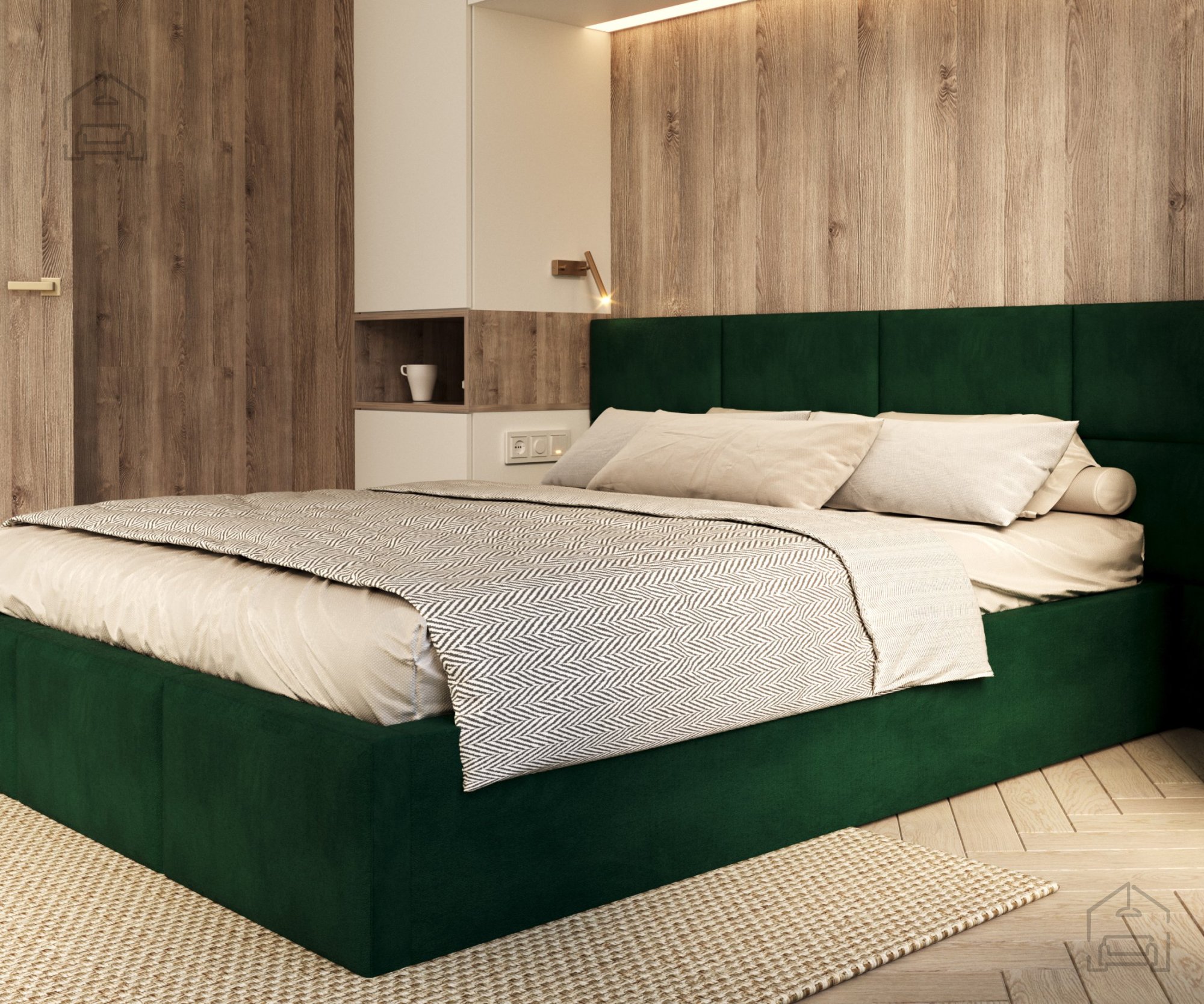 Poseben poudarek je namenjen vzglavju, ki ga sestavljajo posamezne kvadratne blazine, namenjene montaži na steno. Ta zasnova omogoča prilagoditev višine in razmika, kar ne le izboljša udobje pri branju ali gledanju televizije, temveč tudi estetsko obogati spalni prostor. Vodoravno prešiti elementi in mehka oblazinjenost poskrbijo za prijeten občutek topline in domačnosti, ne glede na izbrano barvo tkanine.
