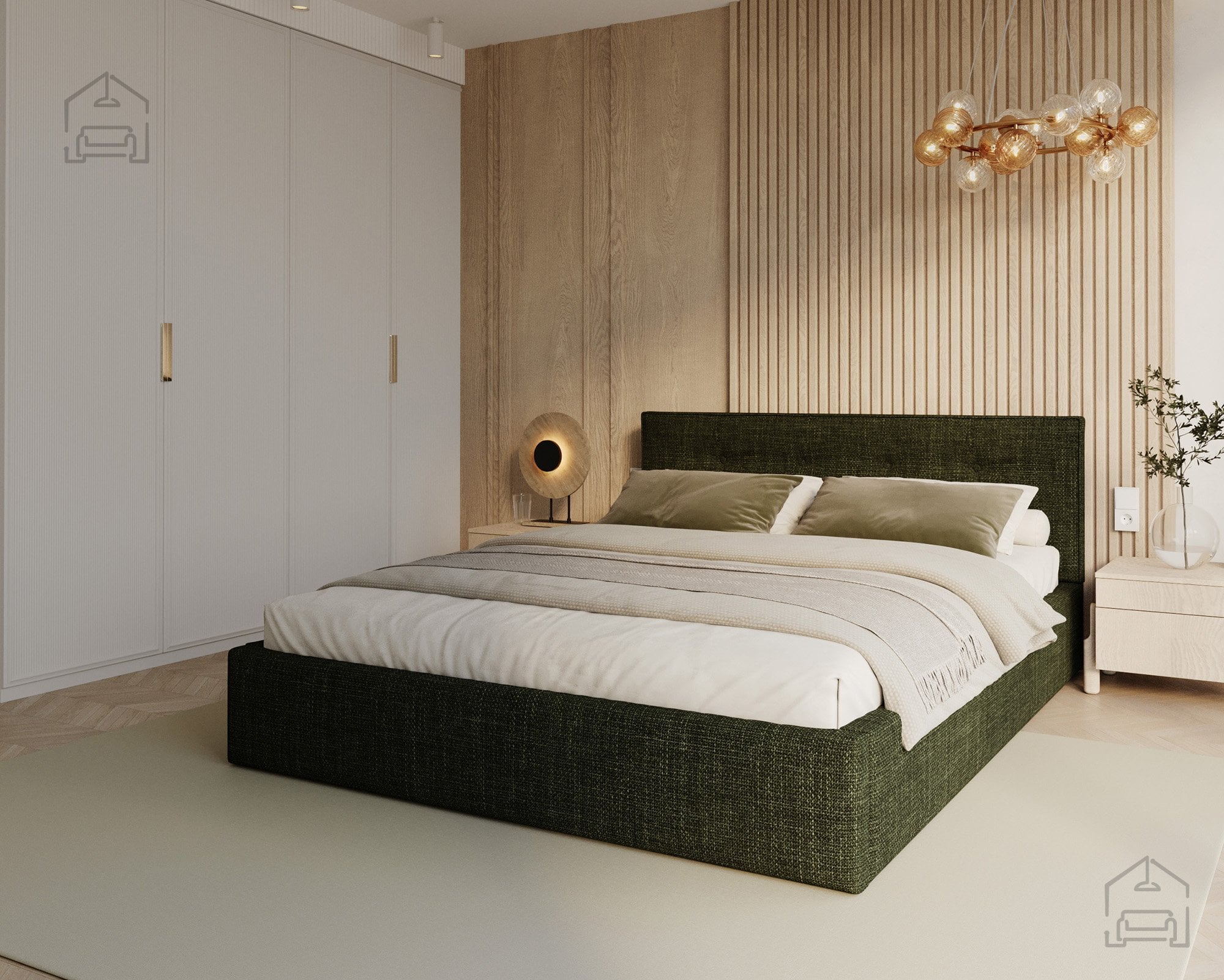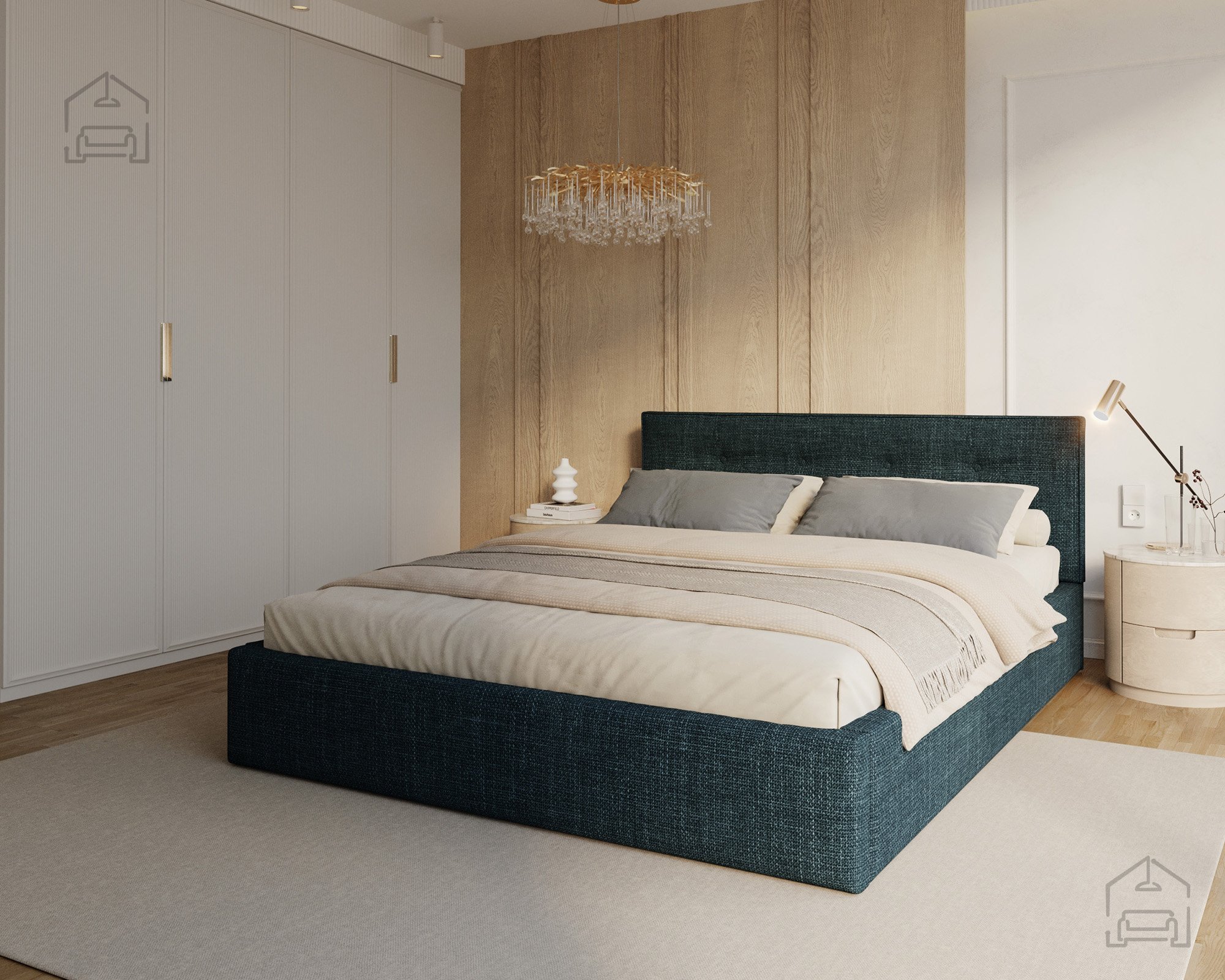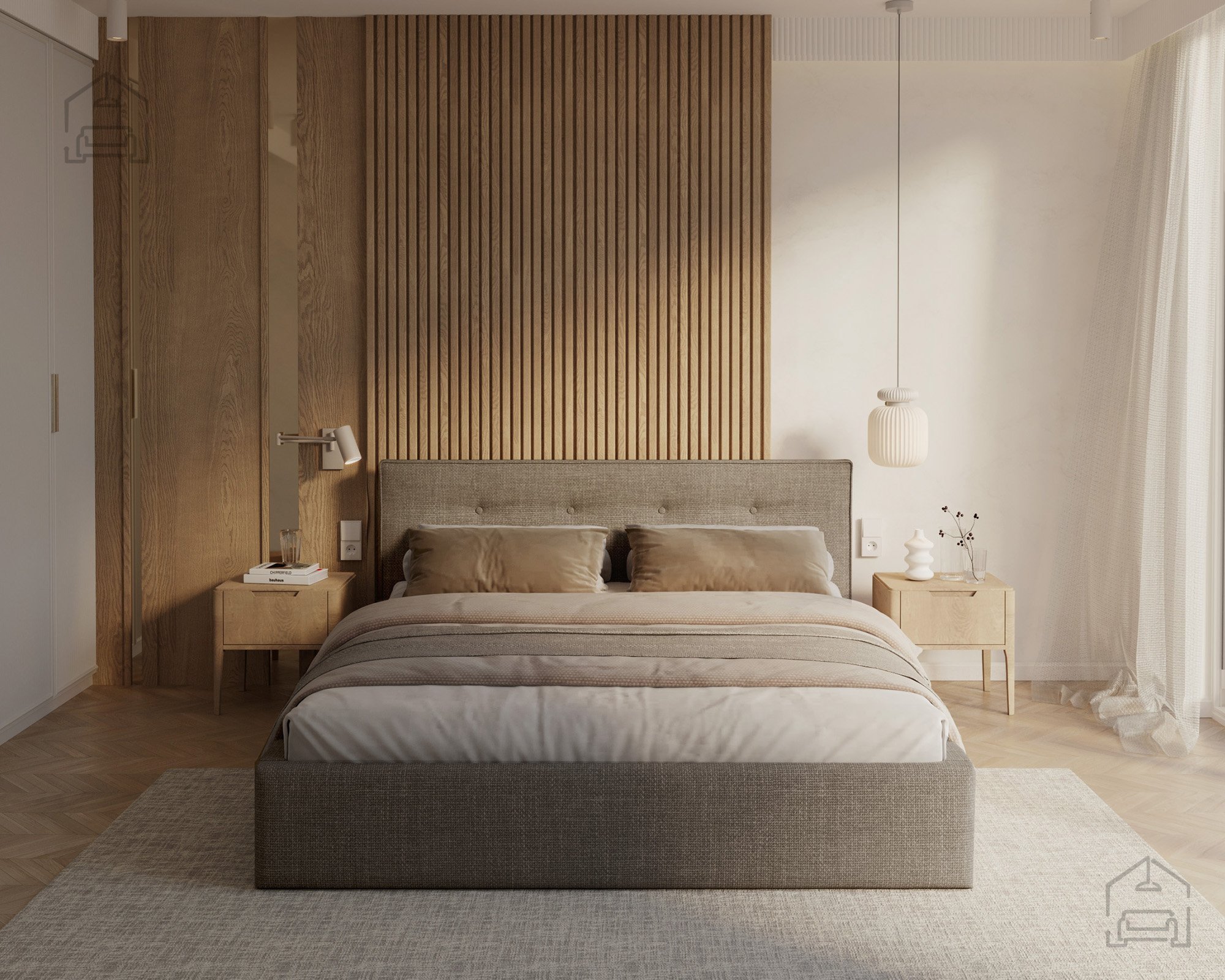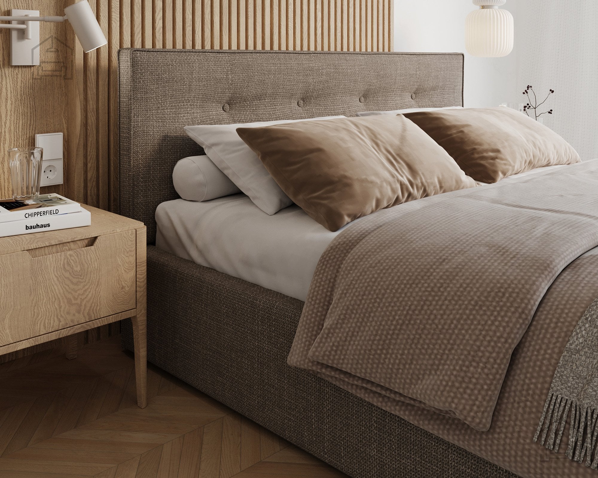 Postelja Tulsa ponuja velik predal za posteljnino, ki je dostopen s pomočjo dvižnega sistema. Leseni dvižni mehanizem zagotavlja stabilnost in tiho delovanje, po želji pa je mogoče izbrati tudi jeklen mehanizem za doplačilo, kar še poveča nosilnost in vzdržljivost konstrukcije. Takšna rešitev omogoča, da pod ležiščem pridobite dodaten prostor za shranjevanje posteljnine, odej, blazin ali sezonskih oblačil, pri čemer ohranite urejen in čist videz spalnice.
