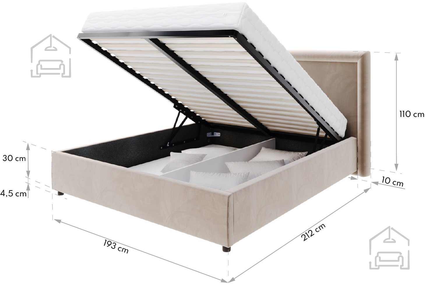 Ležalna površina postelje 180x200 cm, kar omogoča izbiro med več širinami glede na potrebe uporabnika. Višina ležalne površine znaša 34,5 cm, kar omogoča udoben dostop in vstajanje iz postelje. Letveno dno, ki je vključeno v konstrukcijo, dodatno podpira vzmetnico in omogoča dobro zračenje, kar je ključno za higieno in trajnost spalnega sistema.