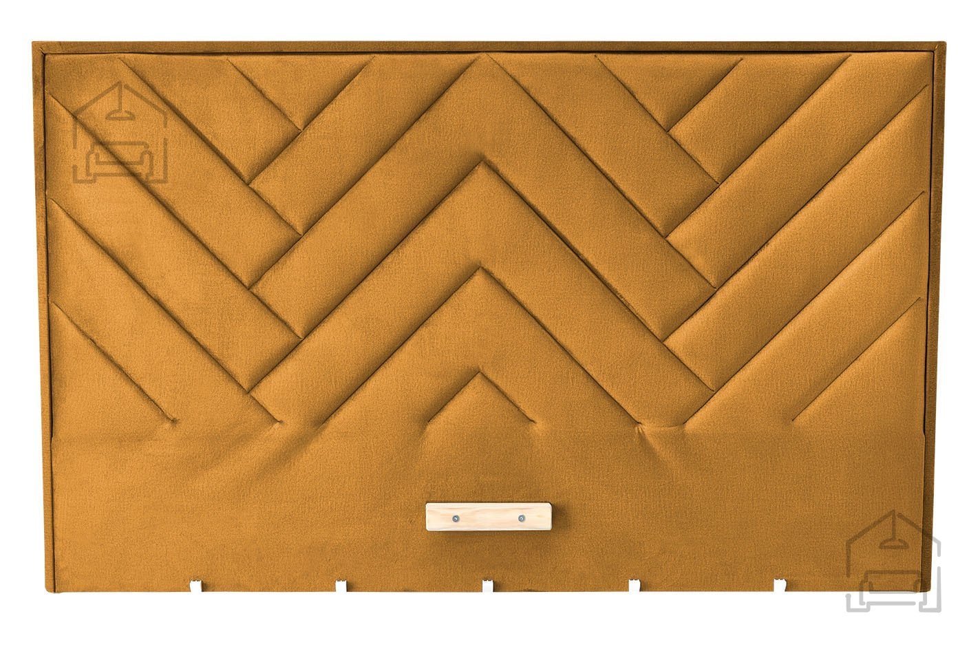 Vzglavje meri 175x8x120 cm in je izdelano iz trpežne iverne plošče, ki zagotavlja stabilnost, ter je bogato oblazinjeno z žametno tkanino. Tkanina je prijetna na otip, hkrati pa odporna na vsakodnevno uporabo. Barva gorčice doda prostoru prijetno energijo in se lepo ujema tako s svetlimi kot s temnejšimi odtenki pohištva.