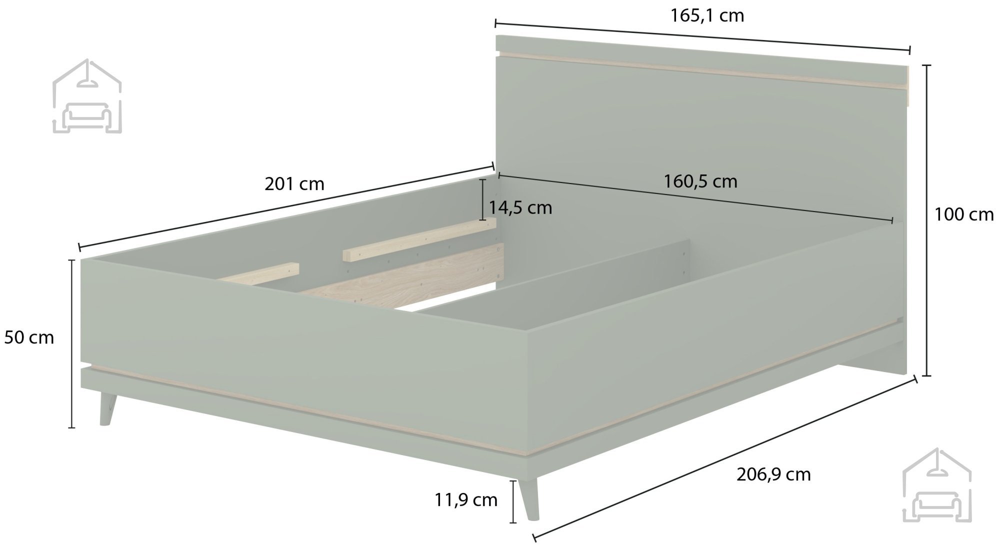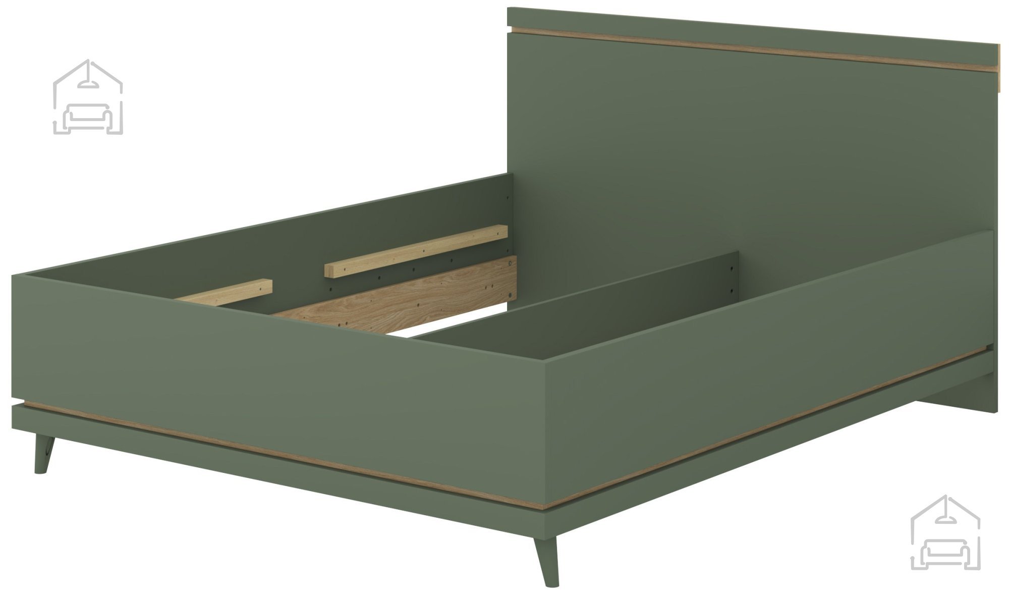 Postelja je izdelana iz visoko kakovostnih pohištvenih plošč debeline 15 in 22 mm, kar zagotavlja trdnost, stabilnost in dolgo življenjsko dobo. Površina v kombinaciji zbledelo zeleno oljen hrast / zbledelo zeleno vnese v prostor svežino in eleganco, medtem ko ABS robovi poskrbijo za dodatno zaščito pred udarci in obrabo. Diskretne plastične nogice zagotavljajo stabilnost ter ščitijo tla pred praskami, hkrati pa ohranjajo minimalistično estetiko.