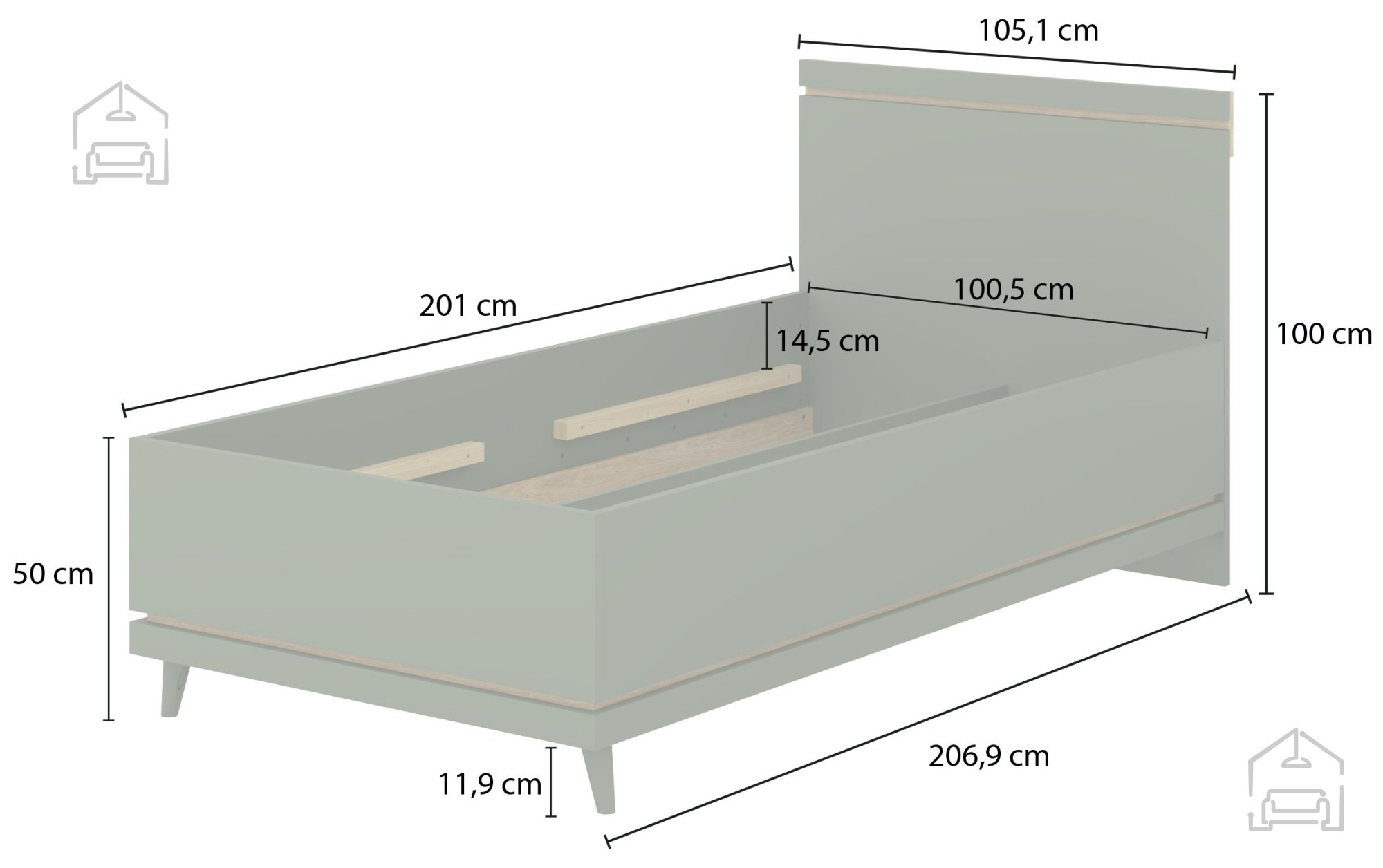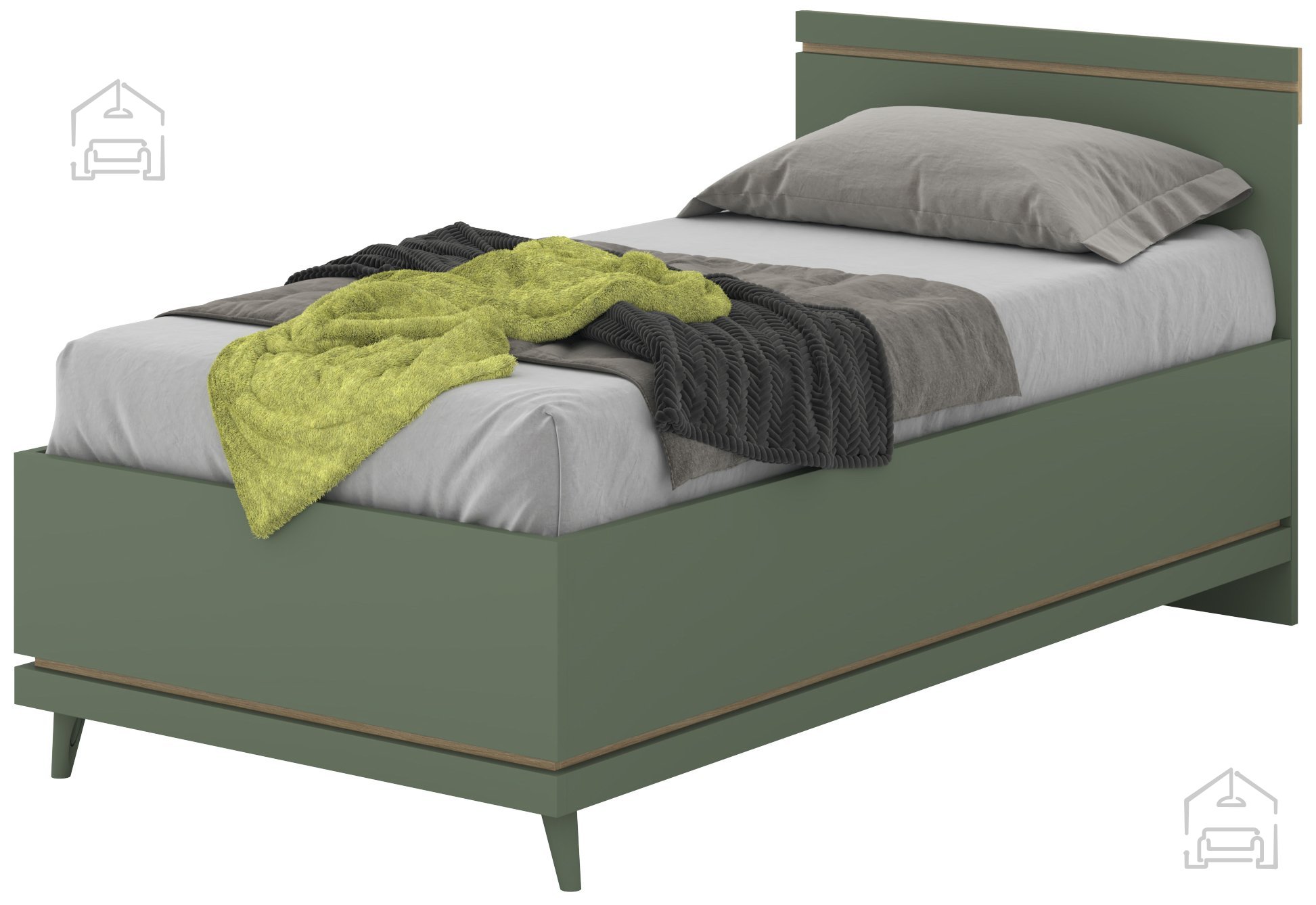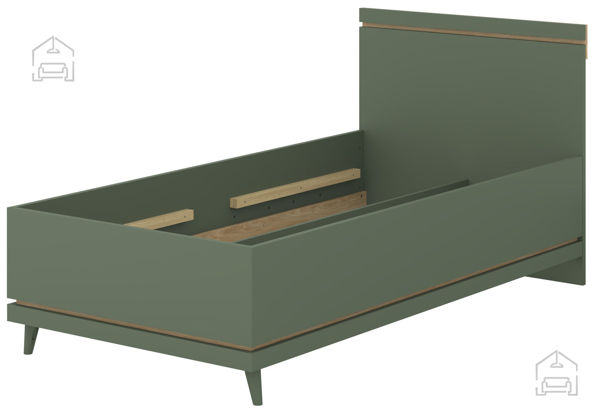 Vsak detajl je premišljeno zasnovan z mislijo na udobje in estetiko. Površina v barvi zbledelo zelenega hrasta deluje naravno in toplo, medtem ko subtilni zeleni odtenki dodajo sodoben pridih, ki se odlično ujema z različnimi slogi notranje opreme – od skandinavskega minimalizma do rustikalno-modernih ambientov. Postelja je rezultat natančne izdelave v priznani tovarni Helvetia Meble s Poljske, znani po visoki kakovosti, inovativnosti in skrbi za detajle. Vsak kos pohištva je zasnovan tako, da zadovolji potrebe sodobnega uporabnika, ki išče kombinacijo estetike, udobja in trajnosti. Plastične nogice omogočajo stabilno postavitev ter ščitijo tla pred praskami, hkrati pa dodajo subtilen kontrast k naravni barvi lesa. Zaradi svoje kompaktne zasnove se ta postelja odlično prilega tako manjšim kot večjim prostorom, zato je odlična izbira za mladinske sobe, garsonjere ali sodobne spalnice.