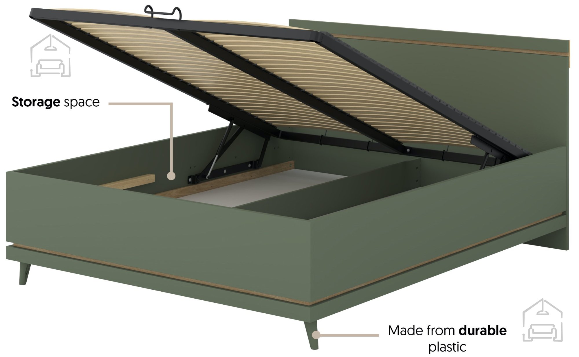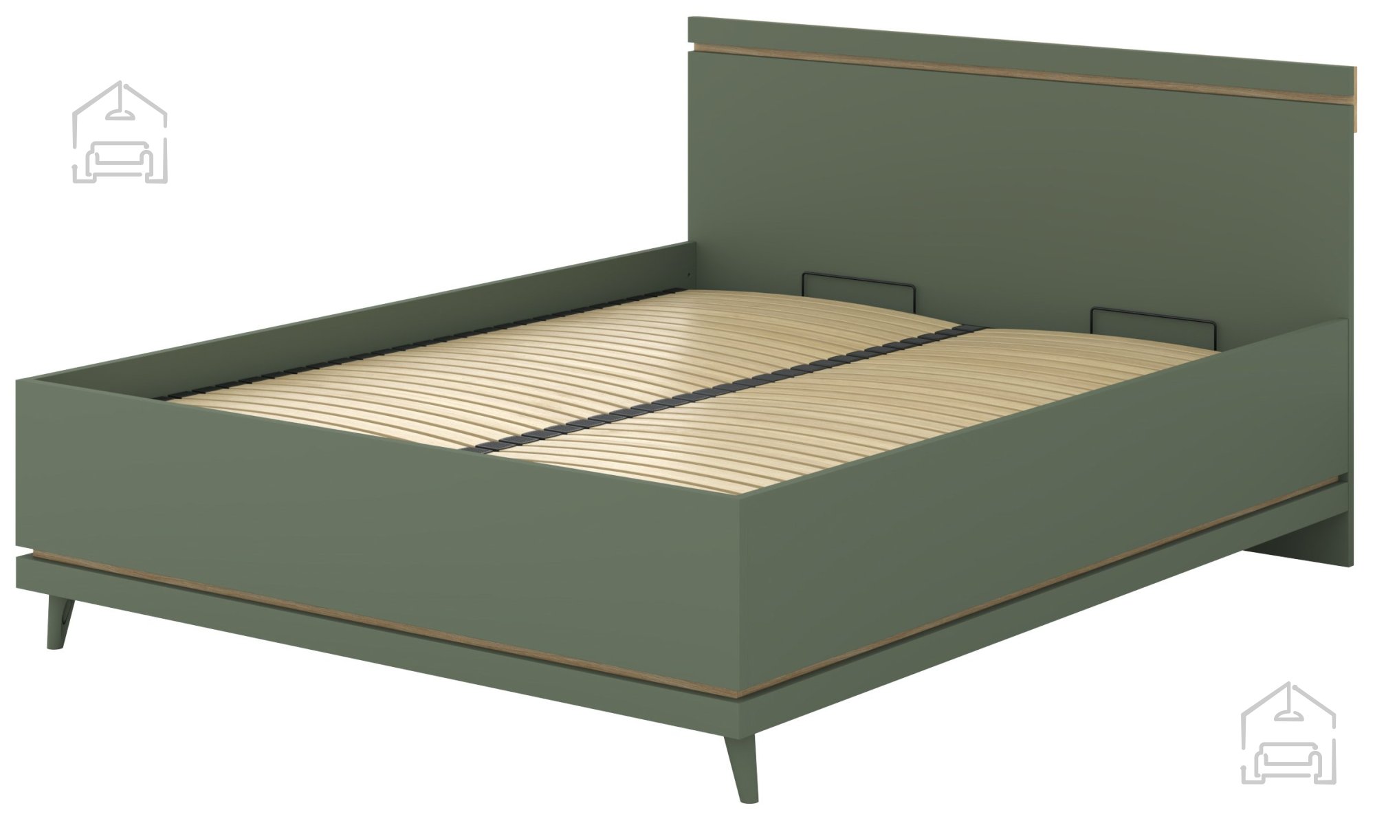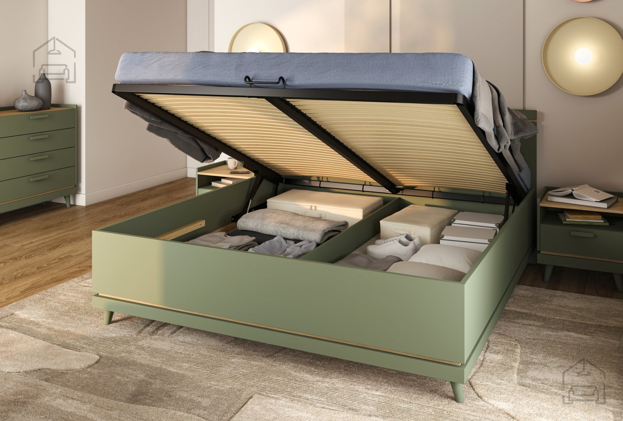 Posebnost te postelje je dvižni mehanizem z zračnimi vzmetmi, ki omogoča preprost in tih dvig ležišča. Pod vzmetnico se skriva prostoren shranjevalni del, kamor lahko spravite posteljnino, odeje, blazine ali sezonska oblačila. To pomeni, da boste pridobili dragocen prostor in ohranili spalnico urejeno ter organizirano. Idealna rešitev za manjše prostore ali za vse, ki cenijo urejenost in funkcionalnost.