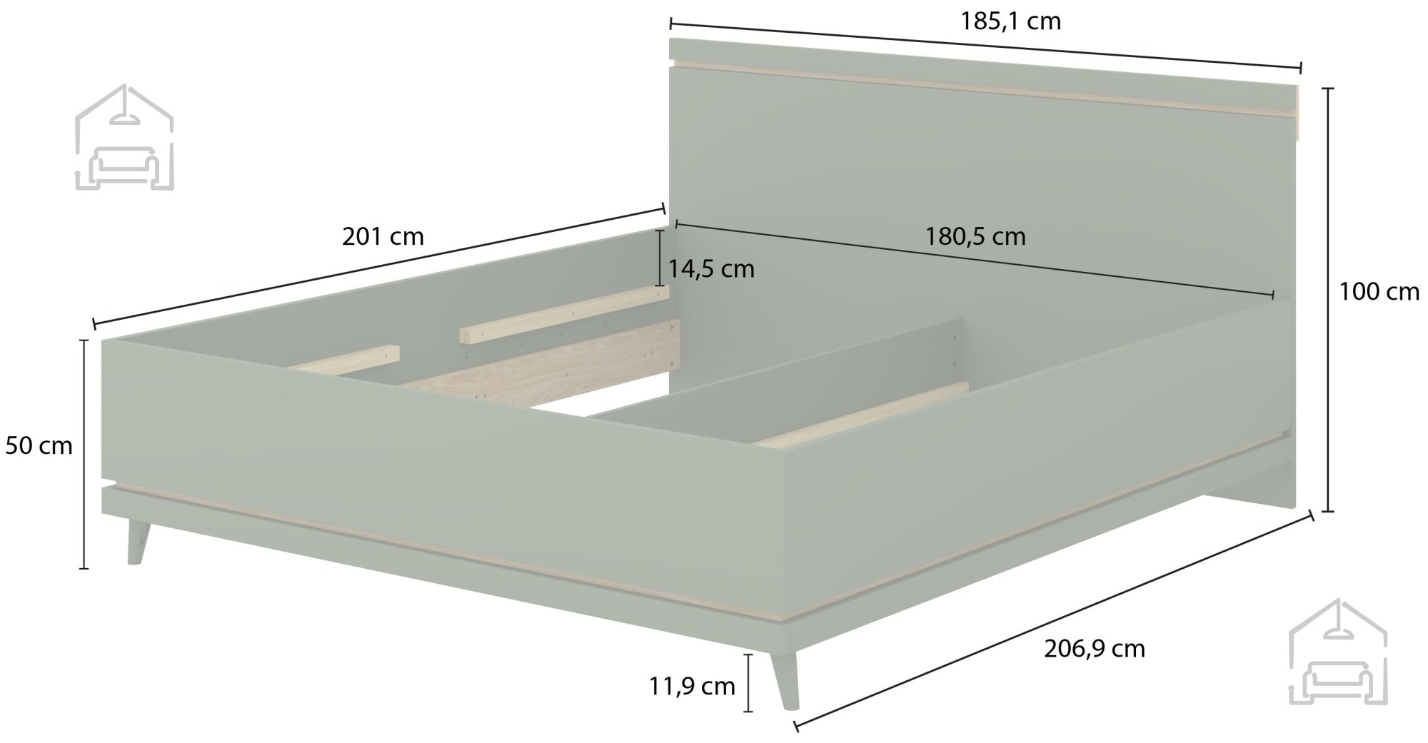 Ko iščete idealno posteljo, želite več kot le udoben kos pohištva – iščete prostor, kjer boste vsak večer sprostili telo in umirili misli. Ta postelja je popolna izbira za vse, ki cenijo skandinavski dizajn, kakovostne materiale in praktične rešitve. Njena kombinacija zbledelo zelenega oljenega hrasta in mehke zelene barve ustvarja občutek naravne harmonije, ki se odlično poda v svetle, sodobne ali minimalistične spalnice. Zunanji videz zaznamuje čistost linij in elegantna forma, ki jo poudarijo kakovostno obdelani ABS robovi ter subtilne plastične nogice, ki zagotavljajo stabilnost in lahkotnost konstrukcije. Uporabljeni materiali – 15 mm in 22 mm pohištvena plošča – prinašajo trdnost in dolgotrajno obstojnost, kar pomeni, da bo ta postelja služila kot zanesljiv del vaše spalnice še vrsto let.