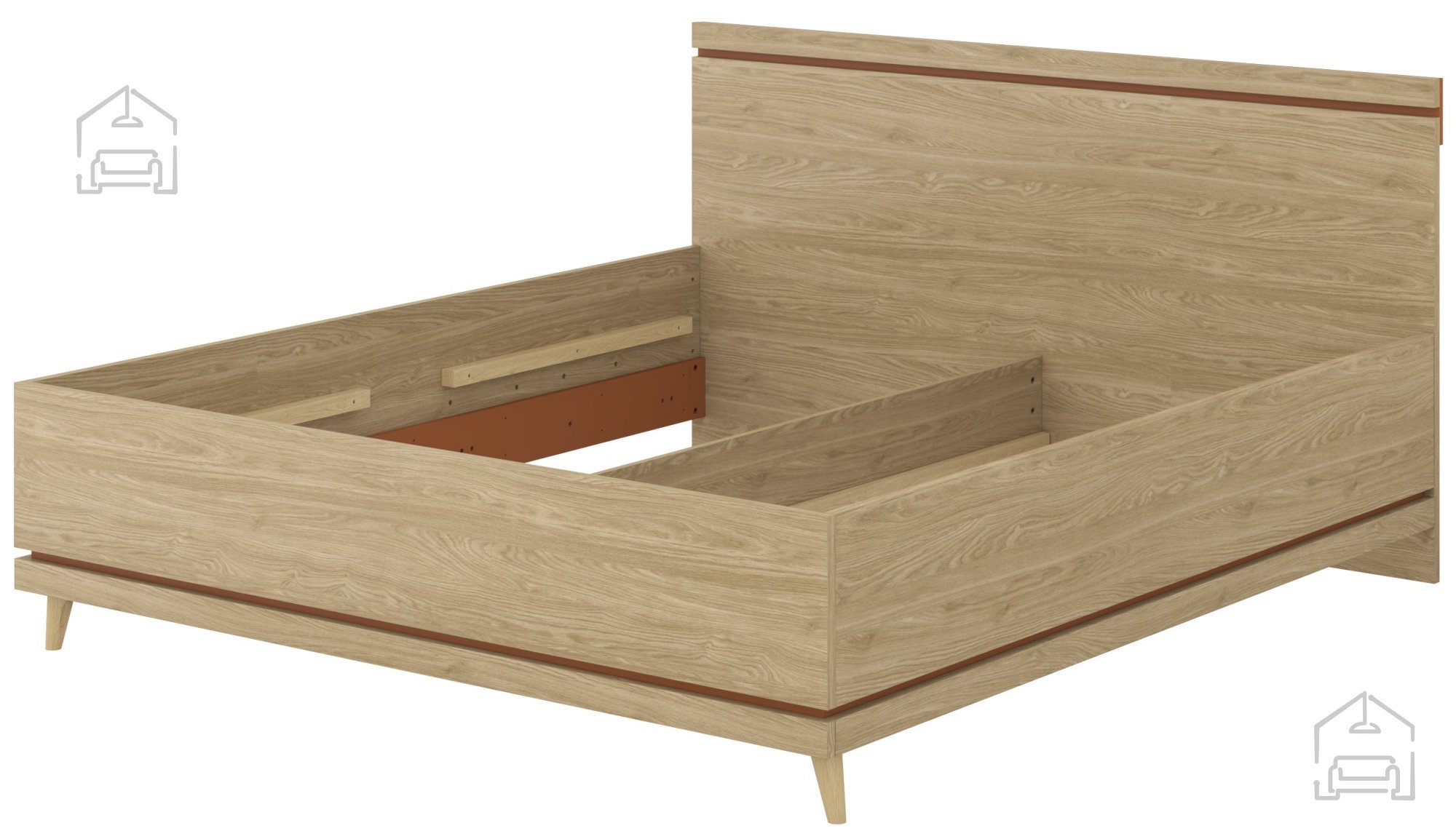 Postelja Scandi je popolna izbira za vse, ki cenijo kakovostno izdelavo, udobje in estetsko dovršen dizajn. Njena preprosta linija in naravni videz se odlično ujemata z različnimi slogi notranje opreme – od skandinavskega minimalizma do rustikalnih in modernih ambientov. Barvna kombinacija oljenega hrasta in tople opečne barve ustvarja vizualno ravnovesje, ki prinaša občutek miru in topline v vsak prostor.