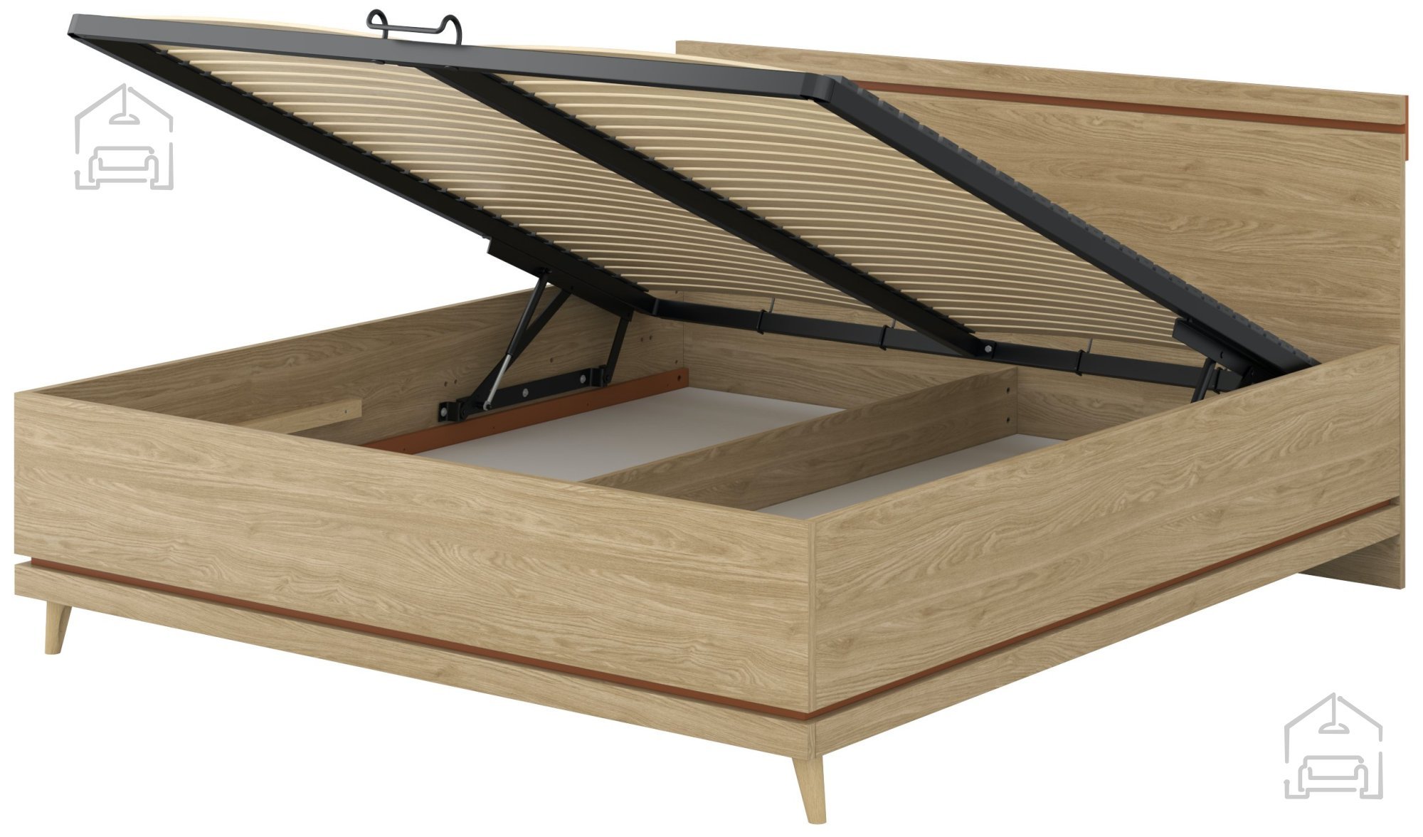 Izdelana je iz kakovostne pohištvene plošče debeline 15 mm in 22 mm, kar zagotavlja stabilnost in dolgo življenjsko dobo. Površina v barvi oljenega hrasta skupaj z detajli v odtenku opeke doda pridih sodobne rustikalnosti, ki se odlično ujema tako s klasičnim kot tudi z modernim slogom opreme. ABS robovi dodatno ščitijo površino pred poškodbami, kar pomeni, da bo postelja tudi po letih uporabe videti kot nova.
