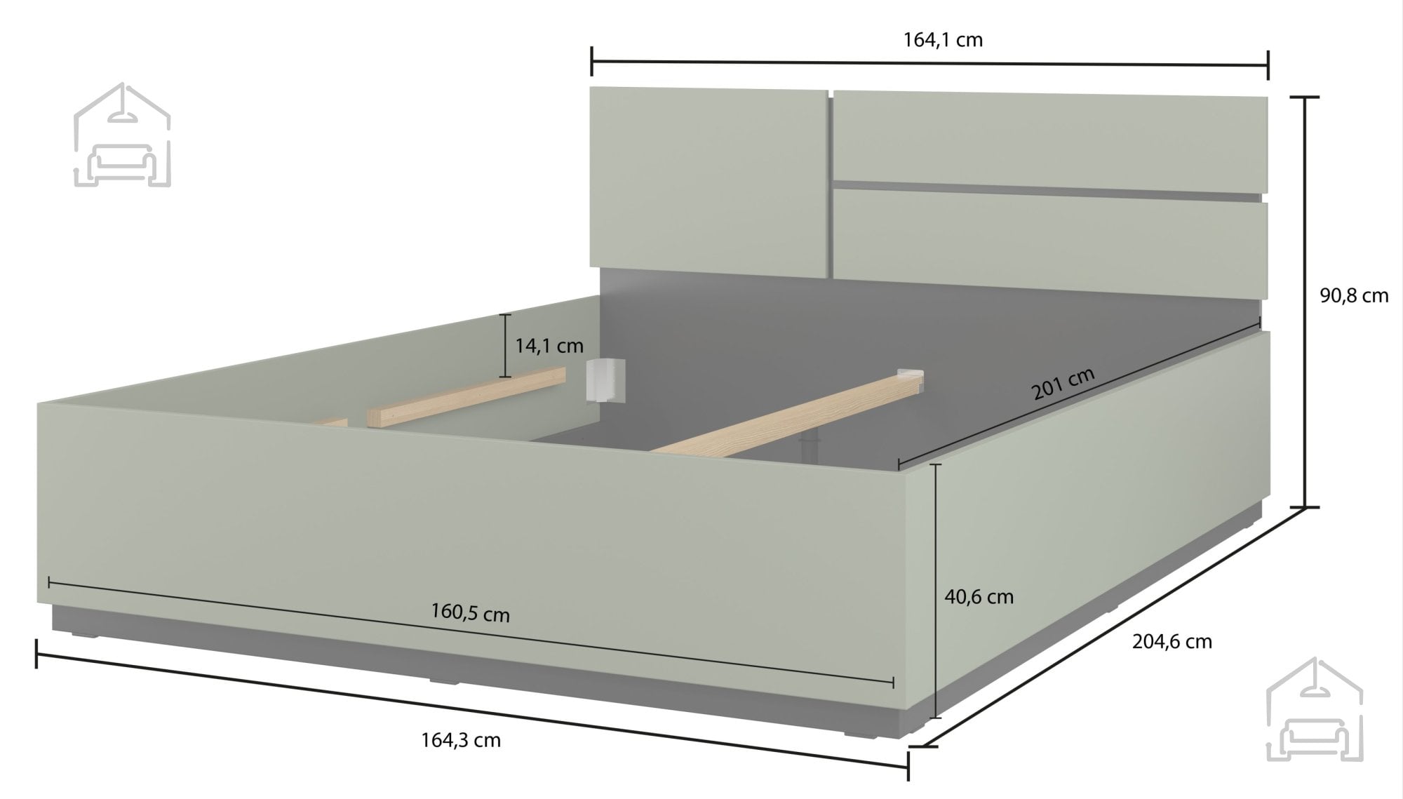 Postelja je zasnovana za standardno ležišče velikosti 160×200 cm, zato omogoča preprosto izbiro vzmetnice, ki ustreza vašim spalnim navadam. Zaradi uravnoteženih mer se lepo poda v večino spalnic, ne da bi zavzela preveč prostora. Višina vzglavja 91 cm nudi udobno naslonjalo za branje ali sproščanje v postelji, hkrati pa vizualno dopolni kompozicijo prostora.