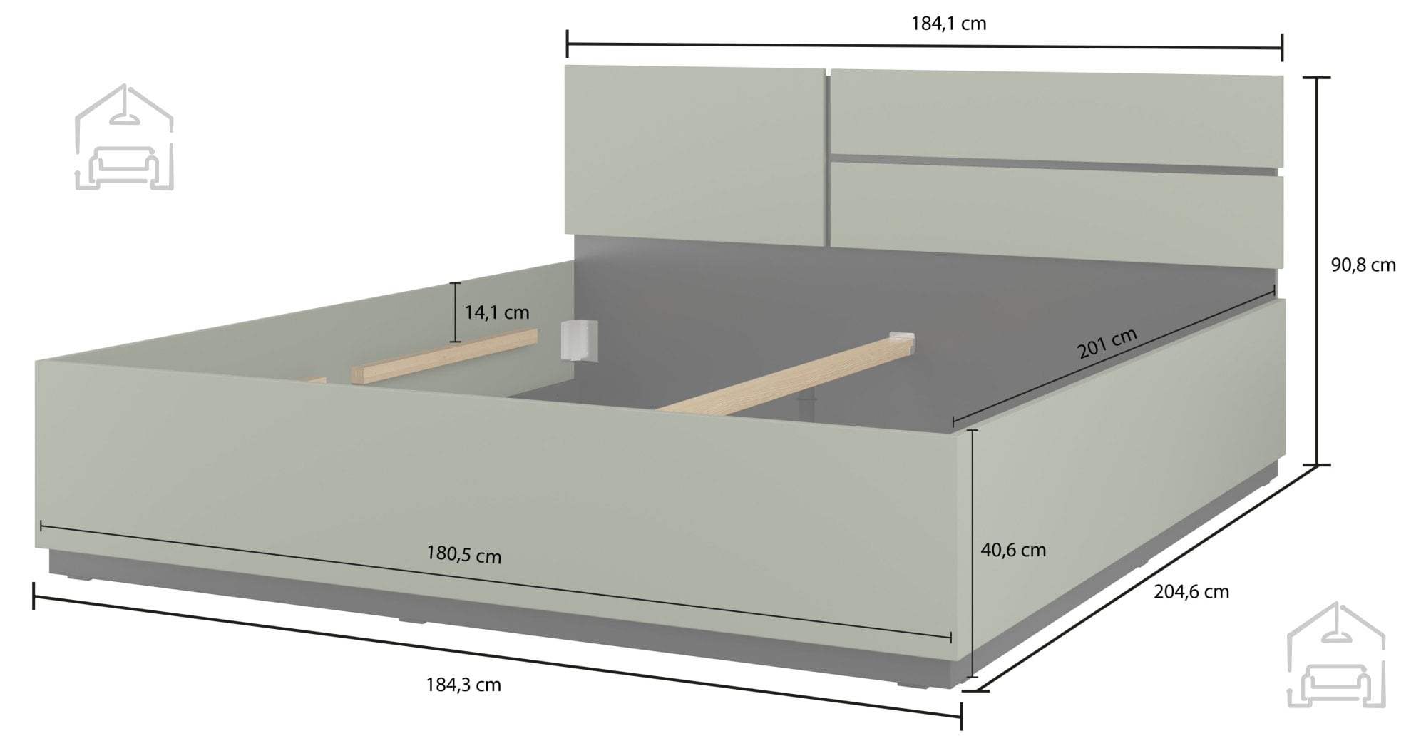 Postelja meri 184 cm v širino, 205 cm v dolžino in 91 cm v višino, zato se lepo prilega večini spalnic. Ležišče velikosti 180 × 200 cm omogoča udobno spanje dveh oseb. Zaradi racionalno oblikovanega okvirja postelja ne zavzame več prostora, kot je potrebno, kar je še posebej pomembno v manjših spalnicah ali garsonjerah.