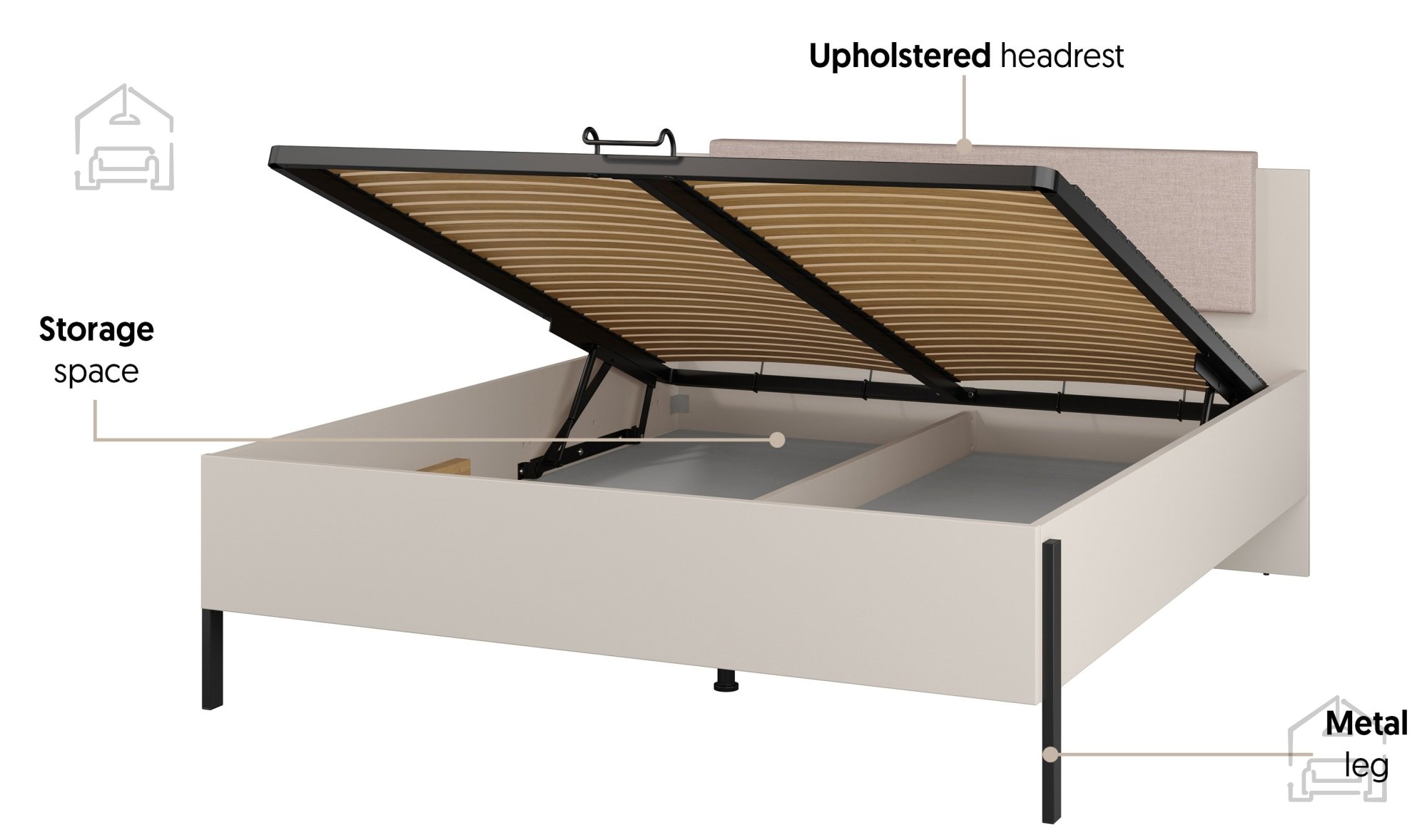 Letveno dno, ki je vključeno v konstrukcijo, zagotavlja optimalno zračenje in podporo vzmetnici. Zračni pretok pod ležiščem pomaga ohranjati svežino spalnega prostora in podaljšuje življenjsko dobo vzmetnice. S pomočjo dvižnega mehanizma lahko preprosto dvignete zgornji del postelje in pridete do predala, kamor lahko shranite sezonsko posteljnino, odeje ali druge predmete, ki jih želite imeti pri roki, a ne na vidnem mestu.