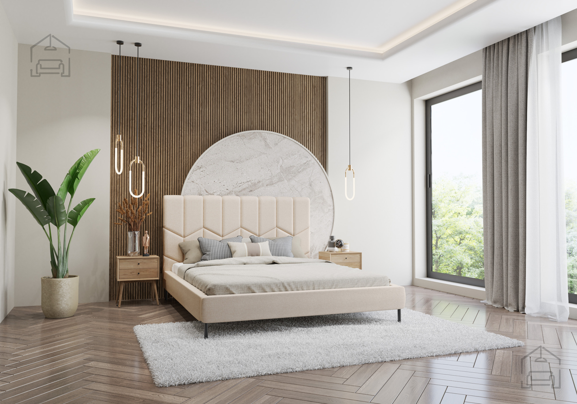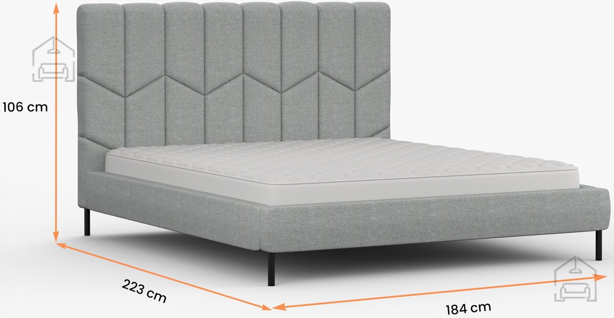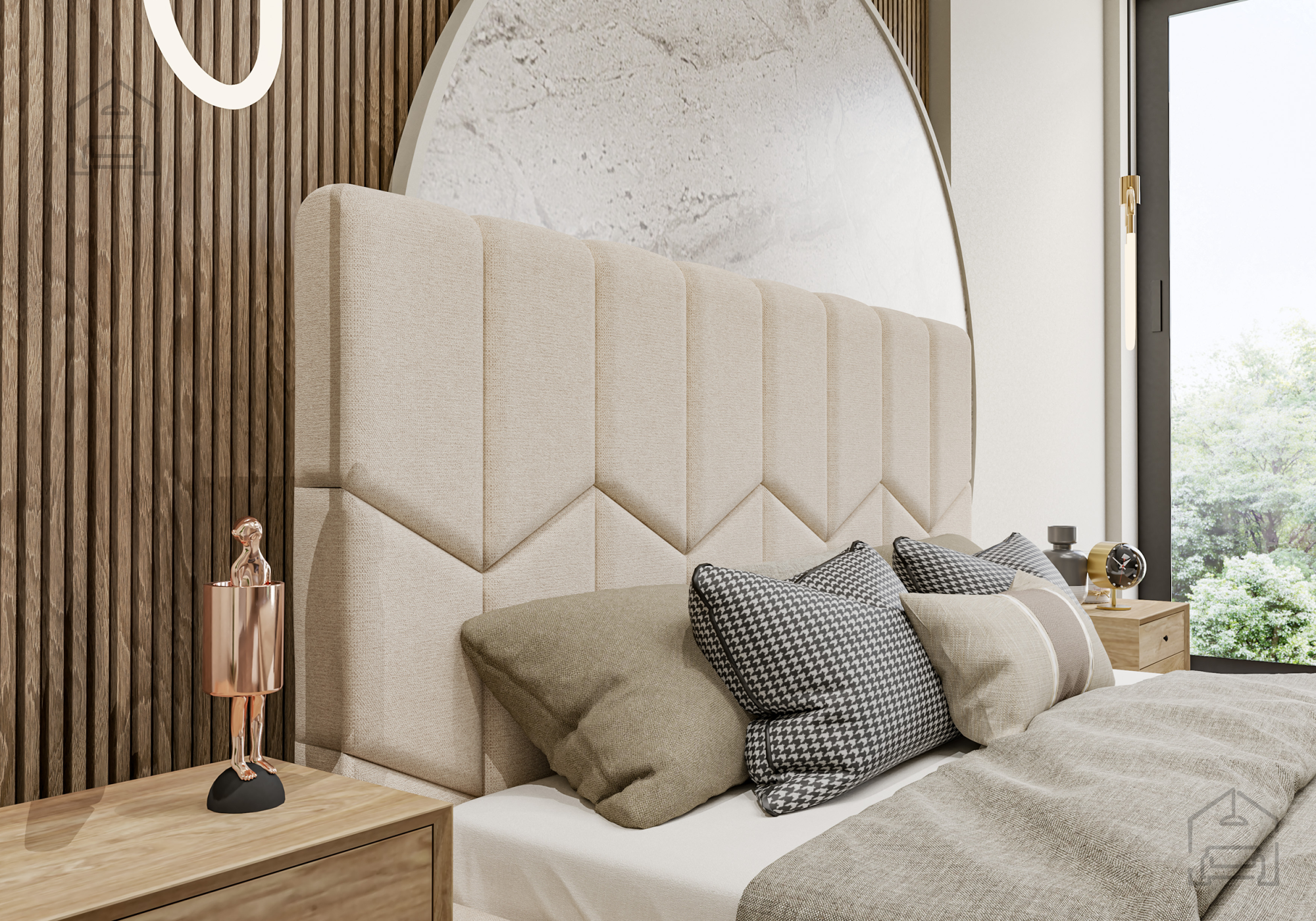 Okvir postelje je v celoti tapeciran, kar pomeni, da ni ostrih robov ali hladnih površin. To je še posebej praktično v manjših prostorih, kjer se uporabnik pogosto premika okoli postelje. Tapeciran okvir prispeva tudi k zvočni in vizualni mehkobi spalnega prostora.