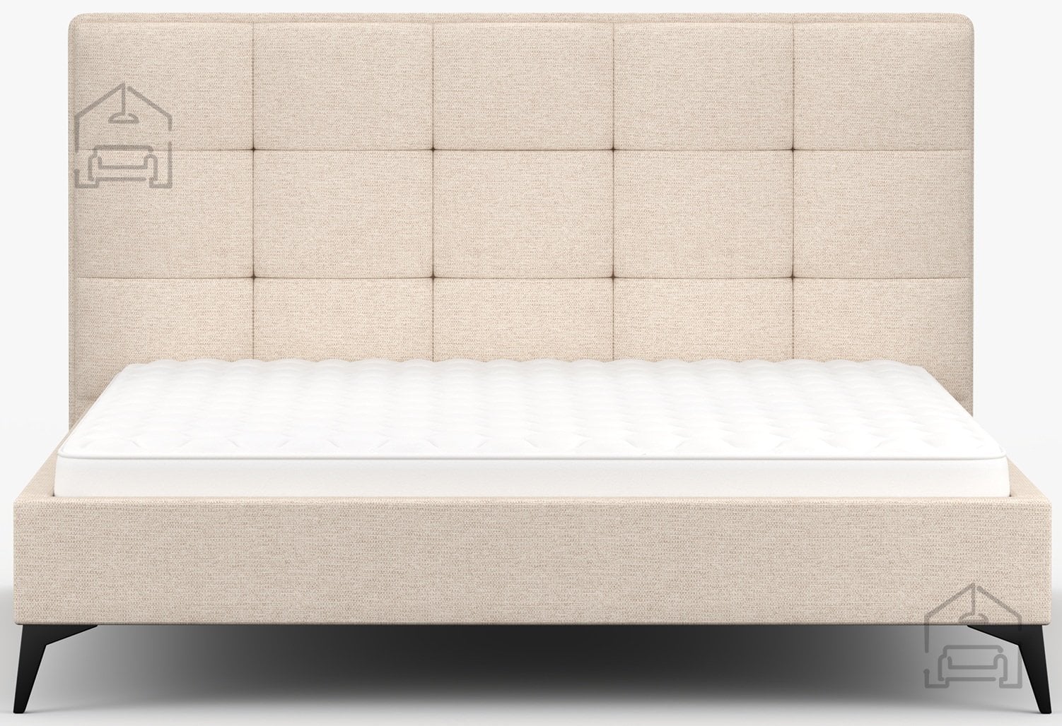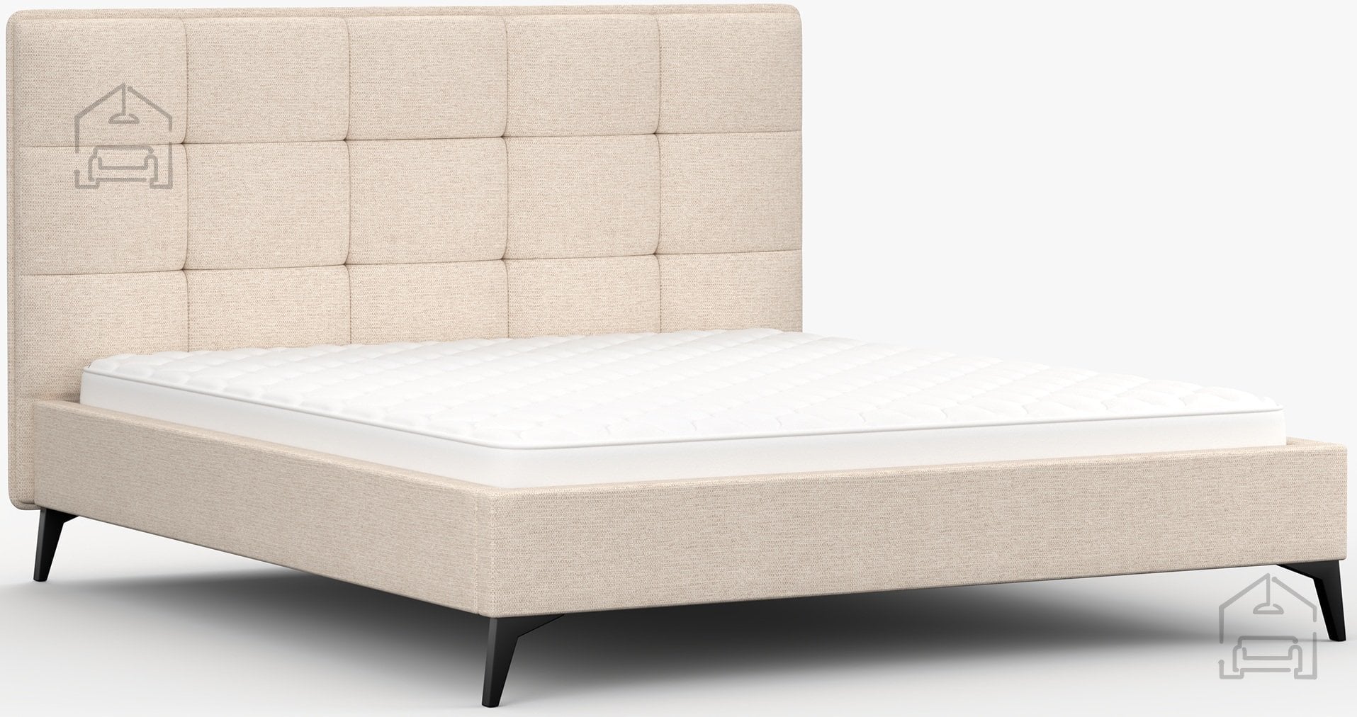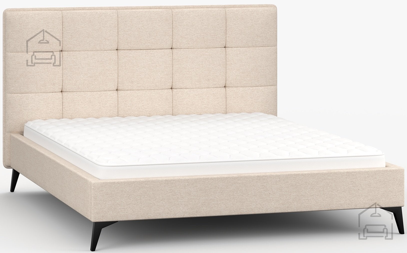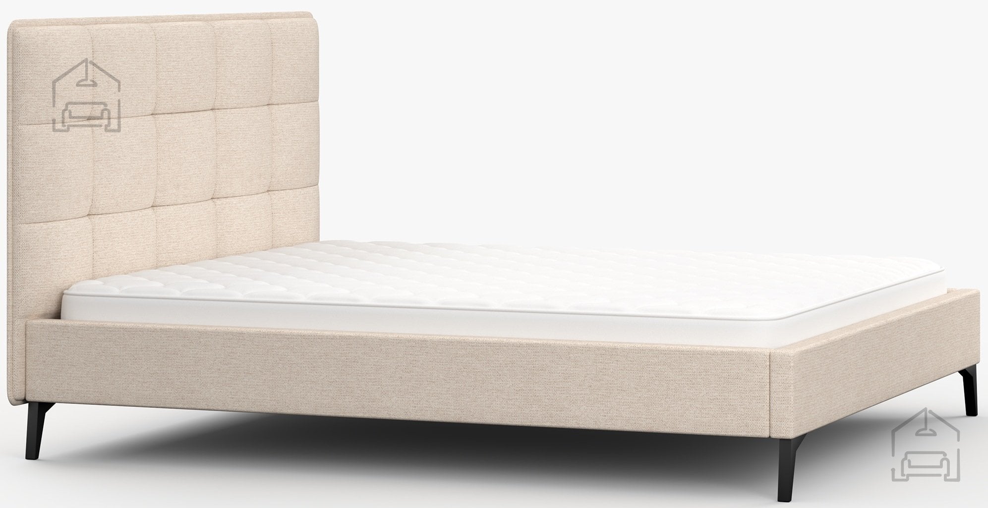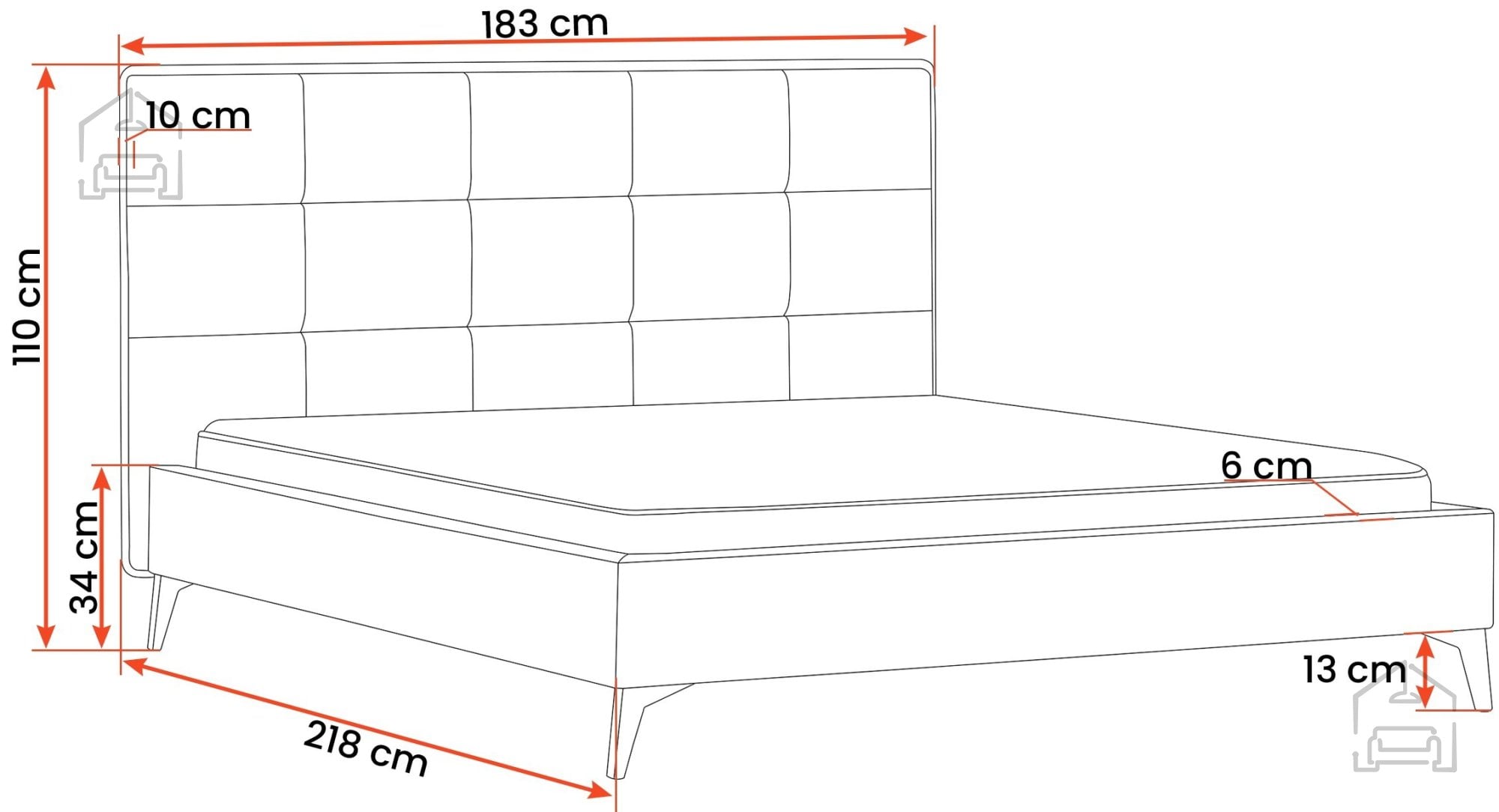Kovinske noge v črni barvi, visoke 13 cm, dajejo postelji vizualno lahkotnost ter omogočajo enostavno čiščenje tal pod njo. Celotna konstrukcija meri 183x218x110 cm, kar nudi dovolj prostora za standardni vzmetnici dimenzij 160x200 cm. Postelja se prodaja brez vzmetnice, kar omogoča, da si vsak uporabnik izbere model, ki najbolj ustreza njegovim spalnim navadam in trdotnim preferencam.
