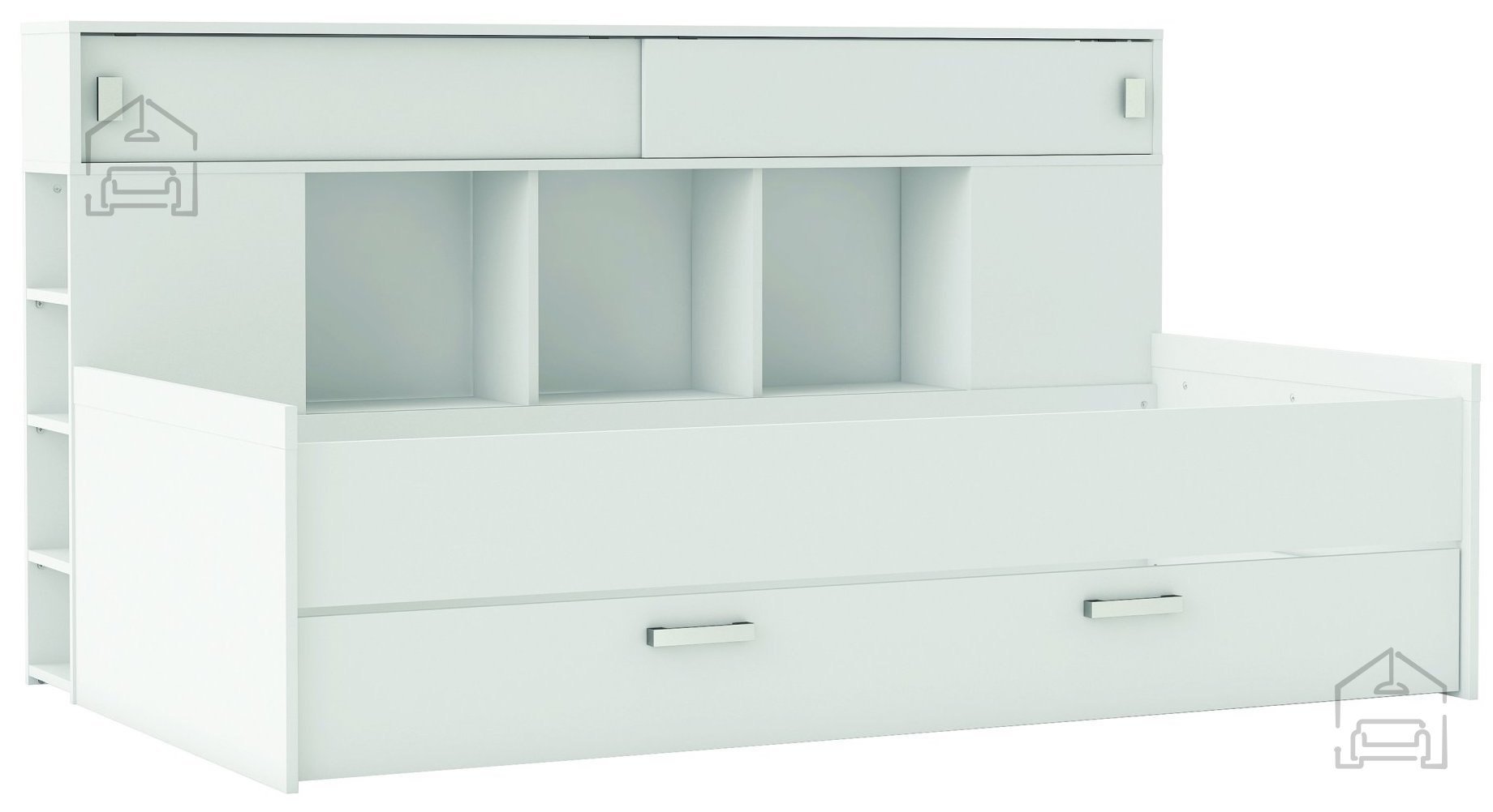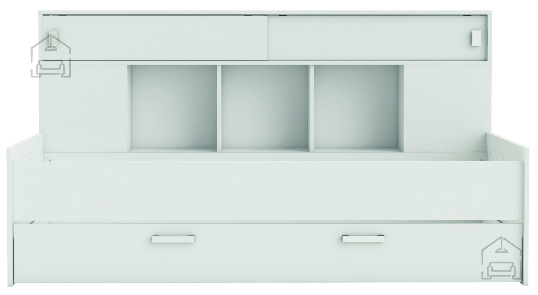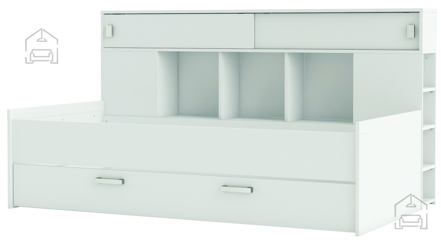 Model Sherwood je zasnovan z mislijo na maksimalno izkoriščenost prostora. Pod ležiščem se skriva prostoren predal za posteljnino, ki omogoča shranjevanje odej, blazin ali sezonskih oblačil. Tako je soba vedno urejena, postelja pa ohranja čist videz brez nepotrebne navlake. Poleg predala vključuje še omaro z dvema drsnima vratoma, ki predstavlja praktično dodatno shranjevalno površino. Omara in predal se odpirata z estetskima plastičnima ročajema, ki se lepo ujemata z belo površino in dopolnjujeta celoten videz.