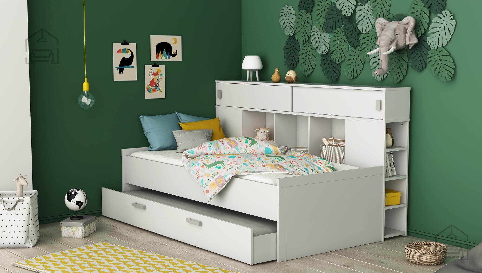 Bela barva in nevtralna oblika omogočata preprosto kombiniranje s pohištvom različnih slogov in barv. Postelja se odlično ujema z lesenimi ali barvnimi omarami, policami in dekorativnimi dodatki. Zaradi preprostih linij in praktične zasnove je primerna tako za otroške kot za mladinske sobe. Prostor, ki ga ponujajo dodatne police in predali, prispeva k večji organiziranosti in udobju v vsakodnevnem življenju.