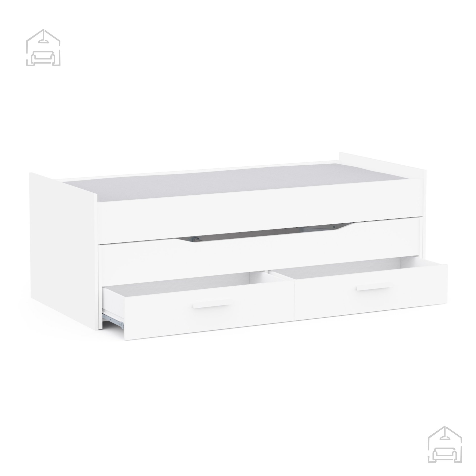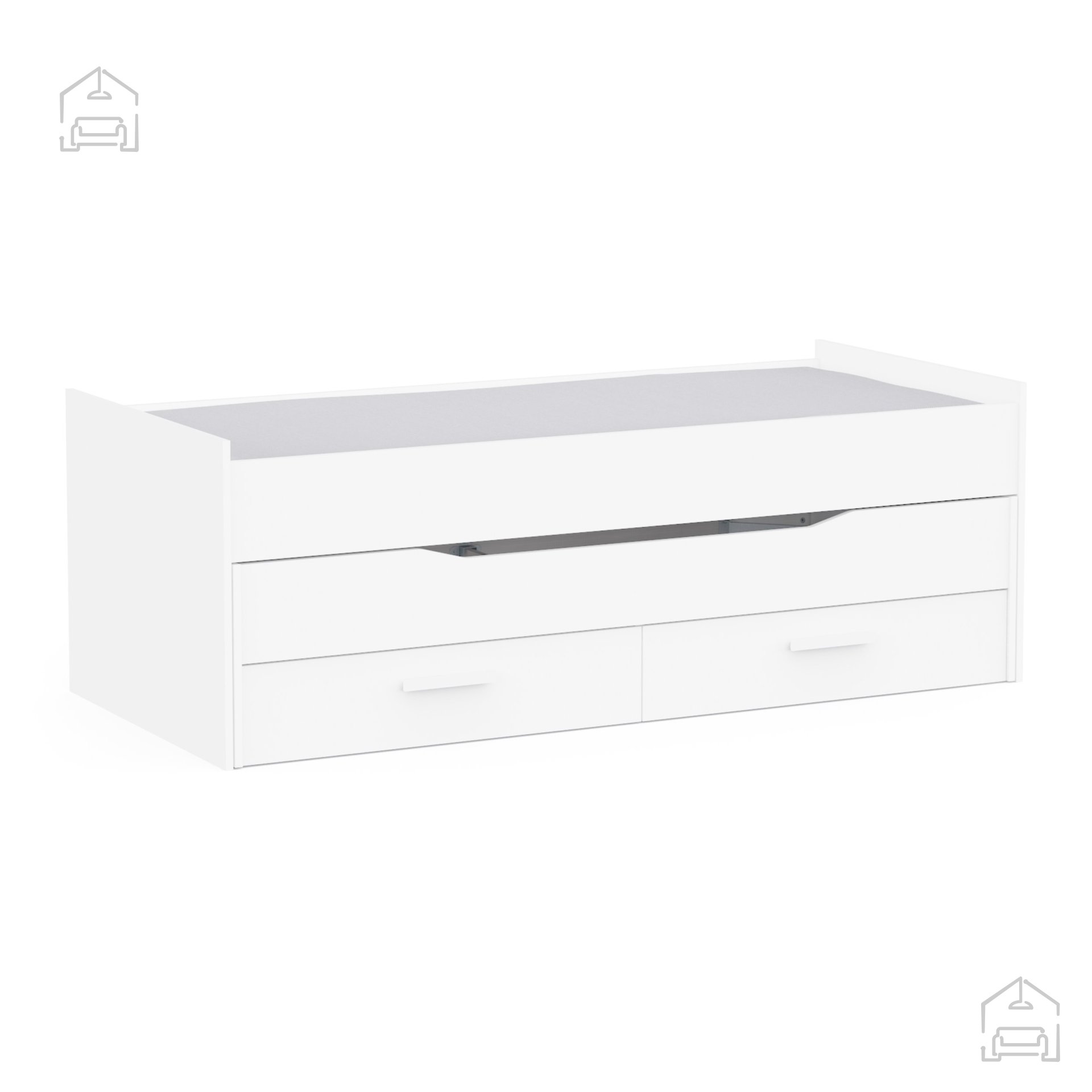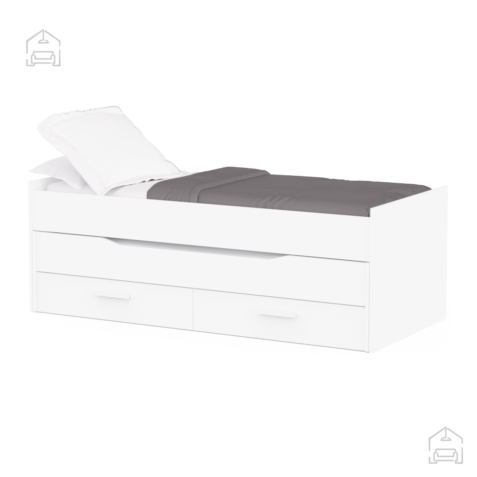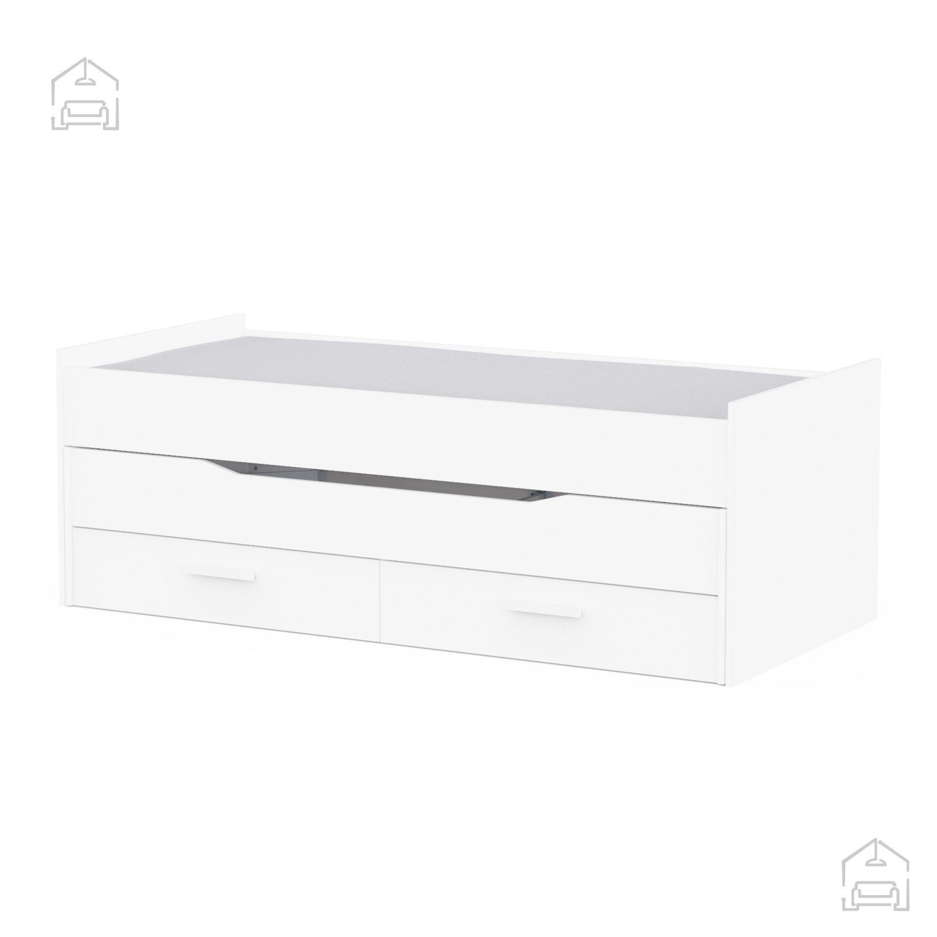 Zložljiva postelja iz iverala v beli barvi predstavlja popolno ravnovesje med estetiko in uporabnostjo. Z dvema ležiščema, ki sprejmeta vzmetnici dimenzij 90 × 200 cm, in dvema prostornima predaloma pod njimi, prinaša praktično rešitev za vse, ki iščejo večnamensko in elegantno opremo za svoj dom. Z njeno pomočjo boste ustvarili urejen, prostoren in sodoben ambient, ki v vsakem trenutku omogoča udobno spanje in preprosto organizacijo stvari.