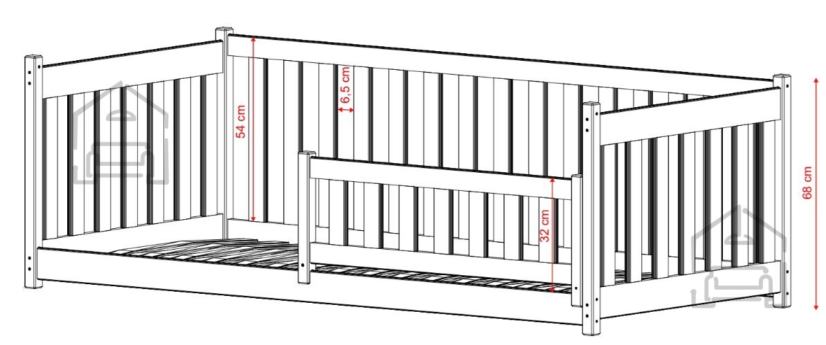 Celotne dimenzije postelje znašajo 87x168x68 cm. Ležiščna površina meri 80x160 cm, kar omogoča udobno spanje za otroka vseh starosti v obdobju zgodnjega otroštva. Največja dovoljena nosilnost znaša 100 kg, kar pomeni, da lahko starši brez skrbi sedijo na rob postelje, ko otroka uspavajo ali mu berejo pravljico.