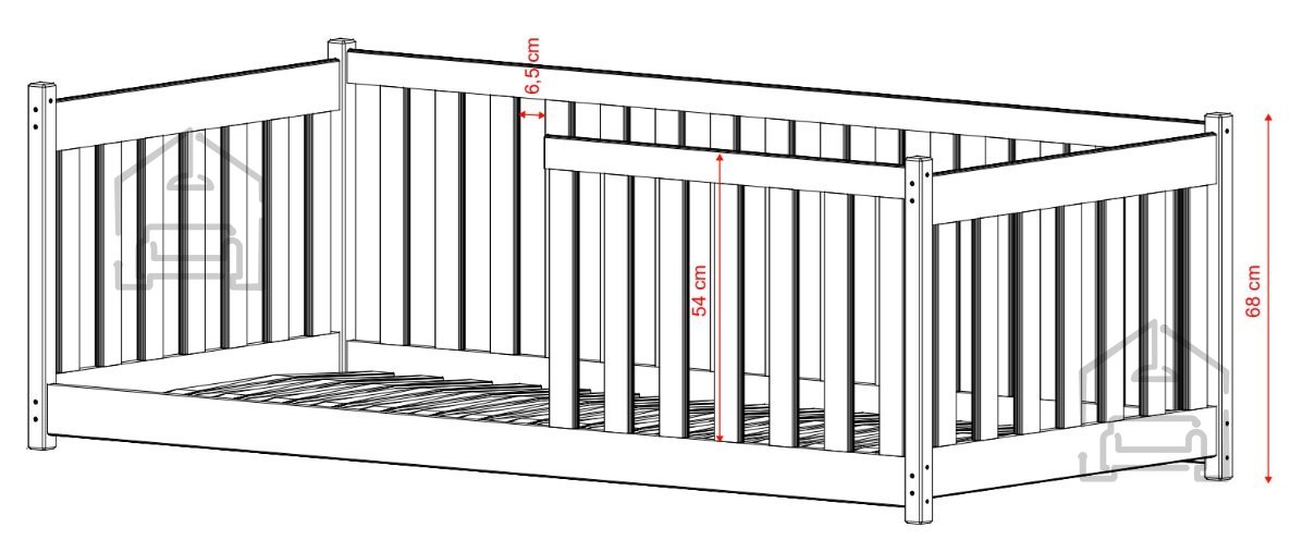 Ležalna površina meri 80x160 cm in je idealna za otroke, ki prehajajo iz posteljice v večjo posteljo. V kompletu je vključeno letveno dno iz trdnih lesenih letvic, ki zagotavlja dobro zračenje vzmetnice in optimalno oporo telesu. Vzmetnica ni vključena, priporočena največja višina pa je 13 cm. Ta višina omogoča udobno ležanje in hkrati ohranja varnostno višino stranic.