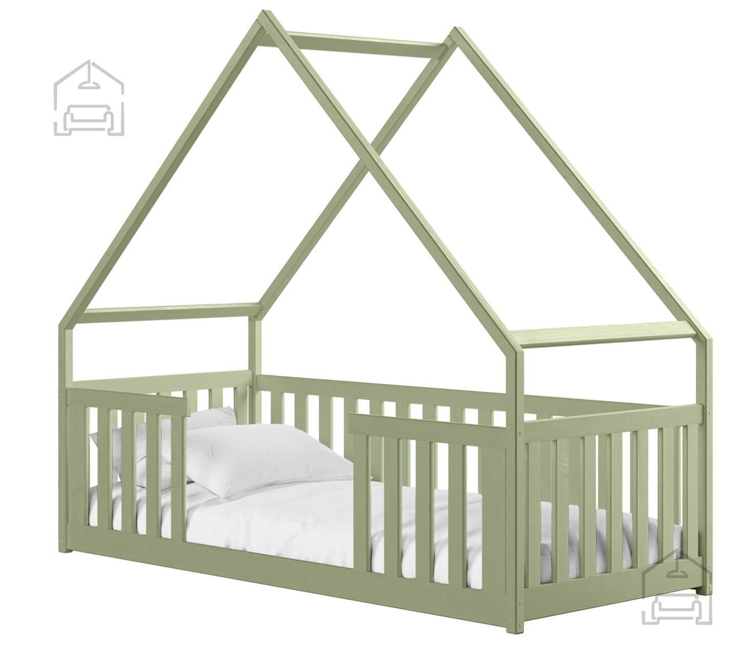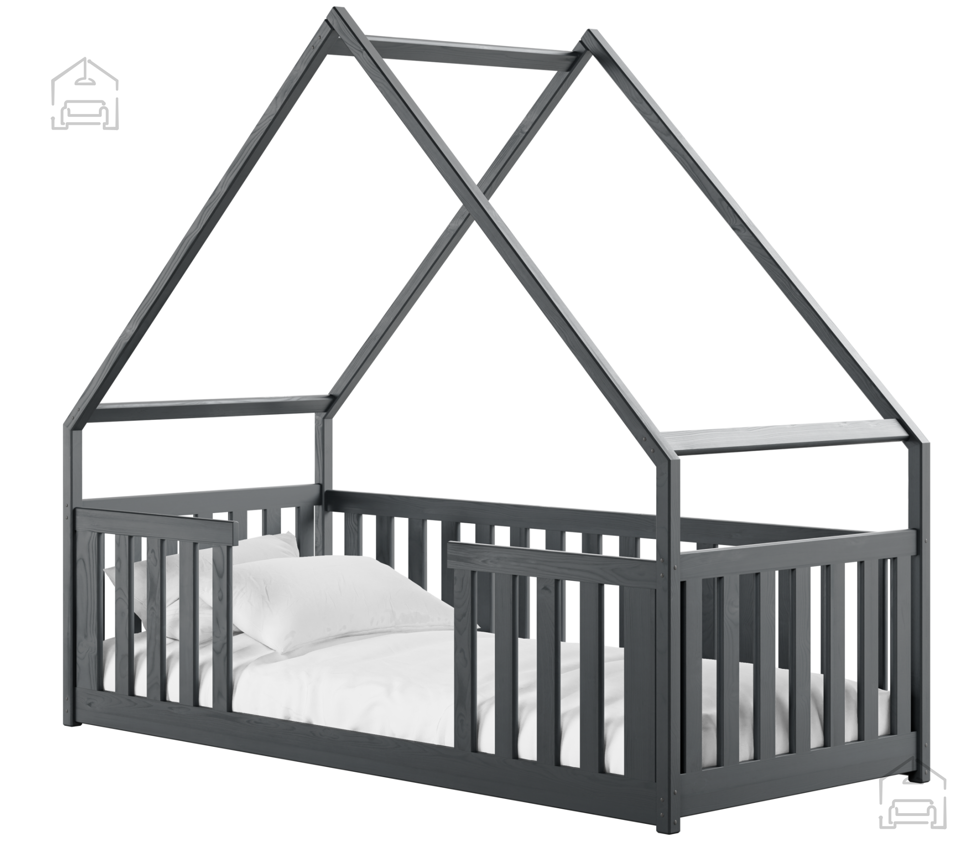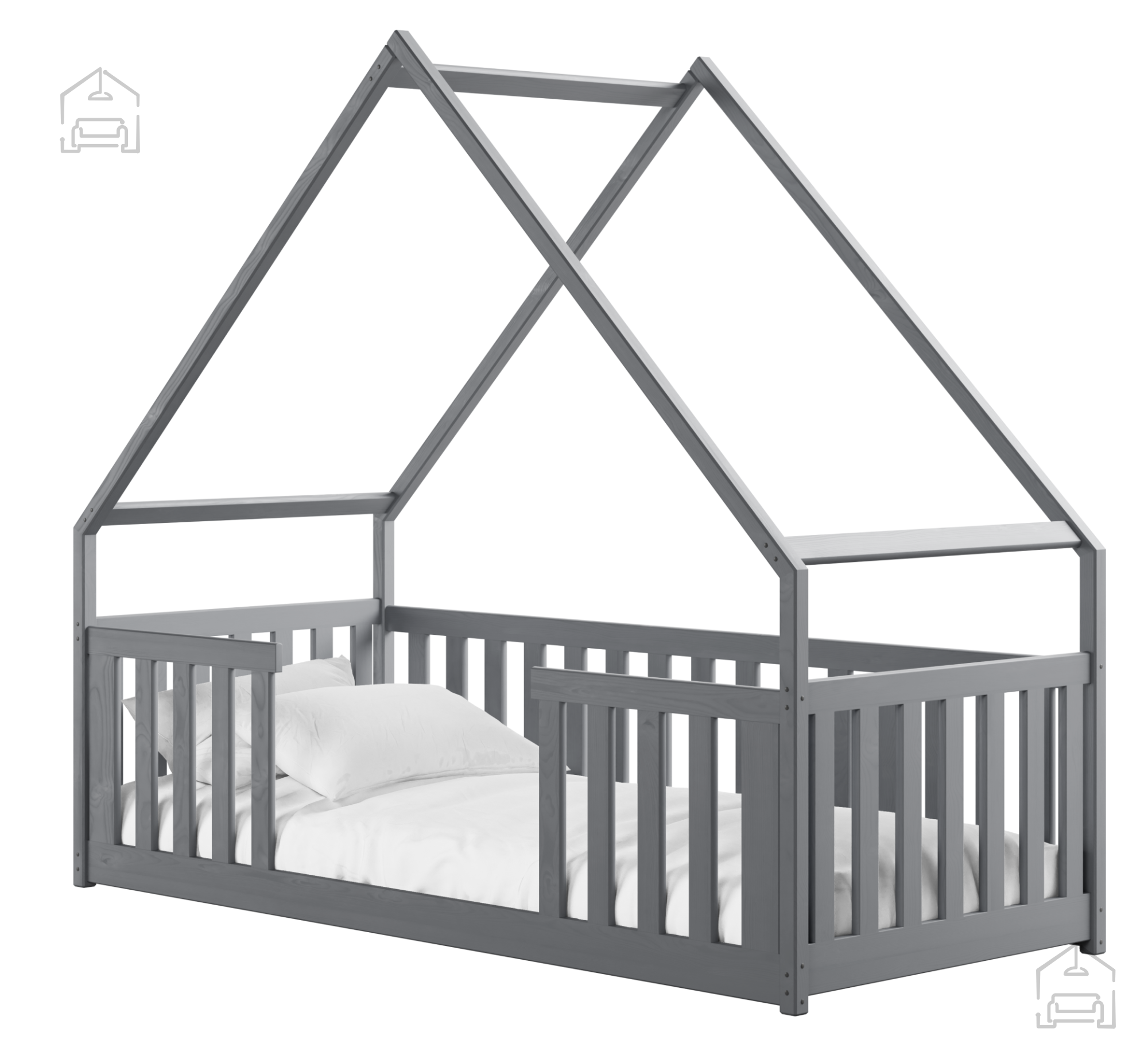 Postelja hiška Bee je na voljo v več barvnih kombinacijah, kar omogoča enostavno prilagajanje dekorju sobe. Izbirate lahko med odtenki bela, bor, grafit, siva, kašmir, olive in krem. Vsaka barva ima svoj značaj – bela prinaša svežino in zračnost, bor poudari naravni videz lesa, siva in grafit dodata sodoben pridih, medtem ko barve kašmir, olive in krem v prostor vnesejo toplino ter občutek nežnosti. Površina je obdelana s kakovostnimi premazi, varnimi za otroke in odporna proti praskam ter obrabi.