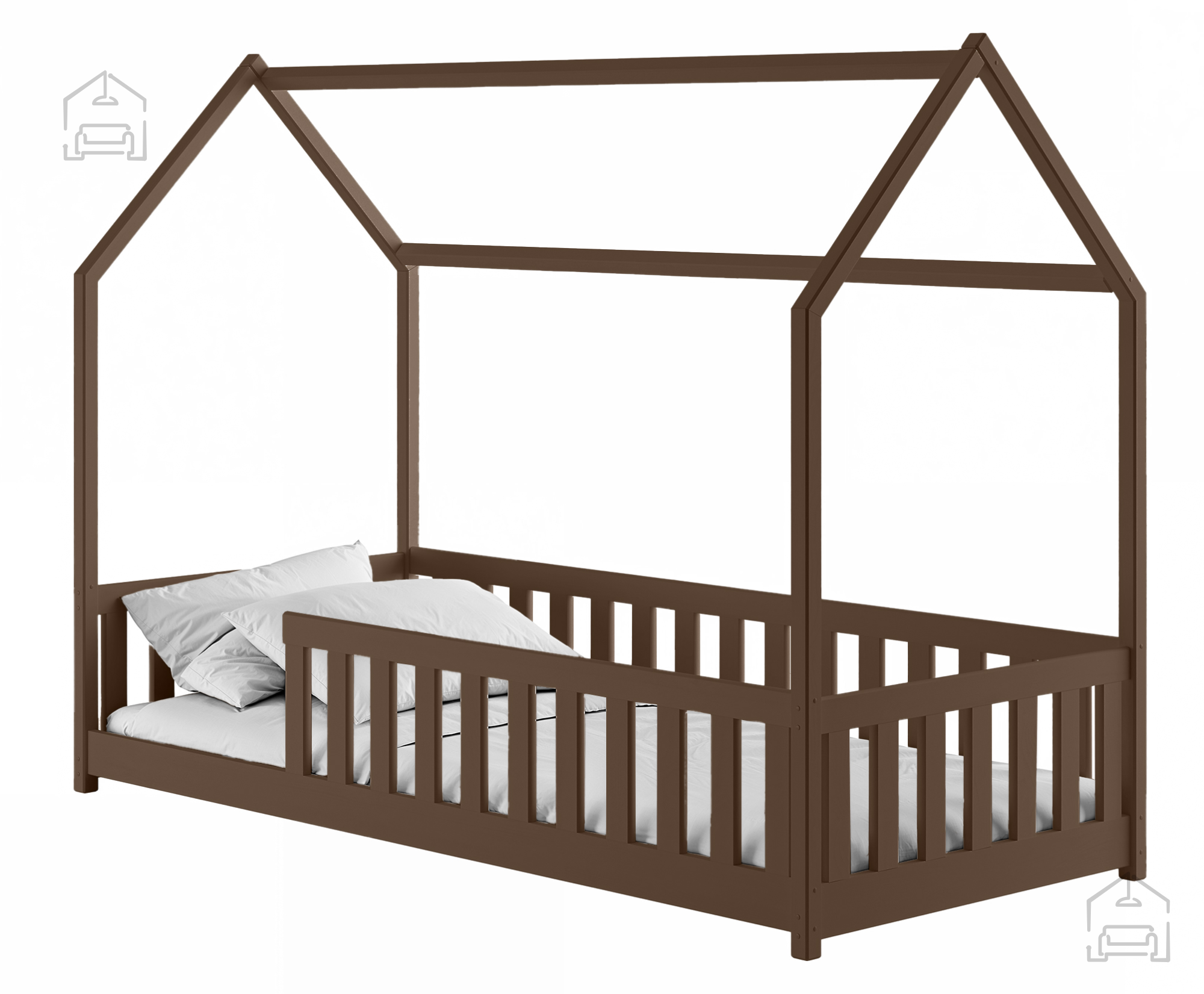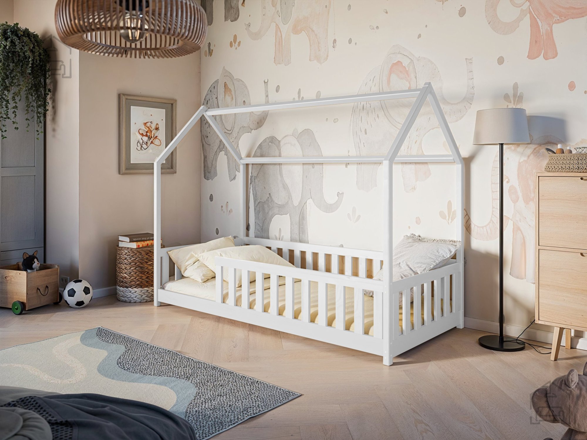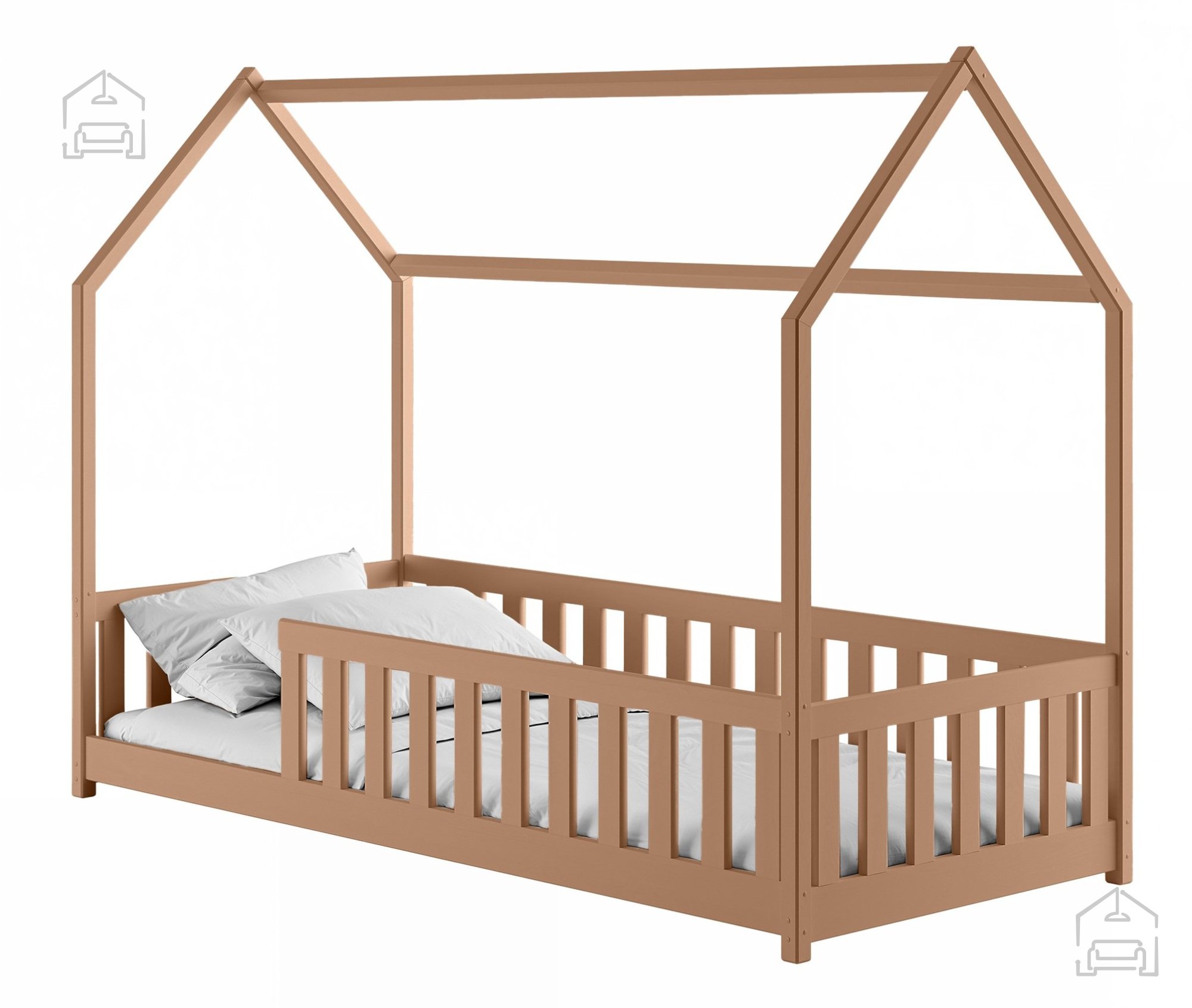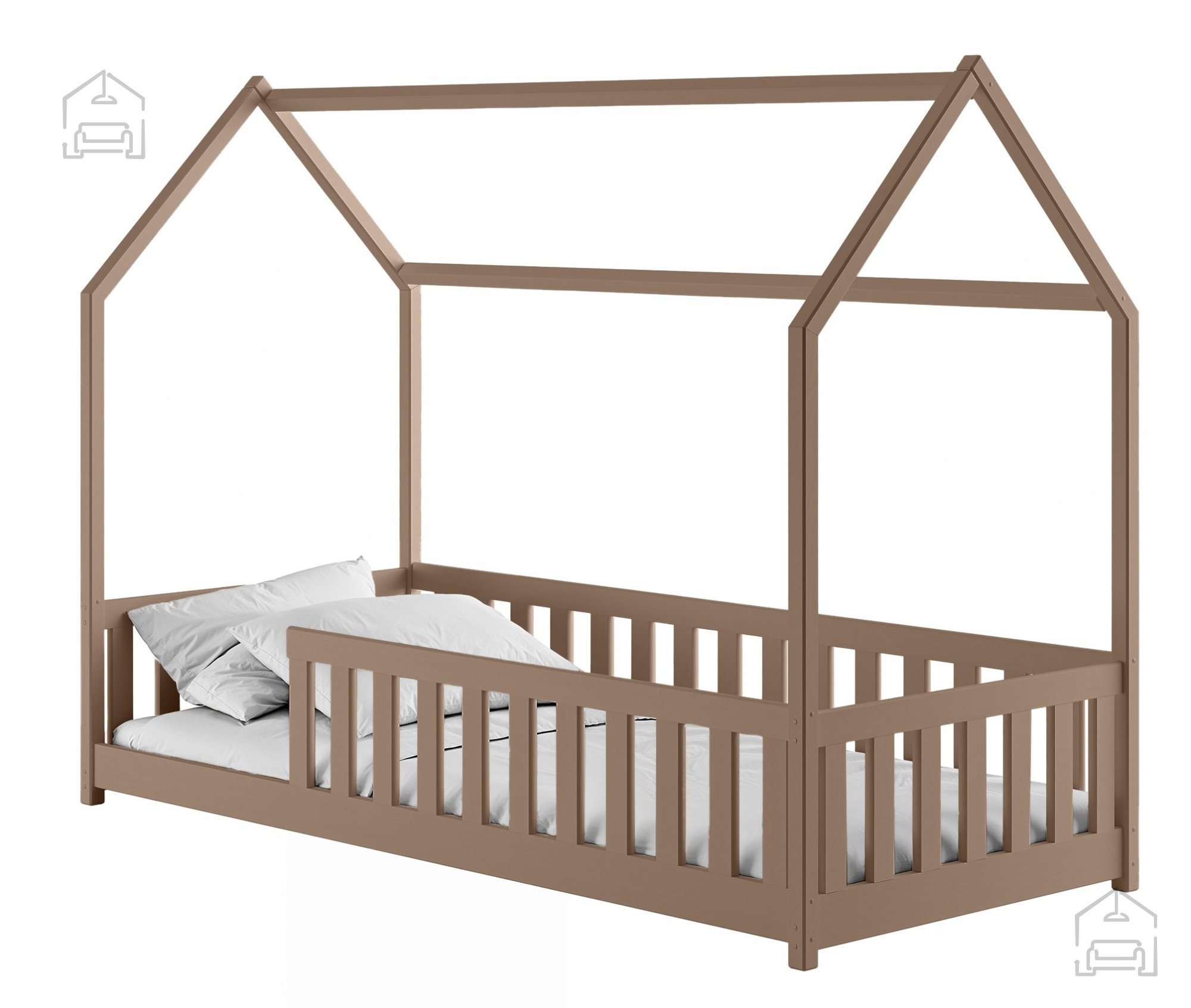 Otroška postelja hiška Noan – Lano je prikupna in hkrati funkcionalna izbira za vsako otroško sobo. Izdelana je iz trpežnega borovega lesa, ki zagotavlja naravno toplino, stabilnost in dolgo življenjsko dobo. Zasnova v obliki hiške ustvarja prijeten in domiseln prostor, v katerem lahko otrok spi, bere ali se igra, hkrati pa spodbuja domišljijo in občutek varnosti. Postelja je na voljo v številnih barvnih odtenkih – od klasične bele, bora in sive do tople mlečne ali temne čokolade, cimetove, kašmir, olive in krem barve. Tako se popolnoma prilagodi različnim slogom otroških sob, ne glede na to, ali želite svetel skandinavski videz ali prijetno rustikalno vzdušje.