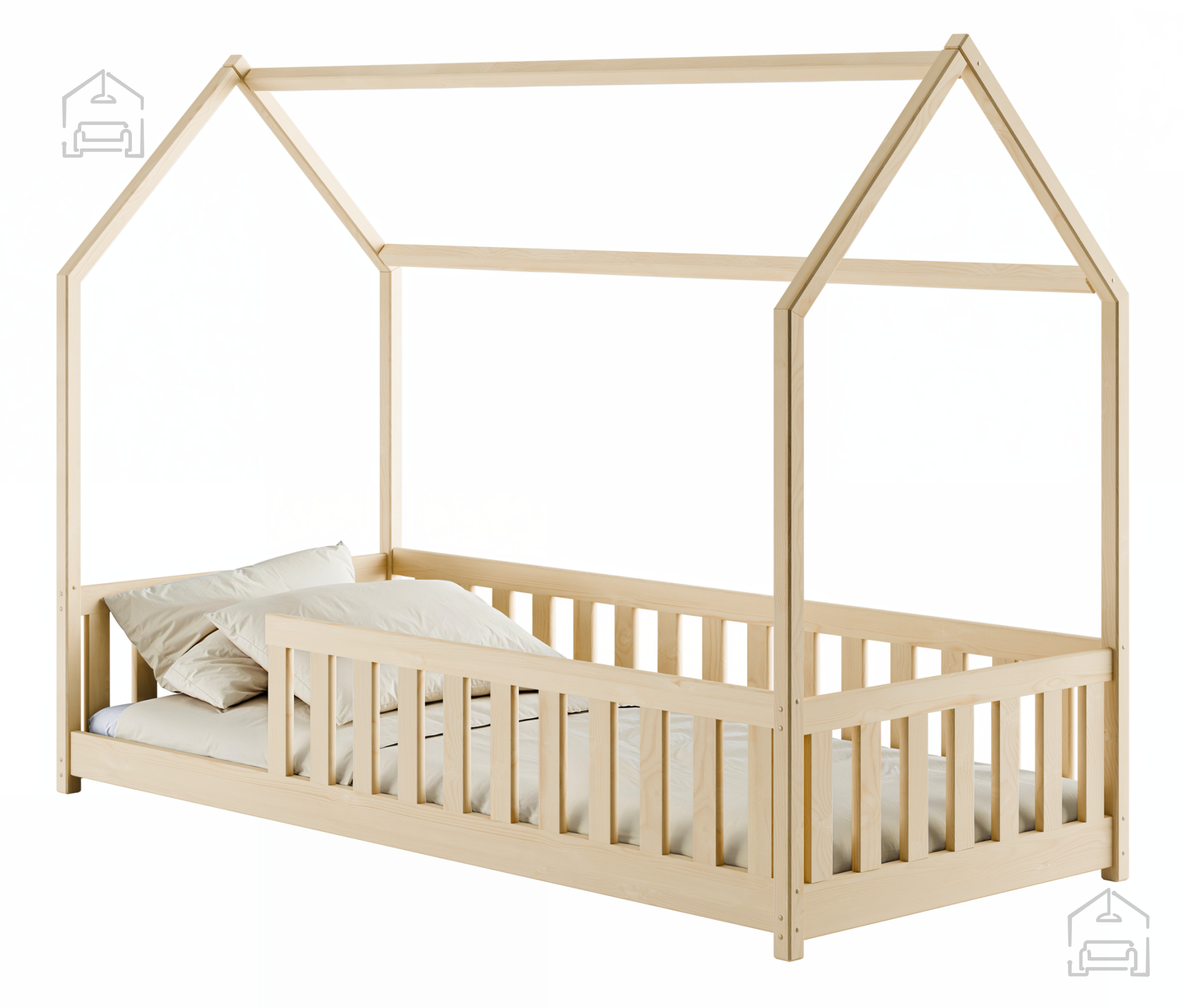 Postelja Noan je zasnovana z mislijo na varnost in udobje otrok. Na voljo je v dveh velikostih ležišča – 80x180 cm in 90x200 cm – kar omogoča izbiro glede na starost in prostor v sobi. Fiksna pregrada, ki je vključena v ceno, preprečuje, da bi otrok ponoči zdrsnil s postelje, hkrati pa dopolnjuje videz hiške. Nosilnost do 100 kg zagotavlja stabilnost in varnost tudi pri vsakodnevni uporabi. Postelja je opremljena z letvenim dnom, ki omogoča dobro zračenje vzmetnice in podpira zdrav spanec. Vzmetnica ni vključena v ceno, kar omogoča, da starši izberejo model po meri otrokovega udobja in potreb.