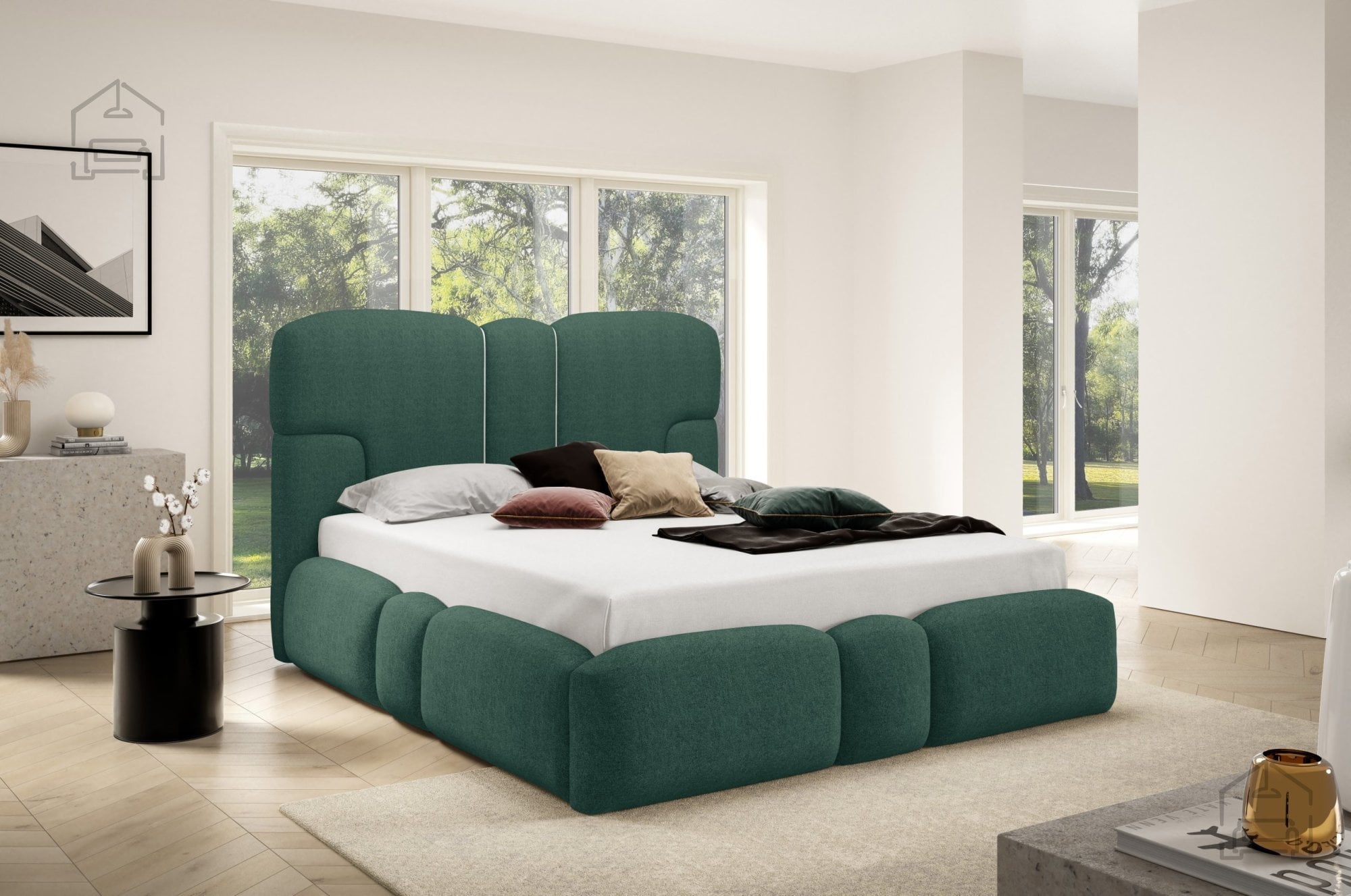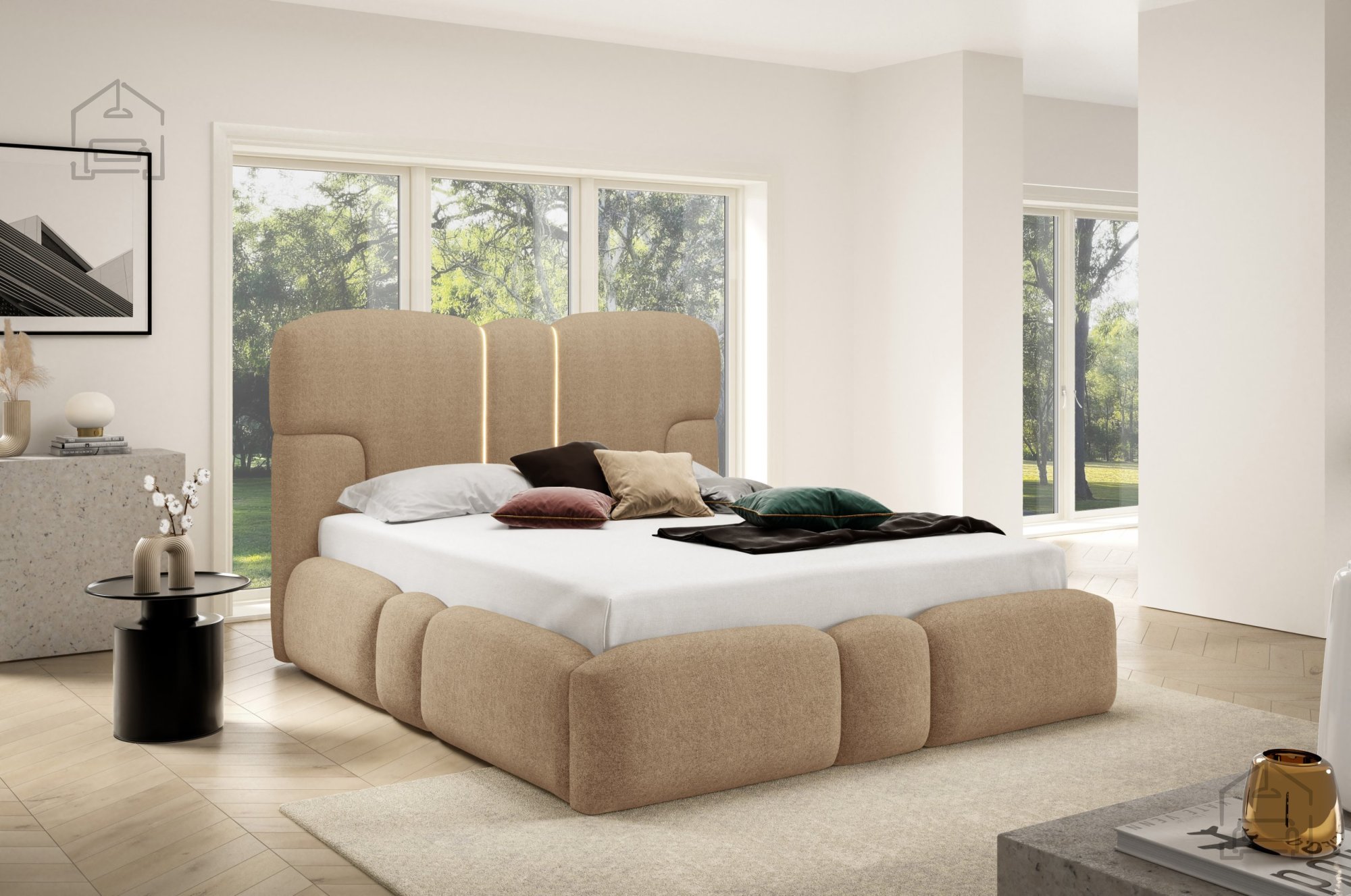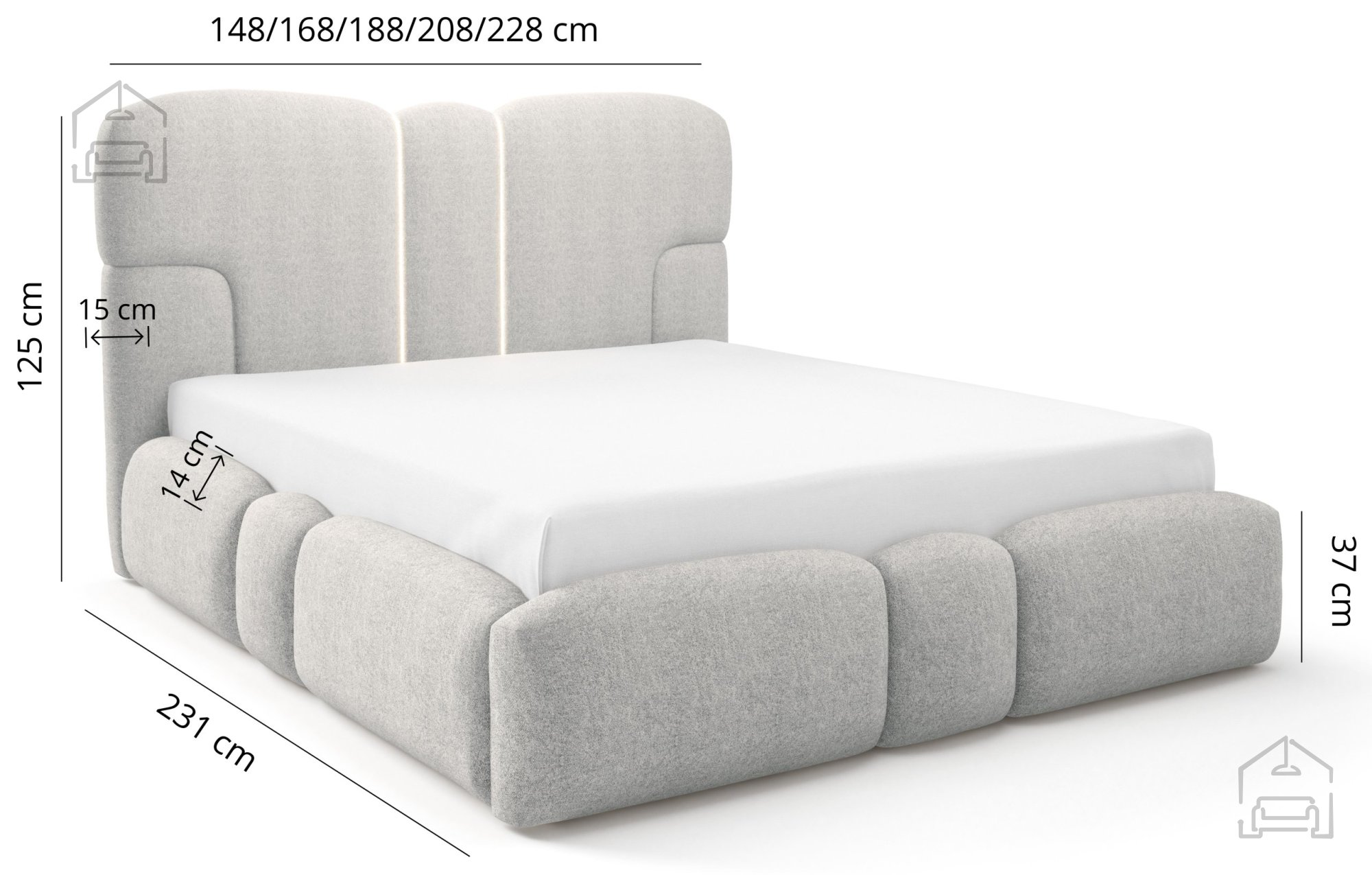 Poseben poudarek je namenjen LED osvetlitvi, ki je integrirana v konstrukcijo postelje. S priloženim daljinskim upravljalnikom lahko po želji nastavljate svetlobne učinke in intenzivnost. Svetloba ni le dekorativni element, temveč tudi praktična rešitev, saj omogoča prijetno osvetlitev prostora brez potrebe po dodatnih svetilih. To ustvarja sproščujočo atmosfero in hkrati poudari elegantno obliko postelje.