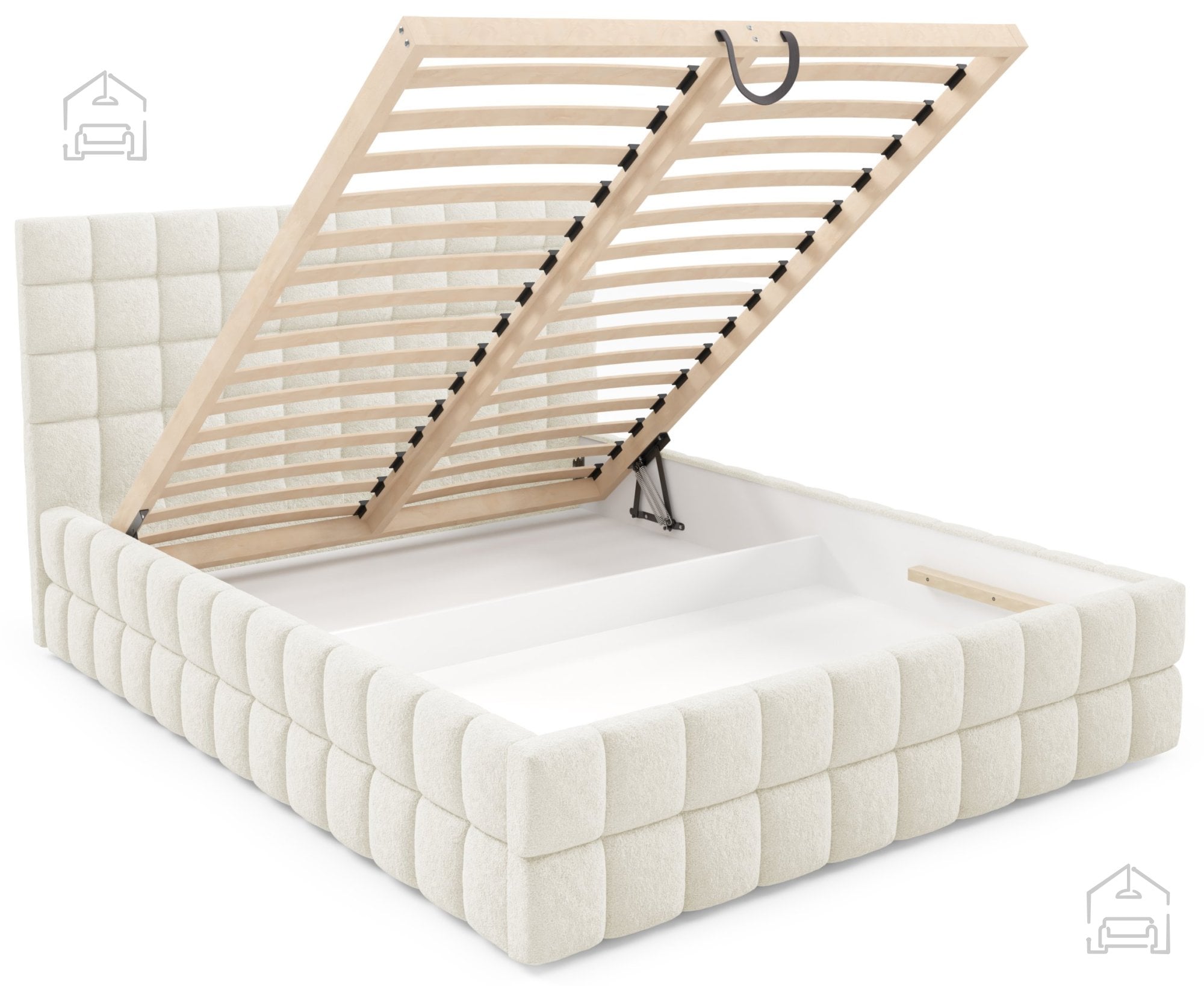 Vgrajen dvižni mehanizem z vzmetnim odpiranjem omogoča enostavno dviganje ležišča in dostop do prostornega predala za posteljnino. To je še posebej priročno za shranjevanje odej, blazin ali sezonskih oblačil. Mehanizem deluje gladko in tiho, kar povečuje udobje pri uporabi.