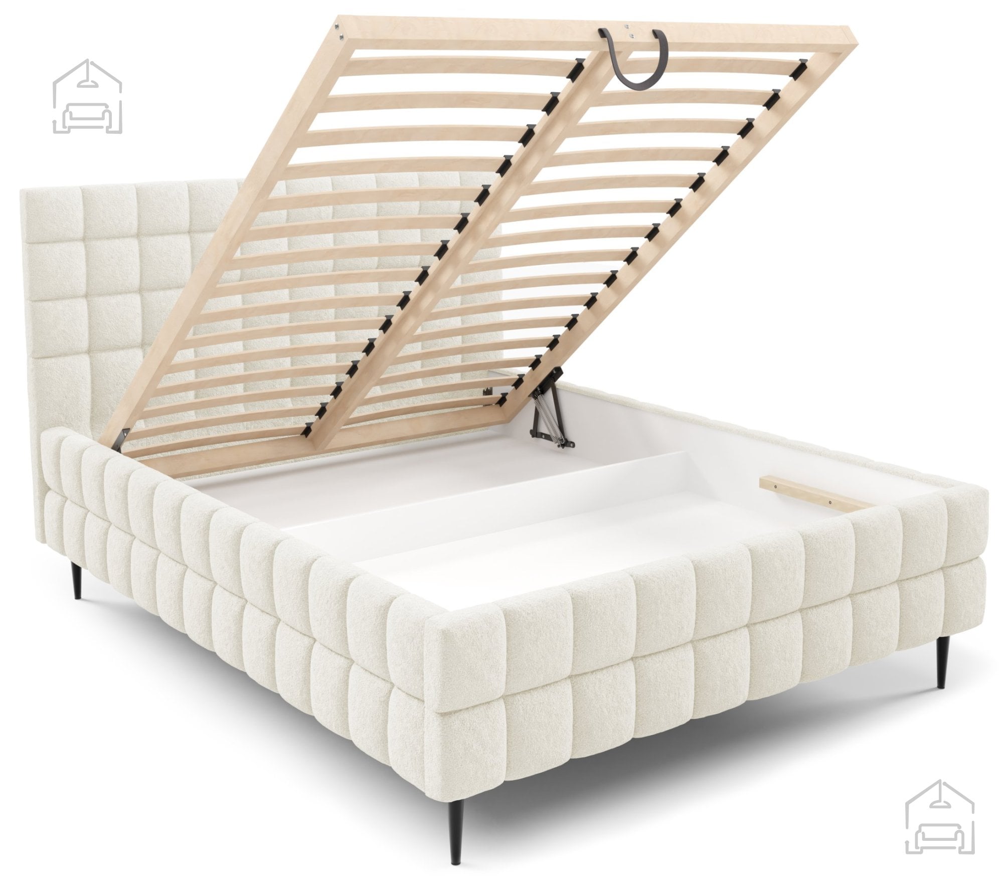 Ena izmed ključnih prednosti postelje Ardea je njena praktična zasnova s predalom za posteljnino. Pod ležiščem se skriva prostoren predal, ki omogoča shranjevanje odej, blazin ali sezonskih oblačil. Dostop do predala je preprost, saj ima postelja vgrajen dvižni mehanizem z vzmetnim odpiranjem, ki omogoča lahkotno dvigovanje ležišča brez napora. Ta mehanizem zagotavlja, da je vsakodnevna uporaba enostavna in zanesljiva, hkrati pa ohranja čistočo in red v spalnici.