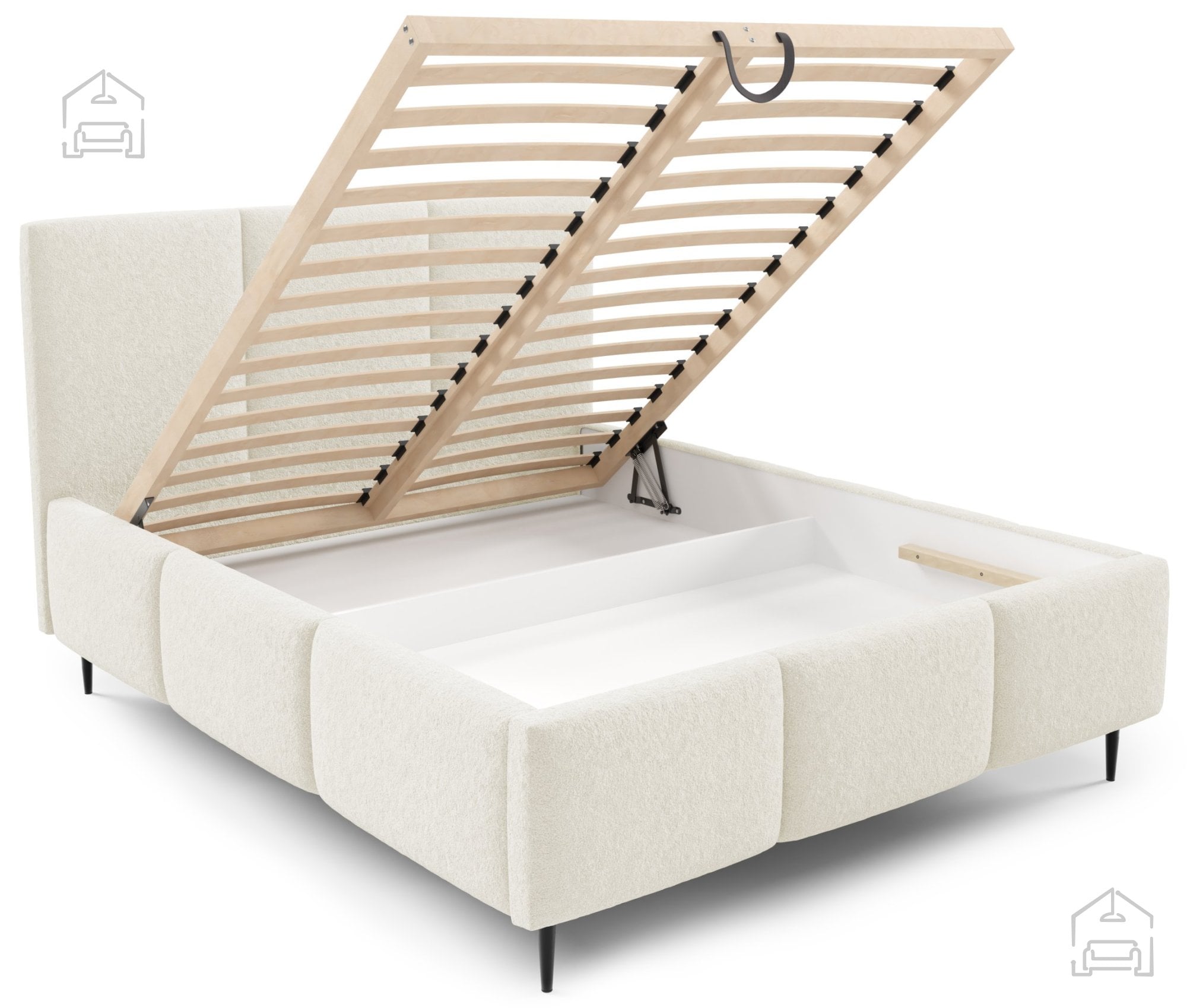 Ena ključnih prednosti postelje Velora je vgrajen dvižni mehanizem z vzmetnim odpiranjem. Ta omogoča enostaven dostop do prostornega predala za posteljnino, ki se nahaja pod ležiščem. Z eno potezo lahko dvignete ležišče in shranite odeje, blazine ali sezonska oblačila – brez napora in s stabilnim odpiranjem. Takšna rešitev je posebej uporabna v manjših spalnicah, kjer je vsak dodaten prostor za shranjevanje dobrodošel.