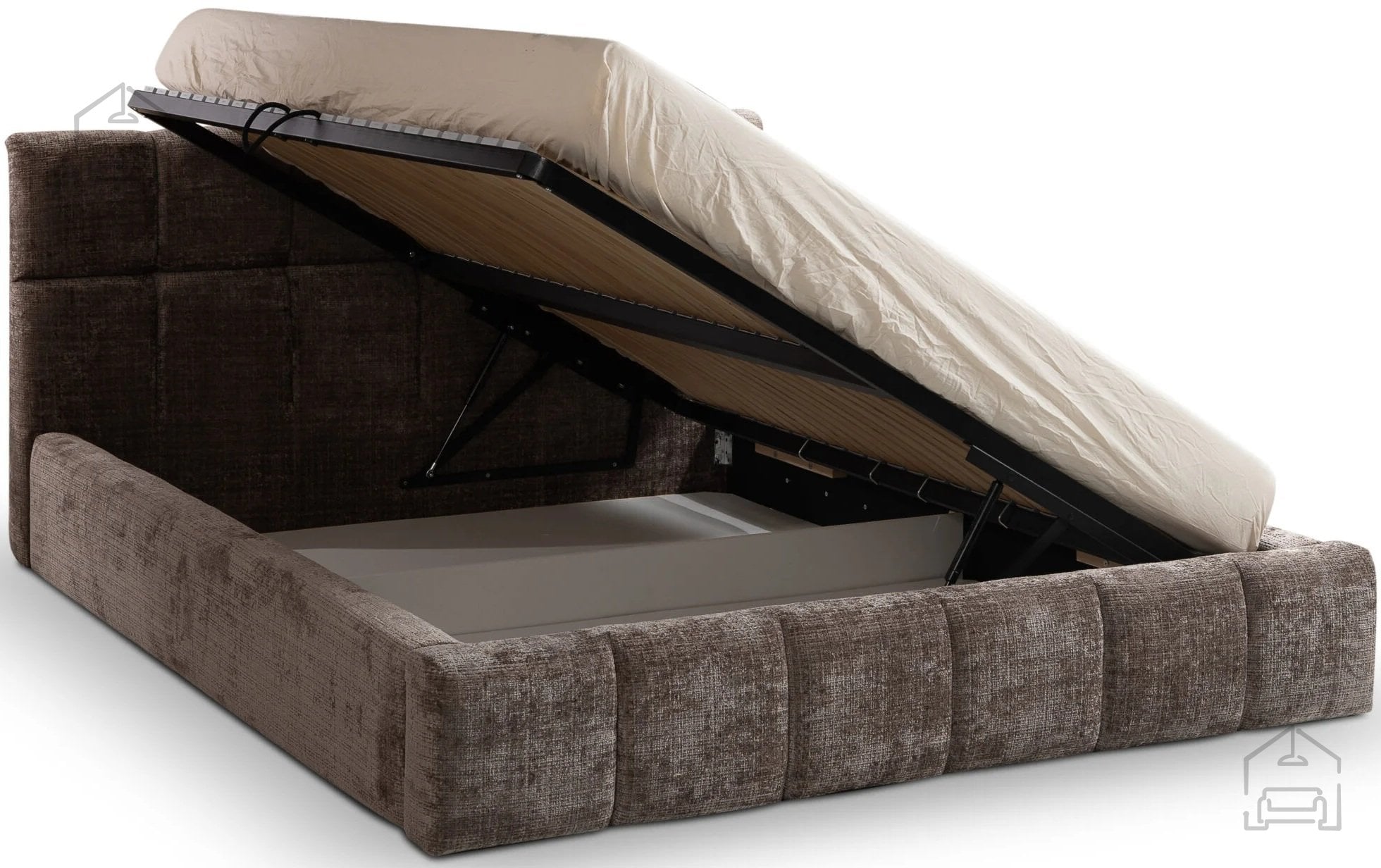 Okvir postelje je izdelan iz lesa, kar zagotavlja stabilnost in dolgo življenjsko dobo. Leseni deli so precizno obdelani, da se popolnoma ujemajo s kovinskimi elementi dvižnega mehanizma. Površina postelje je oblečena v izbrano tkanino, ki je prijetna na dotik ter odporna proti obrabi. Takšna kombinacija materialov poskrbi za elegantno podobo in trdno konstrukcijo.