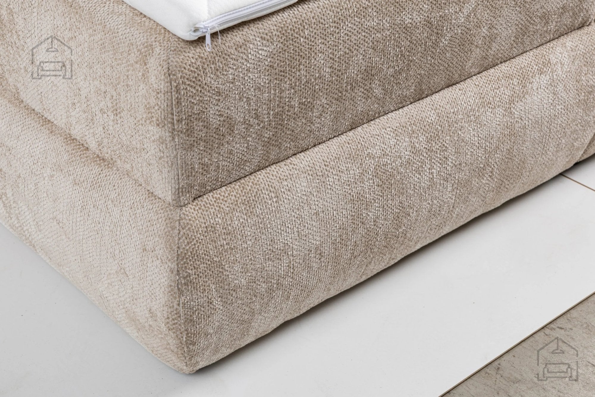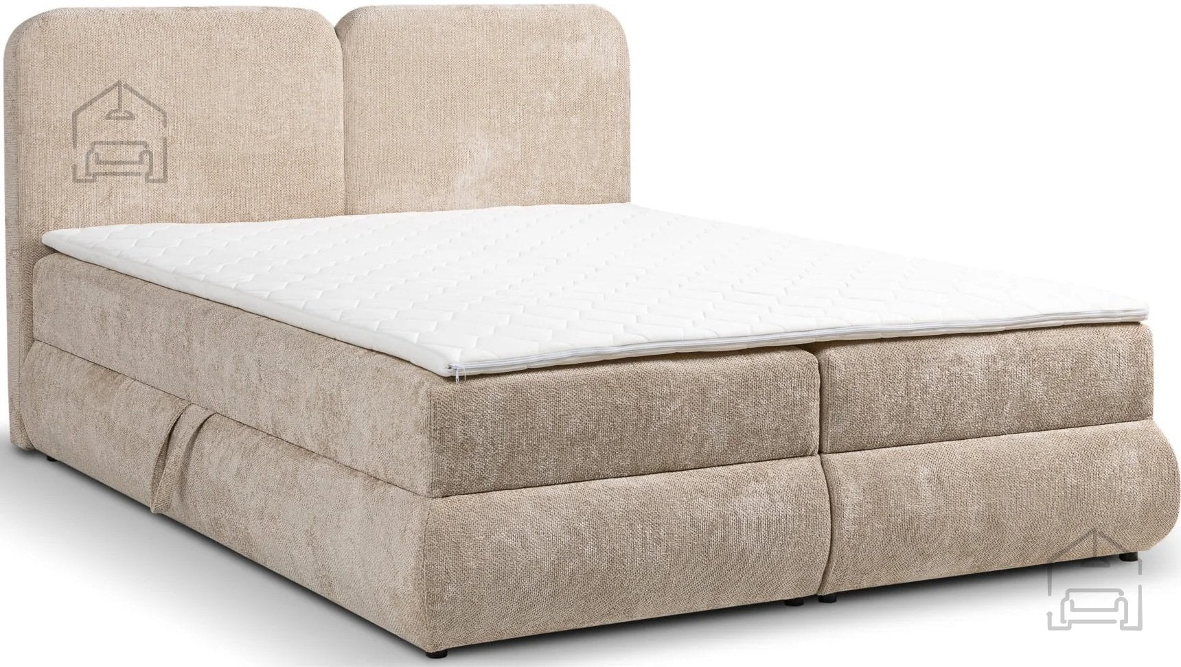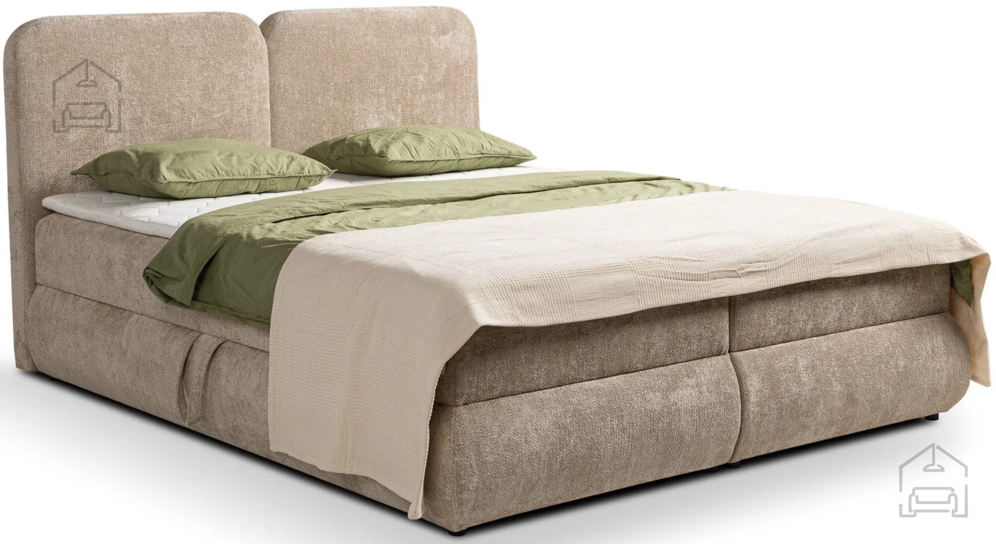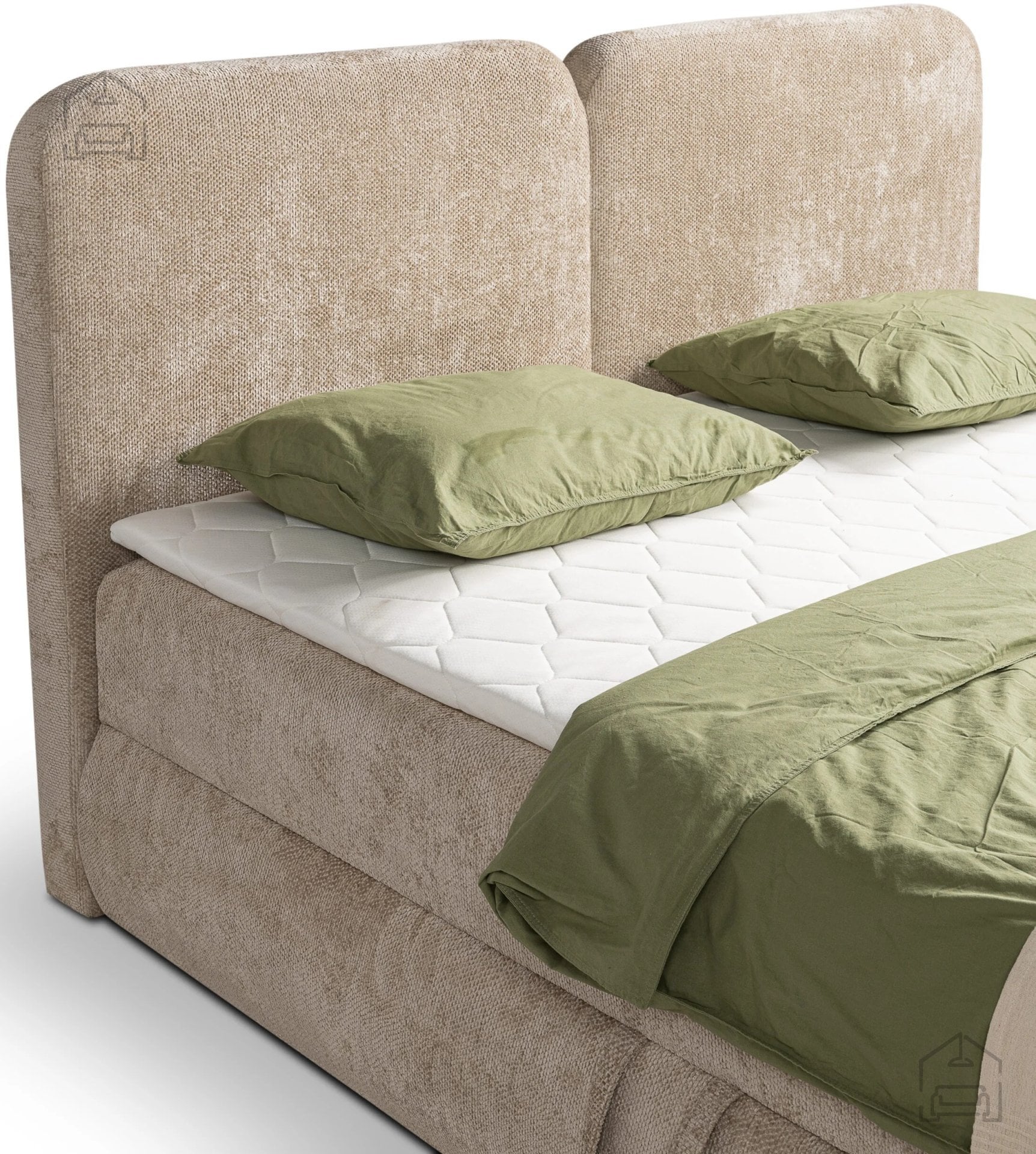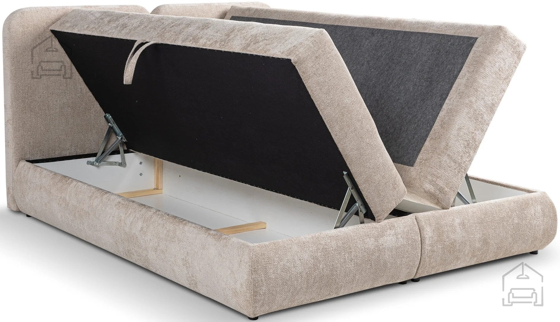 Osnova postelje je izdelana iz bora in kakovostnega iverala, kar zagotavlja stabilnost in dolgo življenjsko dobo. Ležalni del sestavljata visoko elastična pena in PUR pena, ki skupaj tvorita udobno površino za spanje, hkrati pa omogočata pravilno podporo hrbtenici. Zunanjost je oblečena v prijetno tkanino, ki prostoru doda toplino in domačnost. Tapeciran okvir daje postelji razkošen videz ter omogoča lažje ujemanje z različnimi stili notranje opreme.