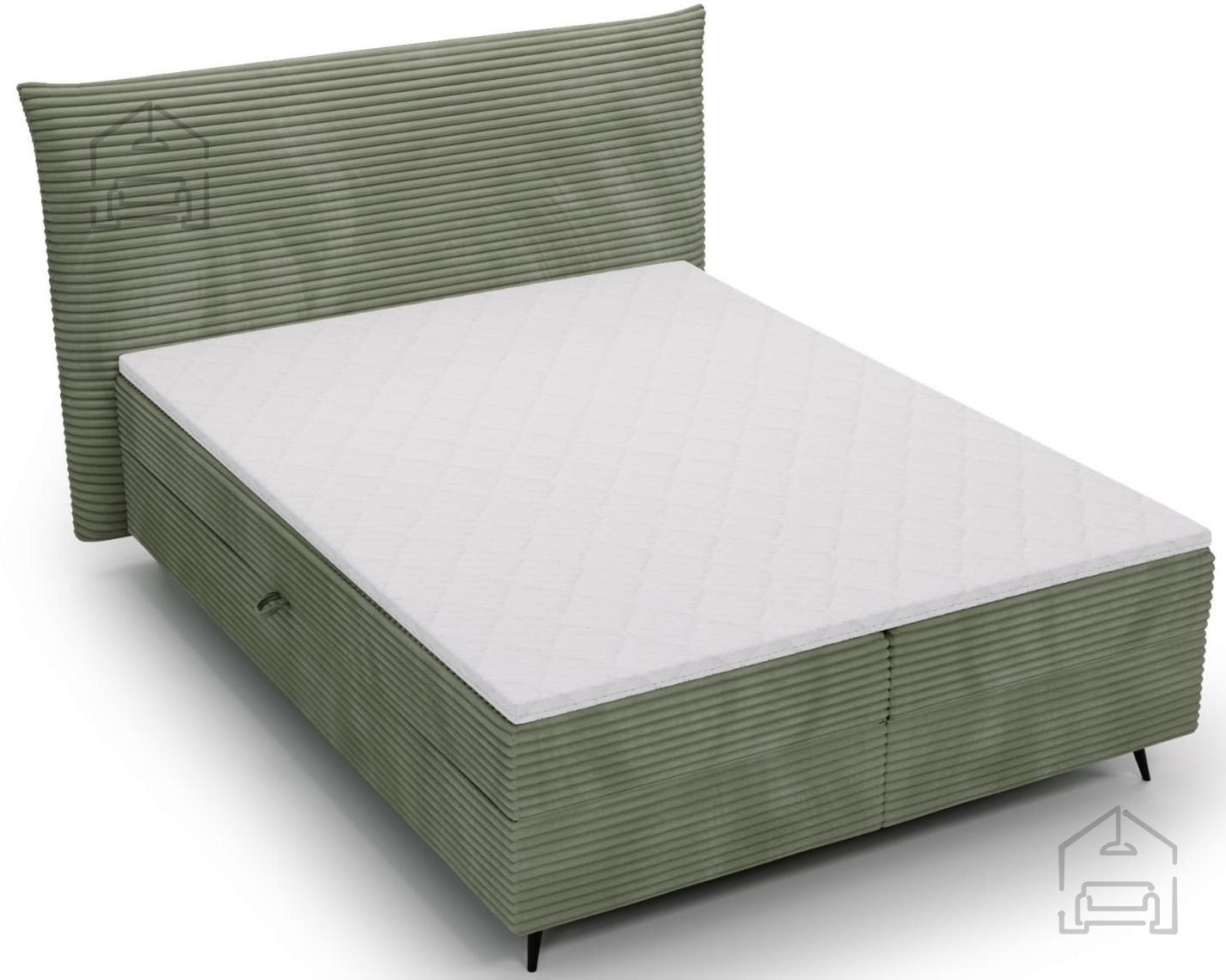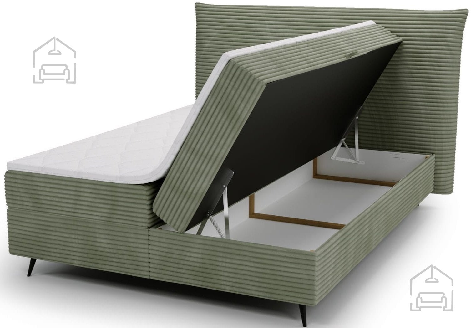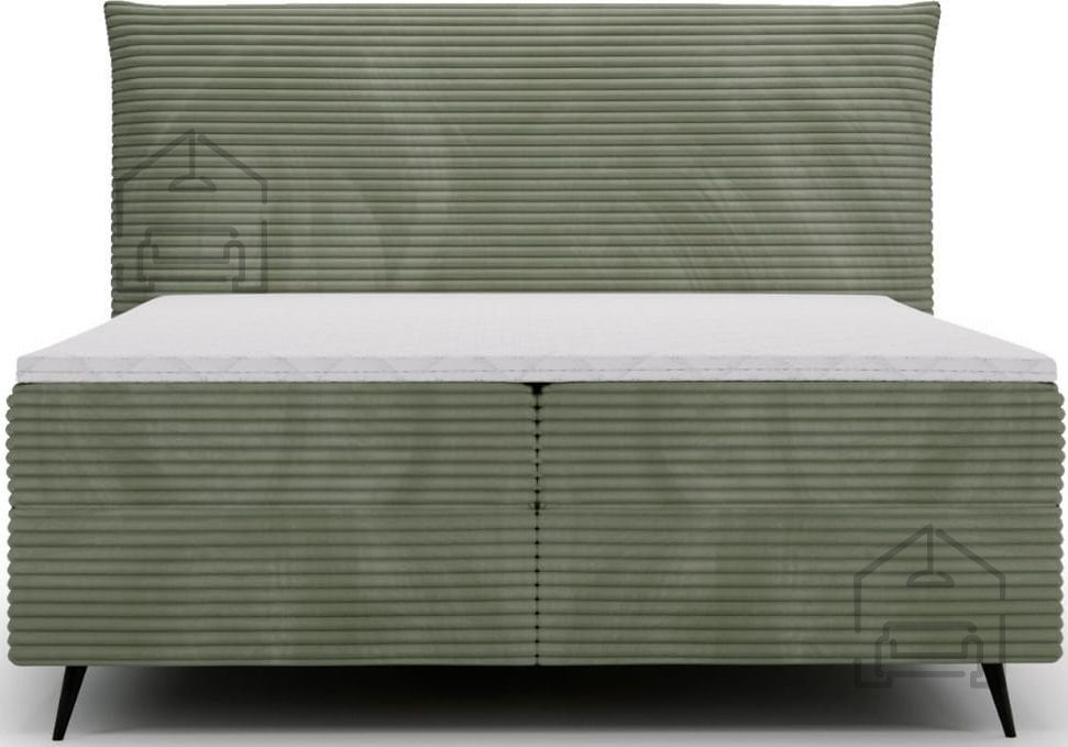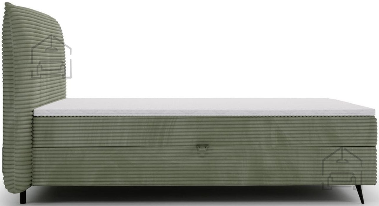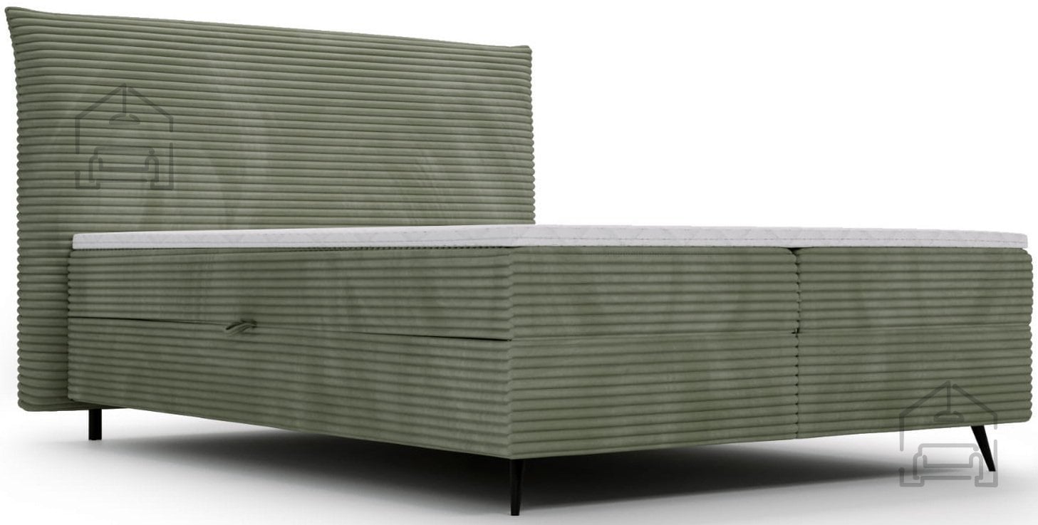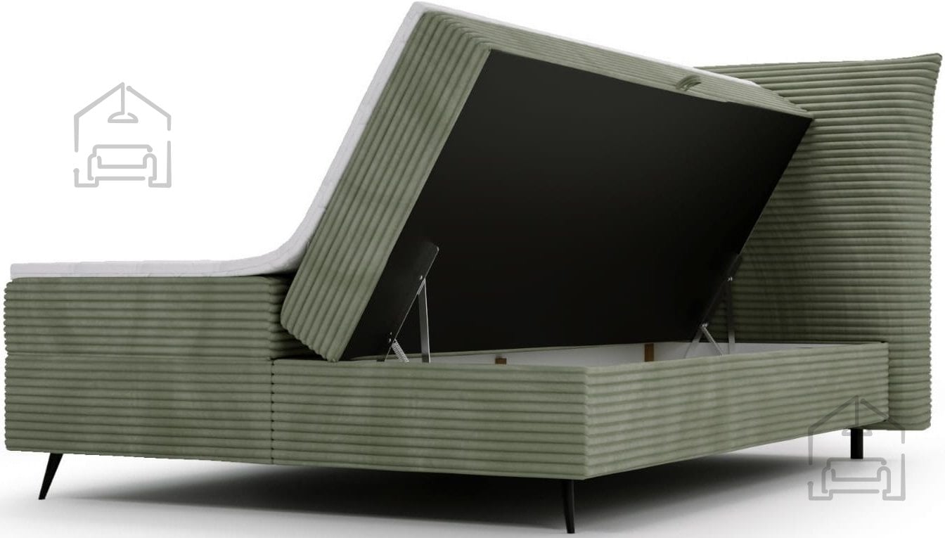 Okvir postelje je izdelan iz kovinskih elementov in kakovostne tkanine, kar zagotavlja dolgo življenjsko dobo. Kovinska nosilna struktura izboljšuje stabilnost, medtem ko tapecirani deli mehčajo videz in dodajo občutek topline. Postelja je brez letvenega dna, saj njeno delovanje temelji na boxspring sistemu, kjer vzmeteno jedro prevzame funkcijo elastične podpore. Zaradi tega je ležišče enakomerno podprto po celotni površini, kar zmanjšuje točkovne pritiske in izboljšuje udobje spanja.