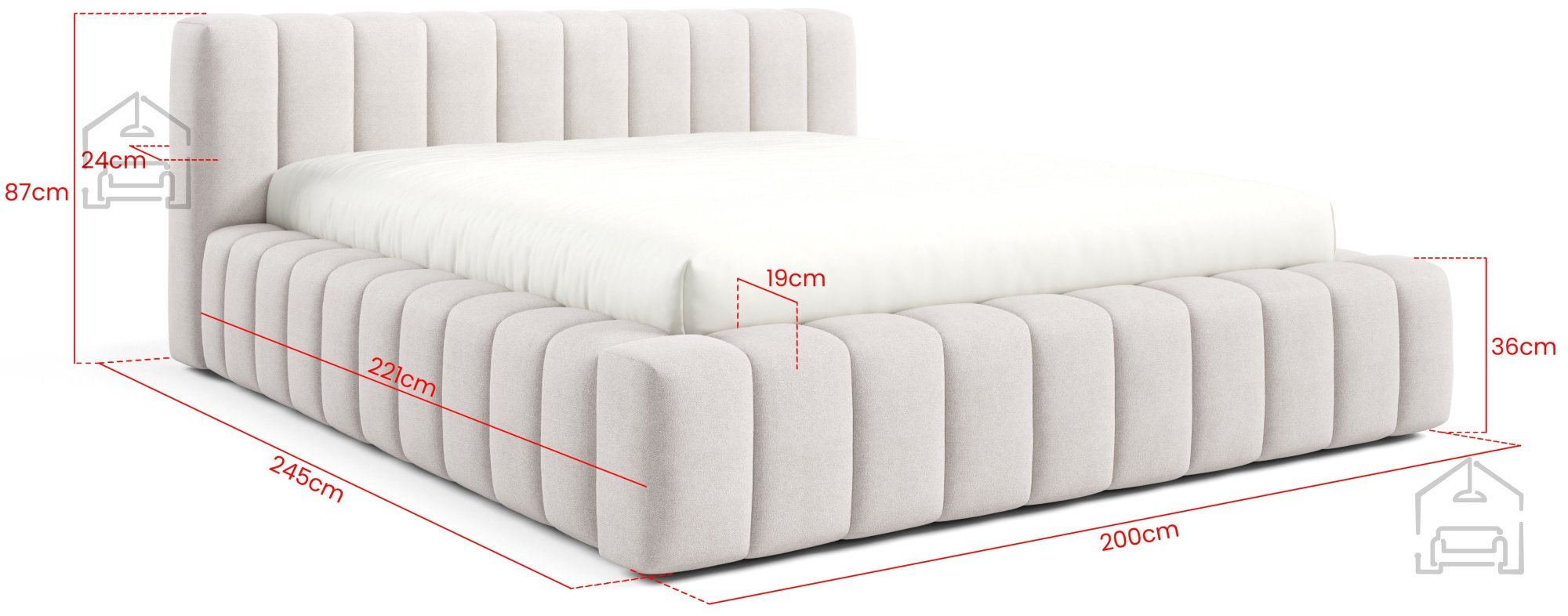 Celotne dimenzije postelje znašajo 245x87 cm, pri čemer višina vzglavja meri 87 cm, višina bočnice 36 cm, debelina bočnice 19 cm, debelina vzglavja 24 cm, višina nožic pa 1 cm (drsniki). Na voljo je v različnih širinah ležalne površine: 160 pri dolžini 200 cm. Uporabnik lahko izbira med različnimi barvnimi kombinacijami in vrstami tkanin, kar omogoča popolno prilagoditev notranjemu slogu spalnice.