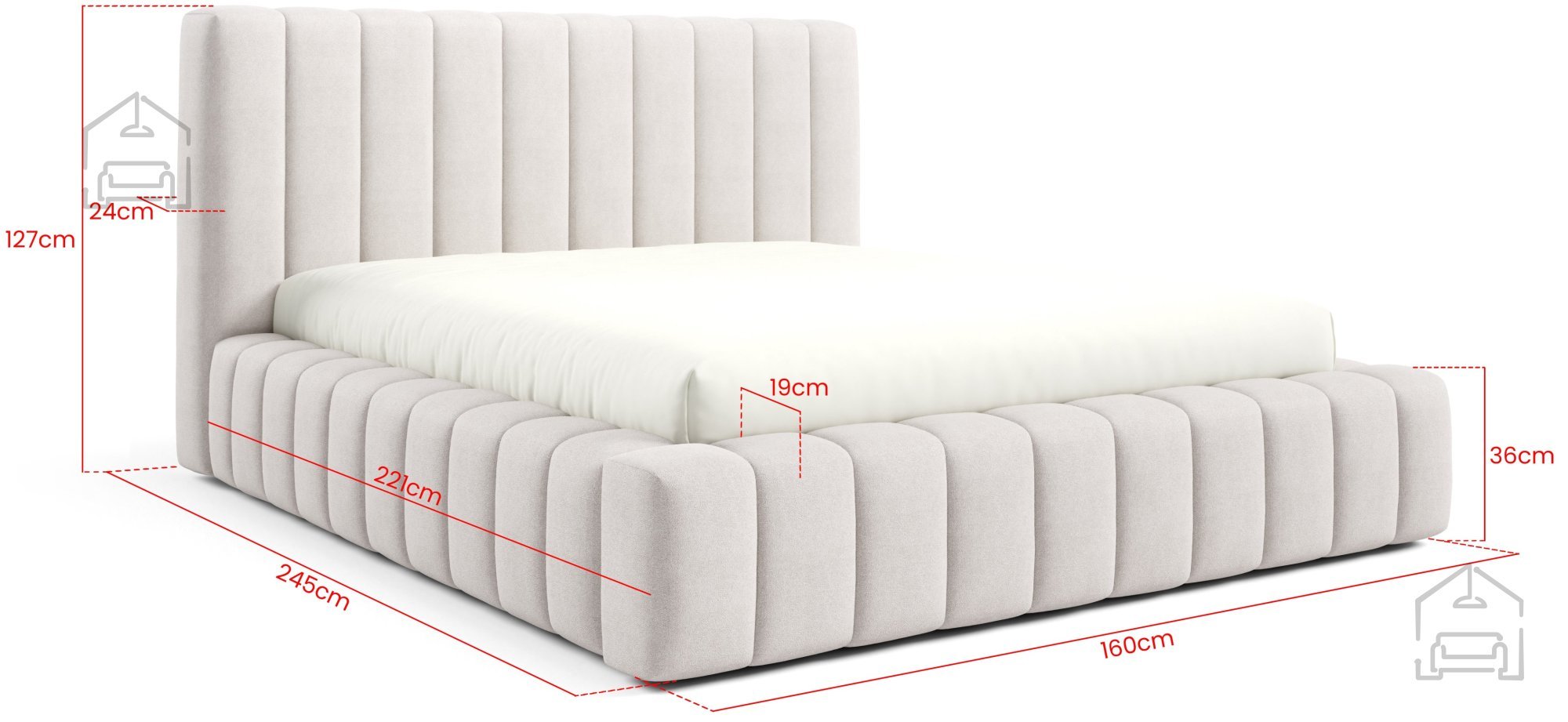 Celotne dimenzije postelje znašajo 245x127 cm, pri čemer višina vzglavja meri 127 cm, višina bočnice 36 cm, debelina bočnice 19 cm, debelina vzglavja 24 cm, višina nožic pa 1 cm (drsniki). Na voljo je v različnih širinah ležalne površine: 120 pri dolžini 200 cm. Uporabnik lahko izbira med različnimi barvnimi kombinacijami in vrstami tkanin, kar omogoča popolno prilagoditev notranjemu slogu spalnice.