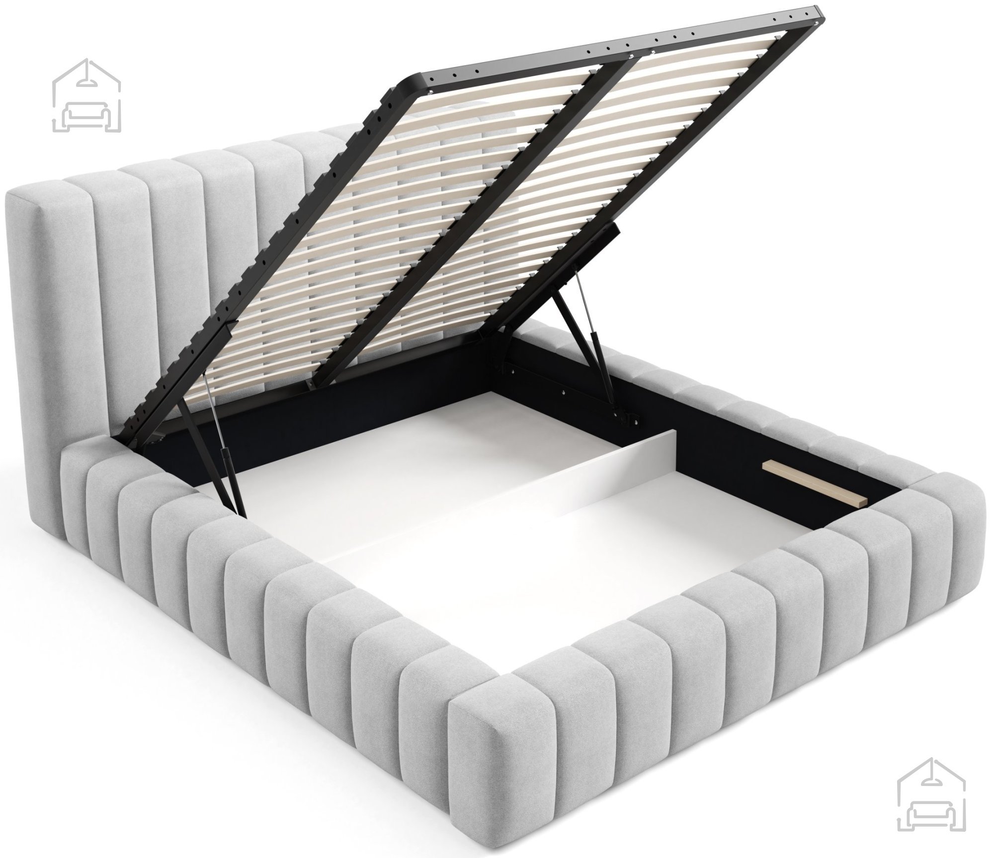 Obe različici omogočata enostavno dviganje ležišča in prost dostop do notranjega prostora. Maksimalna nosilnost postelje znaša 200 kg, kar zagotavlja varno in stabilno uporabo tudi pri večjih dimenzijah ležišča.