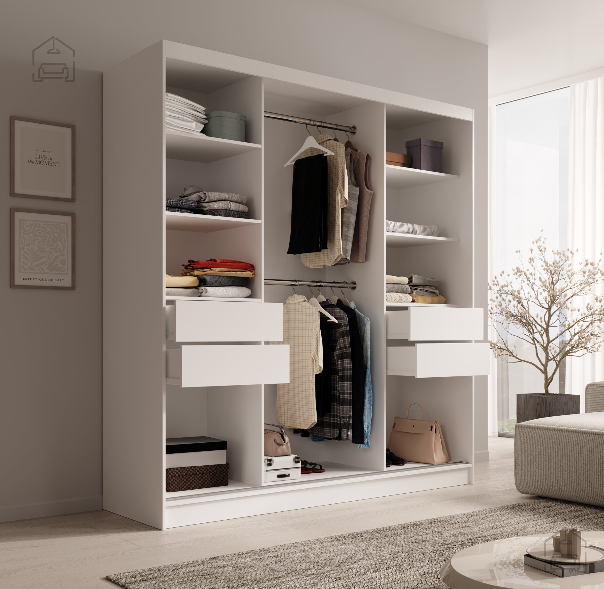 Drsna omara Keri je zasnovana z mislijo na uporabnika. Njena premišljena konstrukcija omogoča enostavno shranjevanje in organizacijo vaših oblačil ter dodatkov. S širokimi drsnimi vrati je dostop do vaših stvari hiter in enostaven, kar pomeni, da boste prihranili čas in prostor.
