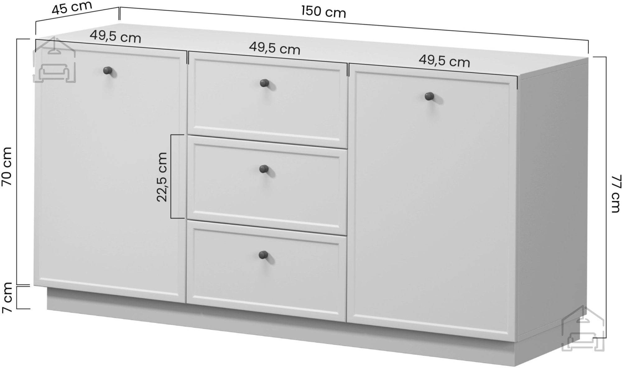 Komoda zagotavlja dovolj prostora za shranjevanje različnih predmetov – od tekstila, dokumentov do dekorativnih dodatkov. Zaradi svoje širine ponuja stabilno zgornjo površino, ki jo lahko uporabite za postavitev ogledala, svetilke, rastline ali drugih dekorativnih elementov. Njena višina je prilagojena prijetni ergonomiji, zato je dostop do vsebine priročen tudi v vsakodnevni uporabi.