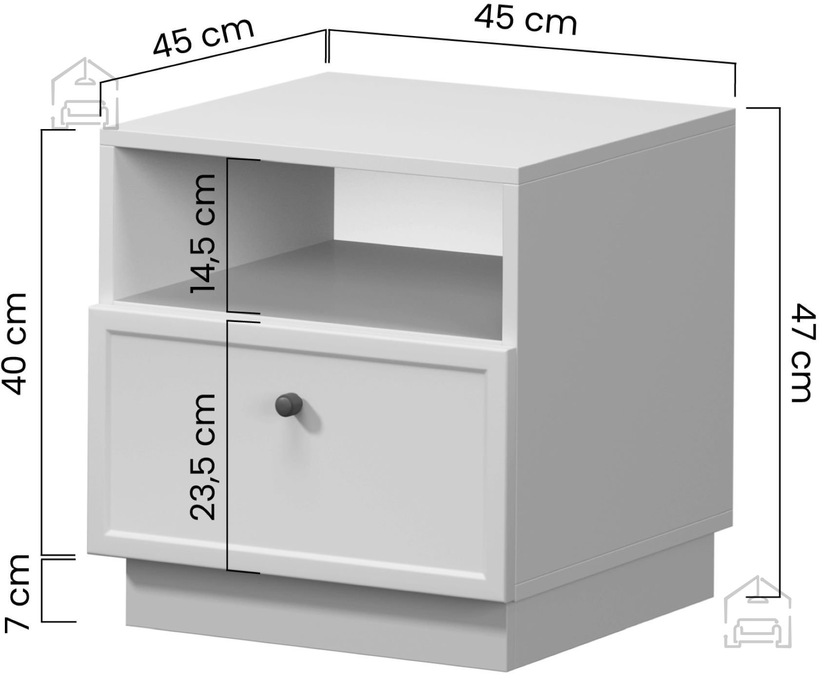 Omarica meri 45 cm v širino, 45 cm v globino in 47 cm v višino. Kompaktne mere omogočajo, da se prilega ob posteljo v manjših ali večjih spalnicah. Zaradi čokla je stabilna in ne potrebuje dodatnih nastavkov, kar olajša postavitev tudi na preproge ali trše talne obloge. Ravna zgornja plošča ponuja dovolj prostora za namizno svetilko, budilko ali dekorativne predmete.