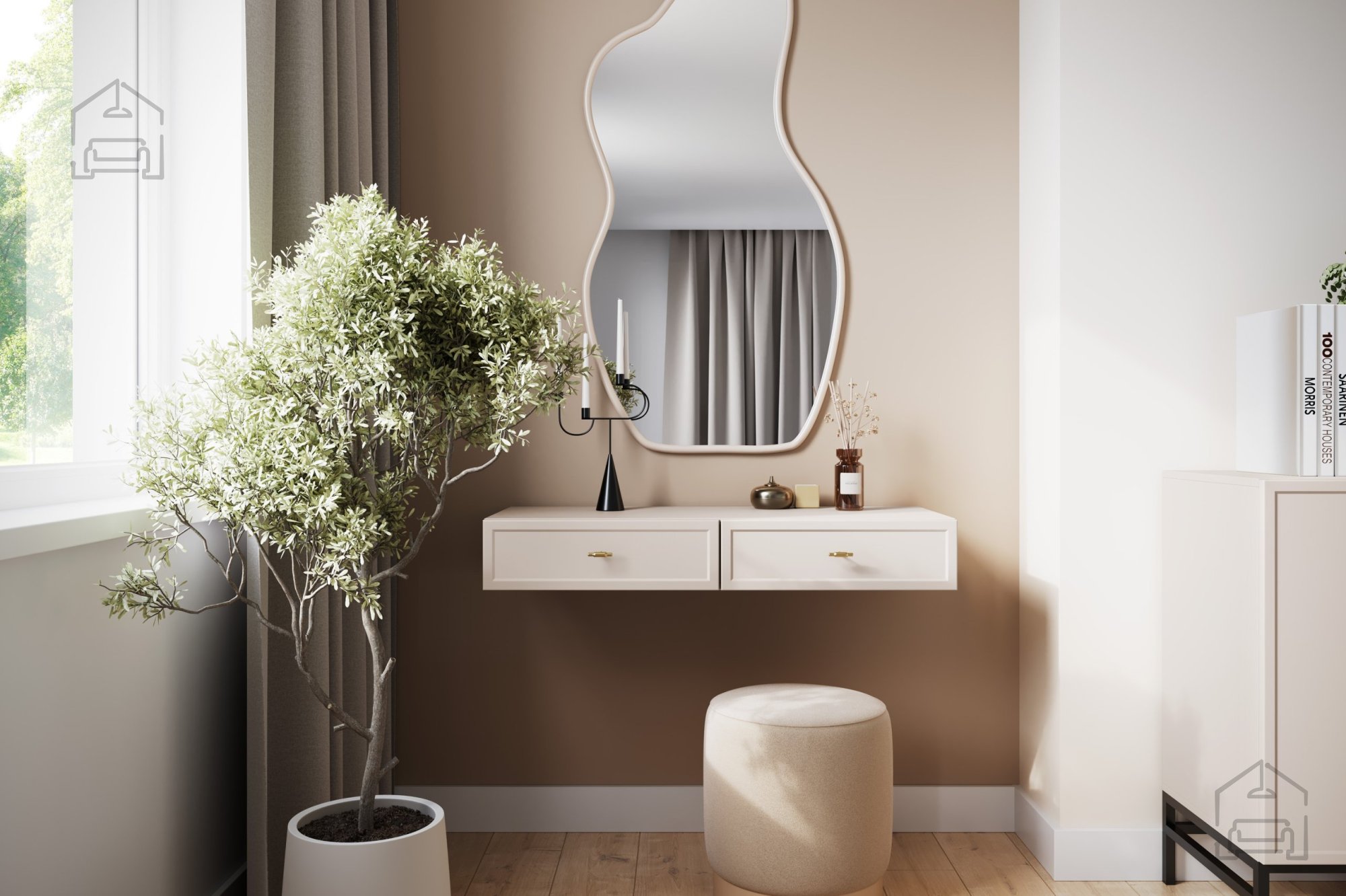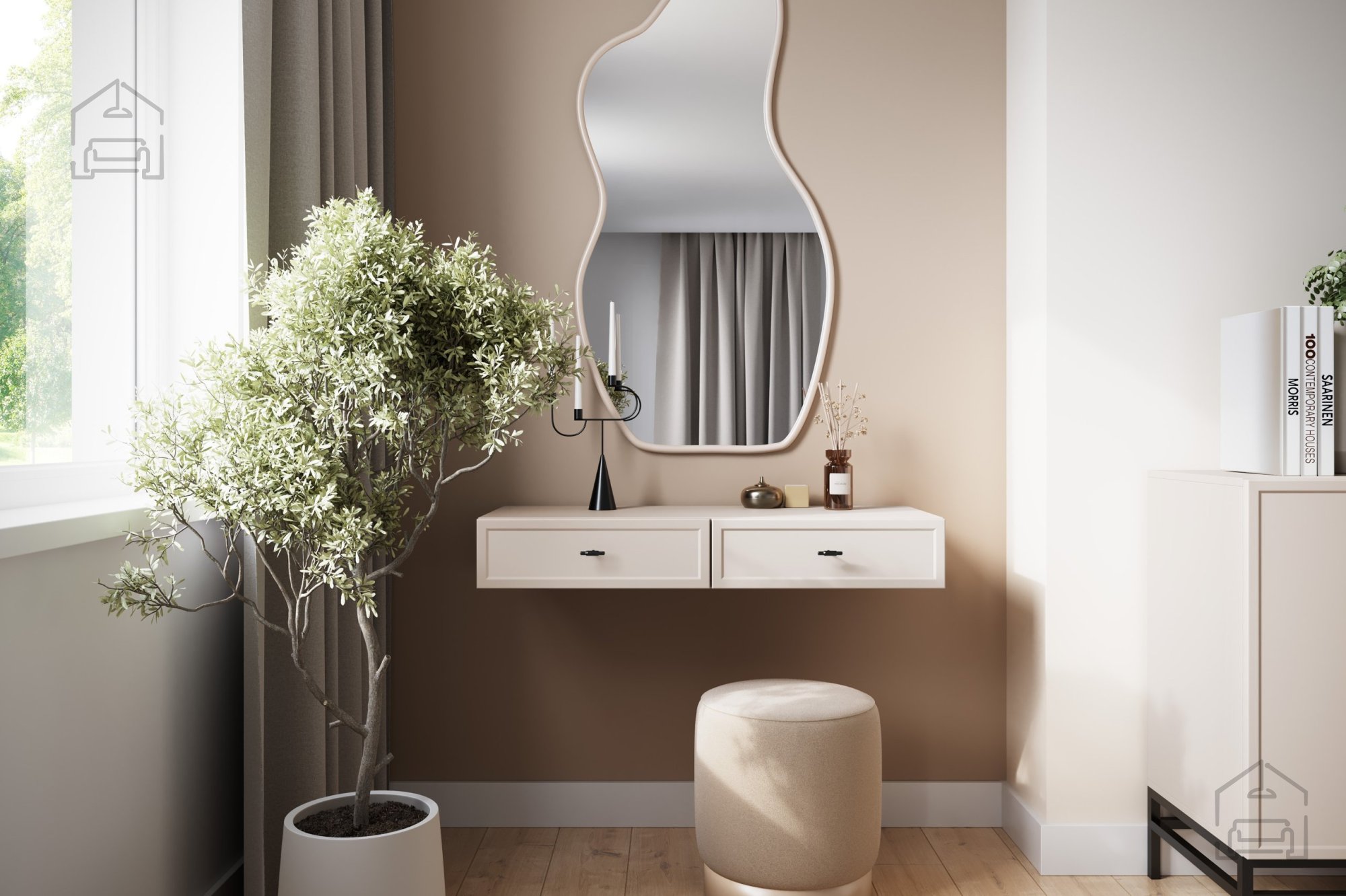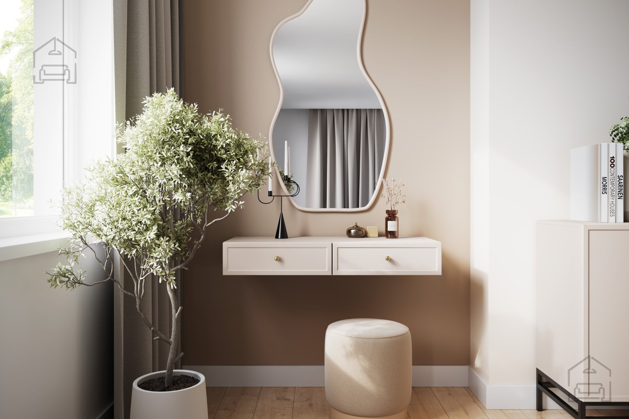 Stenska miza Lorini je vsestranska – deluje kot toaletna mizica, lahko pa jo uporabite tudi kot konzolno polico ali dodatno odlagalno površino. Njena preprosta, a prefinjena oblika se odlično poda v moderne, skandinavske in minimalistične interierje. Zaradi majhne globine je primerna tudi za ozke prostore, kjer je vsak centimeter dragocen.