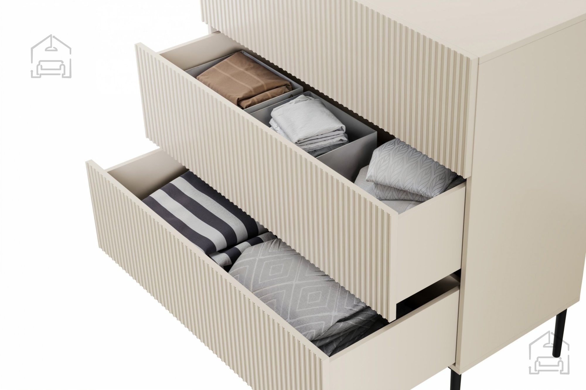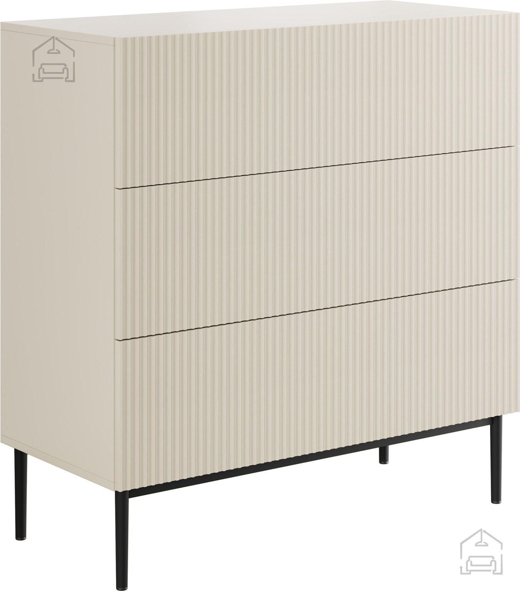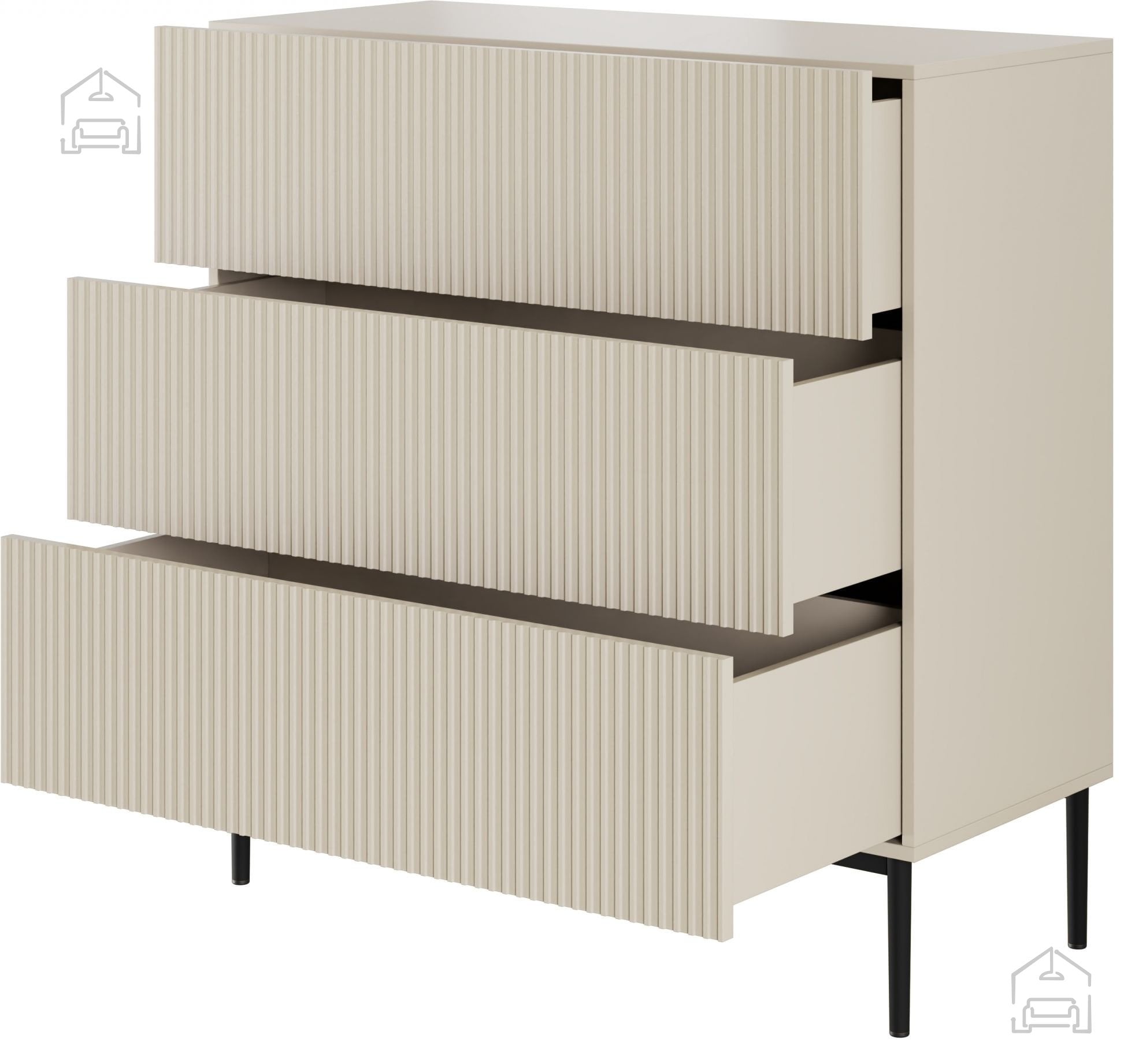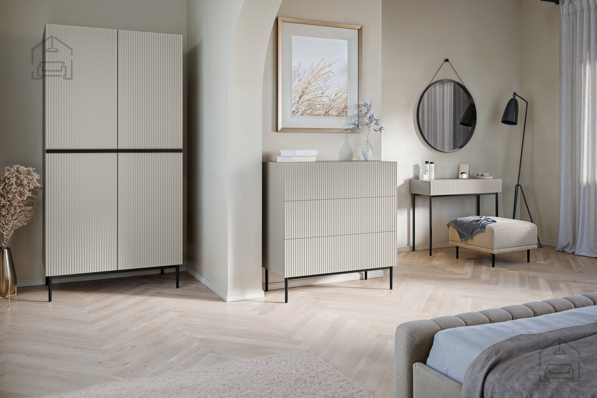 Barva kašmir ustvarja subtilno, a razkošno osnovo, ki jo lahko enostavno kombinirate z različnimi odtenki sten in tal. Frontni del z izrazitim rebrastim vzorcem v vertikalni strukturi dodaja globino in dinamiko. Komoda je na voljo z zlatim ali črnim dekorjem, kar omogoča izbiro med toplejšim ali bolj kontrastnim videzom. Kovinske noge v enakih barvnih izvedbah – črne ali zlate – so prašno barvane, kar zagotavlja obstojnost barve in odpornost proti praskam.