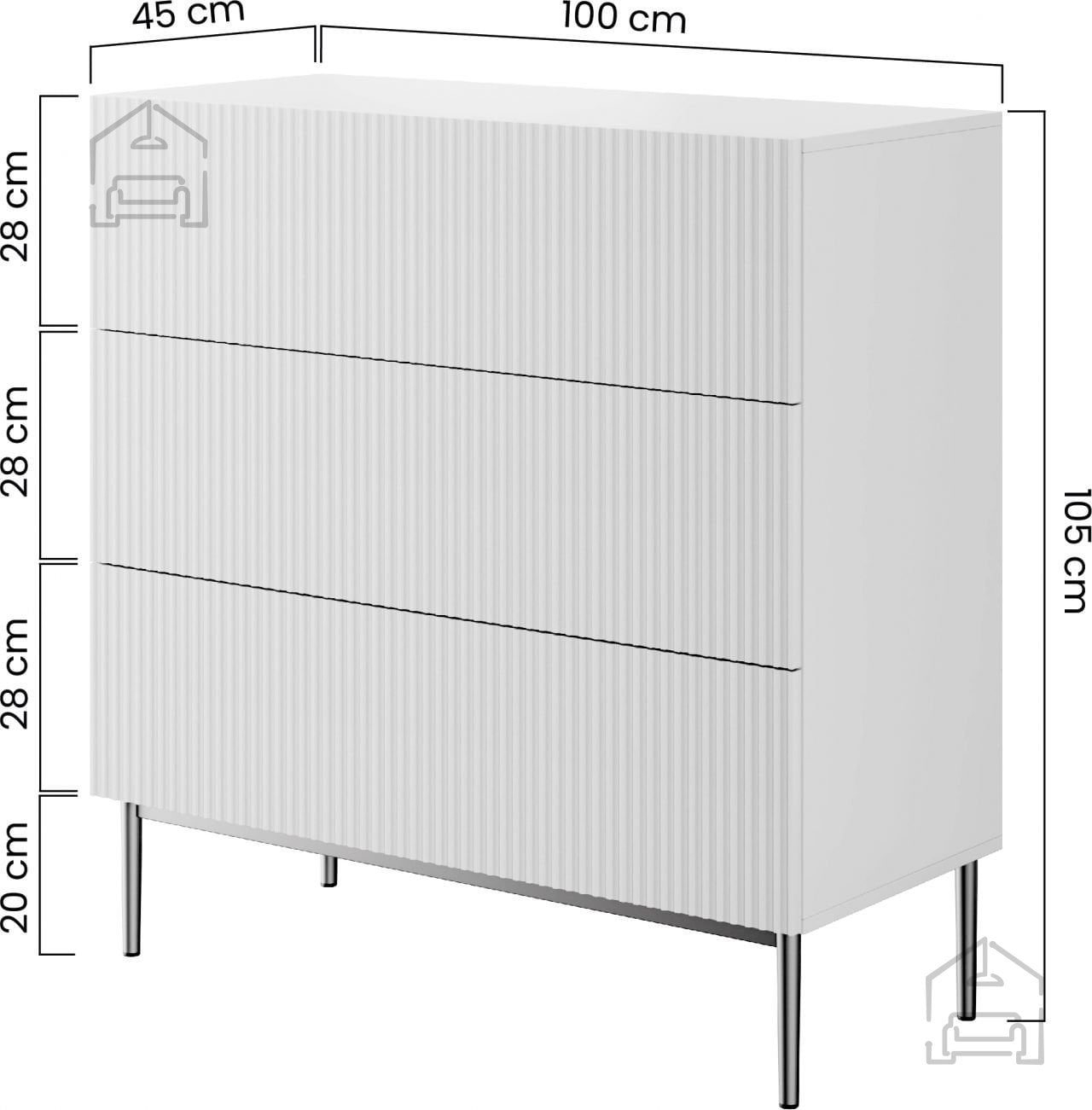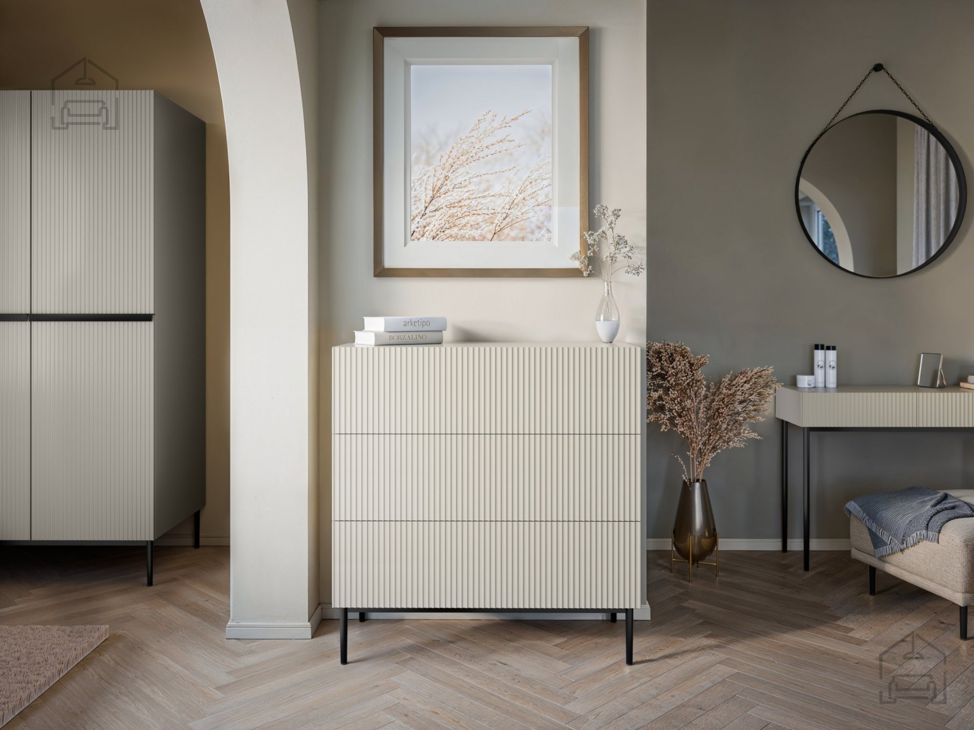 Kašmir ton v kombinaciji z rebrasto teksturo ustvarja občutek miru in prefinjenosti. Komodo lahko umestite v spalnico, predsobo ali dnevni prostor, kjer lahko služi kot shranjevalna enota ali kot elegantna podlaga za dekorativne elemente – vazo, svetilko ali ogledalo. Zaradi svoje višine 105 cm se dobro ujema z drugimi pohištvenimi kosi iz iste serije, hkrati pa je dovolj kompaktna, da ne zavzame preveč prostora.