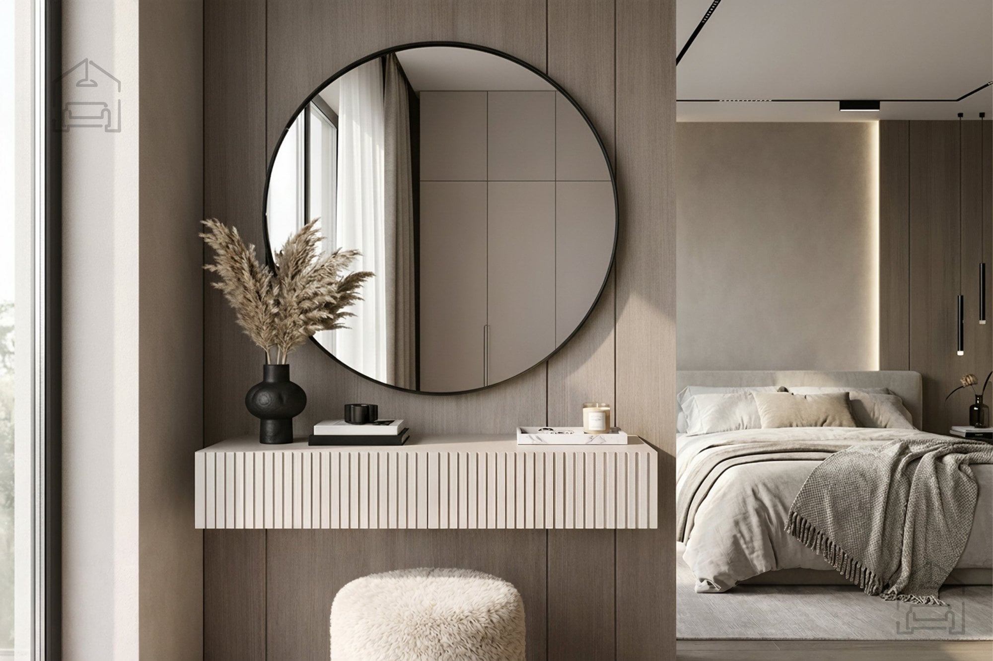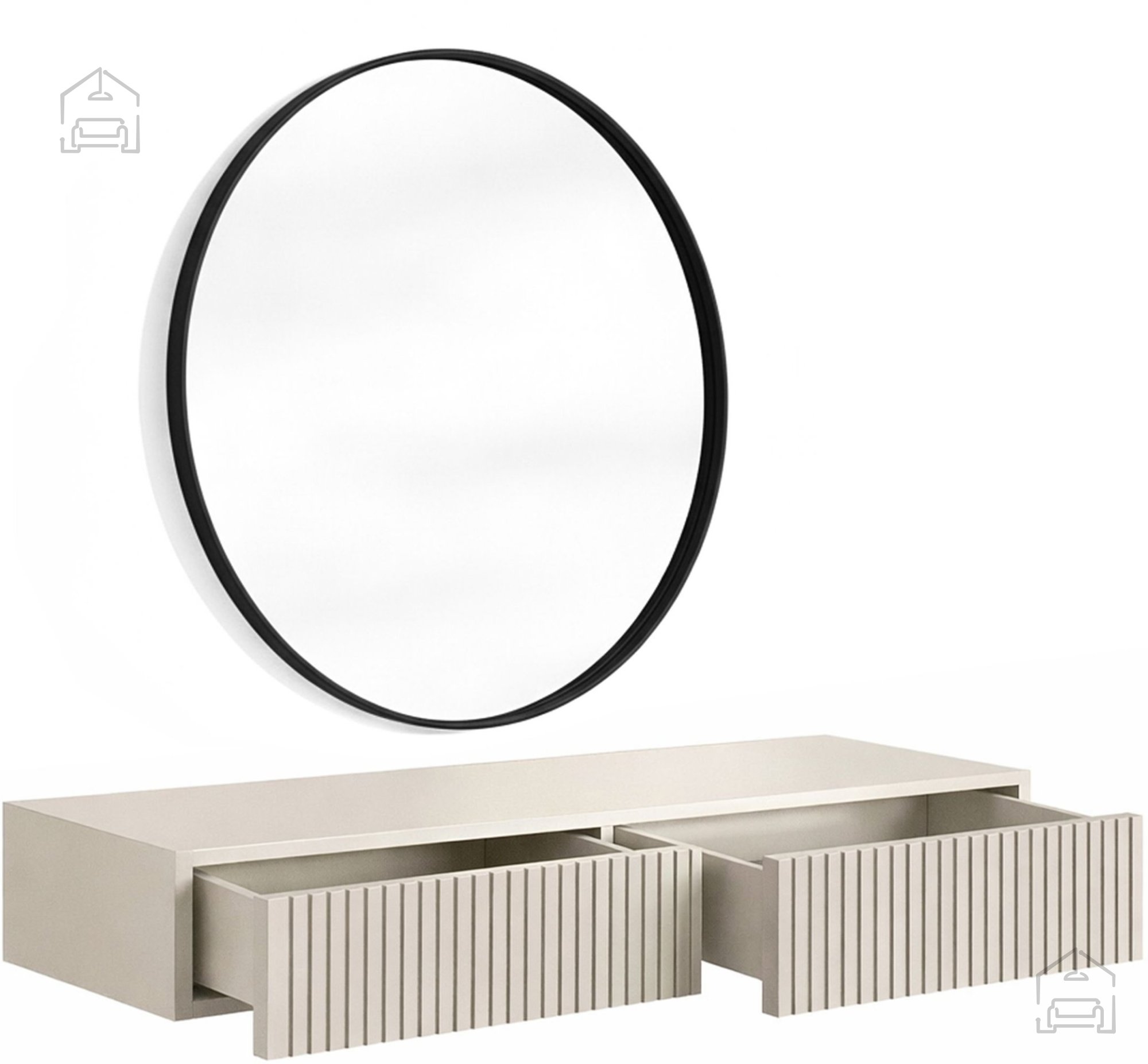 Kombinacija mat površine, rebraste teksture in umirjene barvne palete ustvarja pohištvo, ki se lepo ujema s sodobnimi minimalističnimi, skandinavskimi ali glamur interierji. Zaradi viseče izvedbe se miza vizualno zdi lahkotna, kar prispeva k občutku prostornosti tudi v manjših spalnicah ali garderobah.
