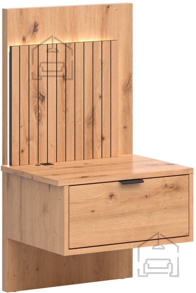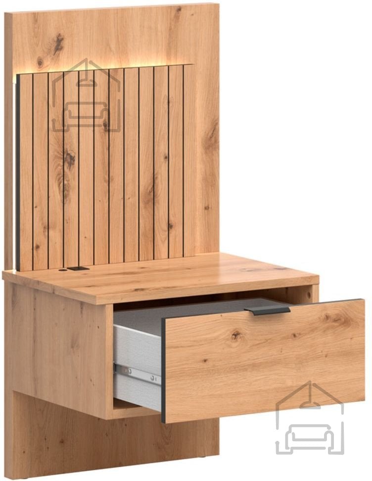 Nočna omarica je izdelana iz iverne plošče debeline 16 mm in HDF plošče 3 mm, kar zagotavlja trdnost, stabilnost in dolgo življenjsko dobo. Površina v barvi artisan hrasta s pristnimi vzorci lesa in vidnimi grčami poskrbi za občutek naravnosti, ki v spalnici ustvarja prijetno in umirjeno vzdušje. Preproste linije in subtilni detajli omogočajo enostavno kombiniranje z drugimi kosi pohištva, hkrati pa dajejo prostoru pridih brezčasne elegance.