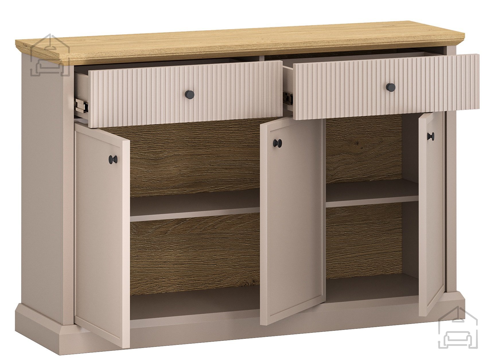 Komoda Idello 3d2s je zasnovana s tremi vrati in dvema prostornima predaloma, kar omogoča fleksibilno organizacijo shranjevanja. Za vrati se skrivajo police za posodo, tekstil ali dokumente, medtem ko sta predala idealna za manjše predmete, kot so serviete, jedilni pribor ali osebni dodatki. Vodila predalov so kovinska s krogličnim mehanizmom, ki zagotavlja gladko in tiho odpiranje ter zapiranje. Standardni kovinski tečaji vrat pa omogočajo zanesljivo uporabo skozi daljše obdobje.